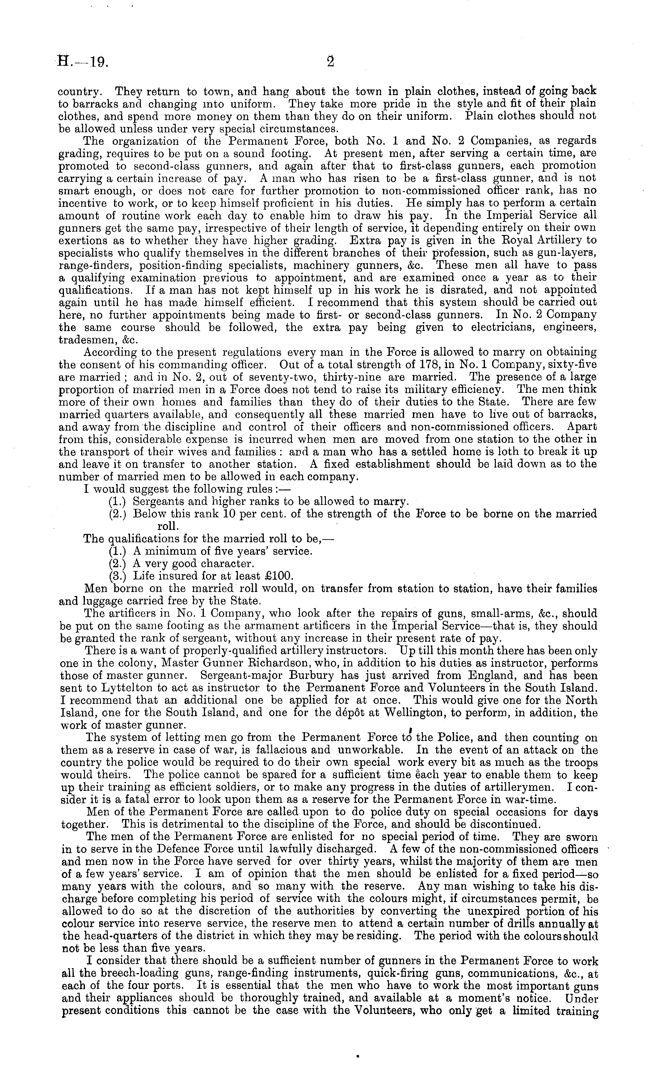 country. They return to town, and hang about the town in plain clothes, instead of going back to barracks and changing into uniform. They take more pride in the style and fit of their plain clothes, and spend more money on them than they do on their uniform. Plain clothes should not be allowed unless under very special circumstances. The organization of the Permanent Force, both No. 1 and No. 2 Companies, as regards grading, requires to be put on a sound footing. At present men, after serving a certain time, are promoted to second-class gunners, and again after that to first-class gunners, each promotion carrying a certain increase of pay. A man who has risen to be a first-class gunner, and is not smart enough, or does not care for further promotion to non-commissioned officer rank, has no incentive to work, or to keep himself proficient in his duties. He simply has to perform a certain amount of routine work each day to enable him to draw his pay. In the Imperial Service all gunners get the same pay, irrespective of their length of service, it depending entirely on their own exertions as to whether they have higher grading. Extra pay is given in the Eoyal Artillery to specialists who qualify themselves in the different branches of their profession, such as gun-layers, range-finders, position-finding specialists, machinery gunners, &c. These men all have to pass a qualifying examination previous to appointment, and are examined once a year as to their qualifications. If a man has not kept himself up in his work he is disrated, and not appointed again until he has made himself efficient. I recommend that this system should be carried out here, no further appointments being made to first- or second-class gunners. In No. 2 Company the same course should be followed, the extra pay being given to electricians, engineers, tradesmen, &c. According to the present regulations every man in the Force is allowed to marry on obtaining the consent of his commanding officer. Out of a total strength of 178, in No. 1 Company, sixty-five are married ; and in No. 2, out of seventy-two, thirty-nine are married. The presence of a large proportion of married men in a Force does not tend to raise its military efficiency. The men think more of their own homes and families than they do of their duties to the State. There are few married quarters available, and consequently all these married men have to live out of barracks, and away from the discipline and control of their officers and non-commissioned officers. Apart from this, considerable expense is incurred when men are moved from one station to the other in the transport of their wives and families : and a man who has a settled home is loth to break it up and leave it on transfer to another station. A fixed establishment should be laid down as to the number of married men to be allowed in each company. I would suggest the following rules: — (1.) Sergeants and higher ranks to be allowed to marry. (2.) Below this rank 10 per cent, of the strength of the Force to be borne on the married roll. The qualifications for the married roll to be, —■ (1.) A minimum of five years' service. (2.) A very good character. (3.) Life insured for at least £100. Men borne on the married roll would, on transfer from station to station, have their families and luggage carried free by the State. The artificers in No. 1 Company, who look after the repairs of guns, small-arms, Ac, should be put on the same footing as the armament artificers in the Imperial Service—that is, they should be granted the rank of sergeant, without any increase in their present rate of pay. There is a want of properly-qualified artillery instructors. Up till this month there has been only one in the colony, Master Gunner Eichardson, who, in addition to his duties as instructor, performs those of master gunner. Sergeant-major Burbury has just arrived from England, and has been sent to Lyttelton to act as instructor to the Permanent Force and Volunteers in the South Island. I recommend that an additional one be applied for at once. This would give one for the North Island, one for the South Island, and one for the depdt at Wellington, to perform, in addition, the work of master gunner. The system of letting men go from the Permanent Force to the Police, and then counting on them as a reserve in case of war, is fallacious and unworkable. In the event of an attack on the country the police would be required to do their own special work every bit as much as the troops would theirs. The police cannot be spared for a sufficient time each year to enable them to keep up their training as efficient soldiers, or to make any progress in the duties of artillerymen. I consider it is a fatal error to look upon them as a reserve for the Permanent Force in war-time. Men of the Permanent Force are called upon to do police duty on special occasions for days together. This is detrimental to the discipline of the Force, and should be discontinued. The men of the Permanent Force are enlisted for no special period of time. They are sworn in to serve in the Defence Force until lawfully discharged. A few of the non-commissioned officers and men now in the Force have served for over thirty years, whilst the majority of them are men of a few years' service. I am of opinion that the men should be enlisted for a fixed period—so many years with the colours, and so many with the reserve. Any man wishing to take his discharge before completing his period of service with the colours might, if circumstances permit, be allowed to do so at the discretion of the authorities by converting the unexpired portion of his colour service into reserve service, the reserve men to attend a certain number of drills annually at the head-quarters of the district in which they may be residing. The period with the colours should not be less than five years. I consider that there should be a sufficient number of gunners in the Permanent Force to wo