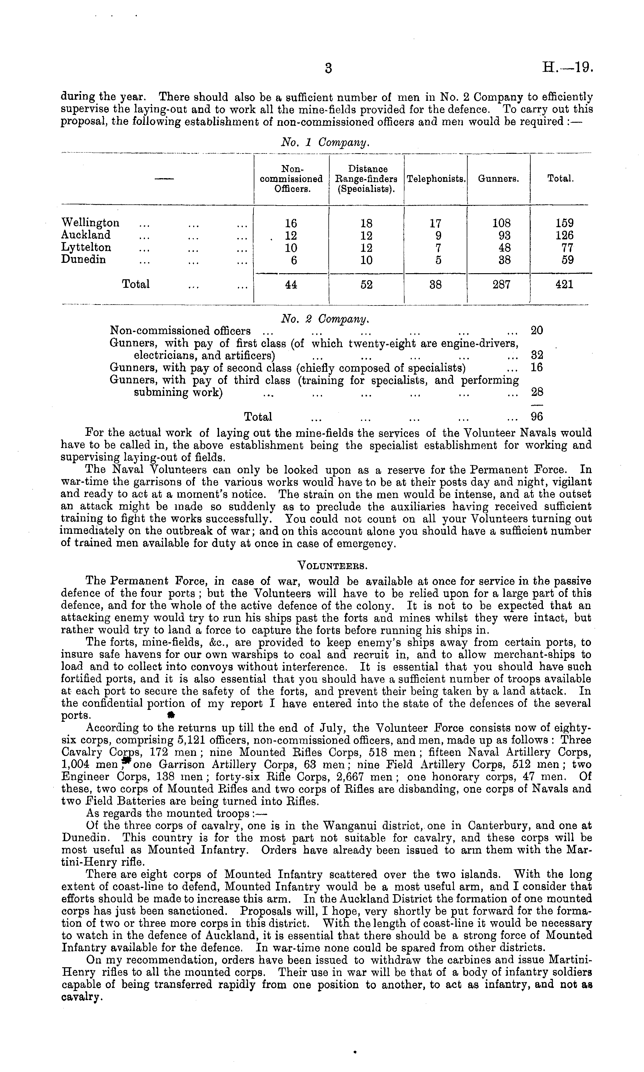 No. 2 Company. Non-commissioned officers ... ... ... ... ... ... 20 Gunners, with pay of first class (of which twenty-eight are engine-drivers, electricians, and artificers) ... ... ... ... ... 32 Gunners, with pay of second class (chiefly composed of specialists) ... 16 Gunners, with pay of third class (training for specialists, and performing submining work) ... ... ... ... ... ... 28 Total ... ... ... ... ... 96 For the actual work of laying out the mine-fields the services of the Volunteer Navals would have to be called in, the above establishment being the specialist establishment for working and supervising laying-out of fields. The Naval Volunteers can only be looked upon as a reserve for the Permanent Force. In war-time the garrisons of the various works would have to be at their posts day and night, vigilant and ready to act at a moment's notice. The strain on the men would be intense, and at the outset an attack might be made so suddenly as to preclude the auxiliaries having received sufficient training to fight the works successfully. You could not count on all your Volunteers turning out immediately on the outbreak of war; and on this account alone you should have a sufficient number of trained men available for duty at once in case of emergency. Volunteers. The Permanent Force, in case of war, would be available at once for service in the passive defence of the four ports ; but the Volunteers will have to be relied upon for a large part of this defence, and for the whole of the active defence of the colony. It is not to be expected that an attacking enemy would try to run his ships past the forts and mines whilst they were intact, but rather would try to land a force to capture the forts before running his ships in. The forts, mine-fields, &c, are provided to keep enemy's ships away from certain ports, to insure safe havens for our own warships to coal and recruit in, and to allow merchant-ships to load and to collect into convoys without interference. It is essential that you should have such fortified ports, and it is also essential that you should have a sufficient number of troops available at each port to secure the safety of the forts, and prevent their being taken by a land attack. In the confidential portion of my report I have entered into the state of the defences of the several ports. # According to the returns up till the end of July, the Volunteer Force consists now of eightysix corps, comprising 5,121 officers, non-commissioned officers, and men, made up as follows : Three Cavalry Corps, 172 men ; nine Mounted Eifles Corps, 518 men ; fifteen Naval Artillery Corps, 1,004 men, one Garrison Artillery Corps, 63 men; nine Field Artillery Corps, 512 men; two Engineer Corps, 138 men ; forty-six Eifle Corps, 2,667 men ; one honorary corps, 47 men. Of these, two corps of Mounted Eifles and two corps of Eifles are disbanding, one corps of Navals and two Field Batteries are being turned into Eifles. As regards the mounted troops : — Of the three corps of cavalry, one is in the Wanganui district, one in Canterbury, and one at Dunedin. This country is for the most part not suitable for cavalry, and these corps will be most useful as Mounted Infantry. Orders have already been issued to arm them with the Mar-tini-Henry rifle. There are eight corps of Mounted Infantry scattered over the two islands. With the long extent of coast-line to defend, Mounted Infantry would be a most useful arm, and I consider that efforts should be made to increase this arm. In the Auckland District the formation of one mounted corps has just been sanctioned. Proposals will, I hope, very shortly be put forward for the formation of two or three more corps in this district. With the length of coast-line it would be necessary to watch in the defence of Auckland, it is essential that there should be a strong force of Mounted Infantry available for the defence. In war-time none could be spared from other districts. On my recommendation, orders have been issued to withdraw the carbines and issue MartiniHenry rifles to all the mounted corps. Their use in war will be that of a body of infantry soldiers capable of being transferred rapidly from one position to another, to act as infantry, and not as cavalry.