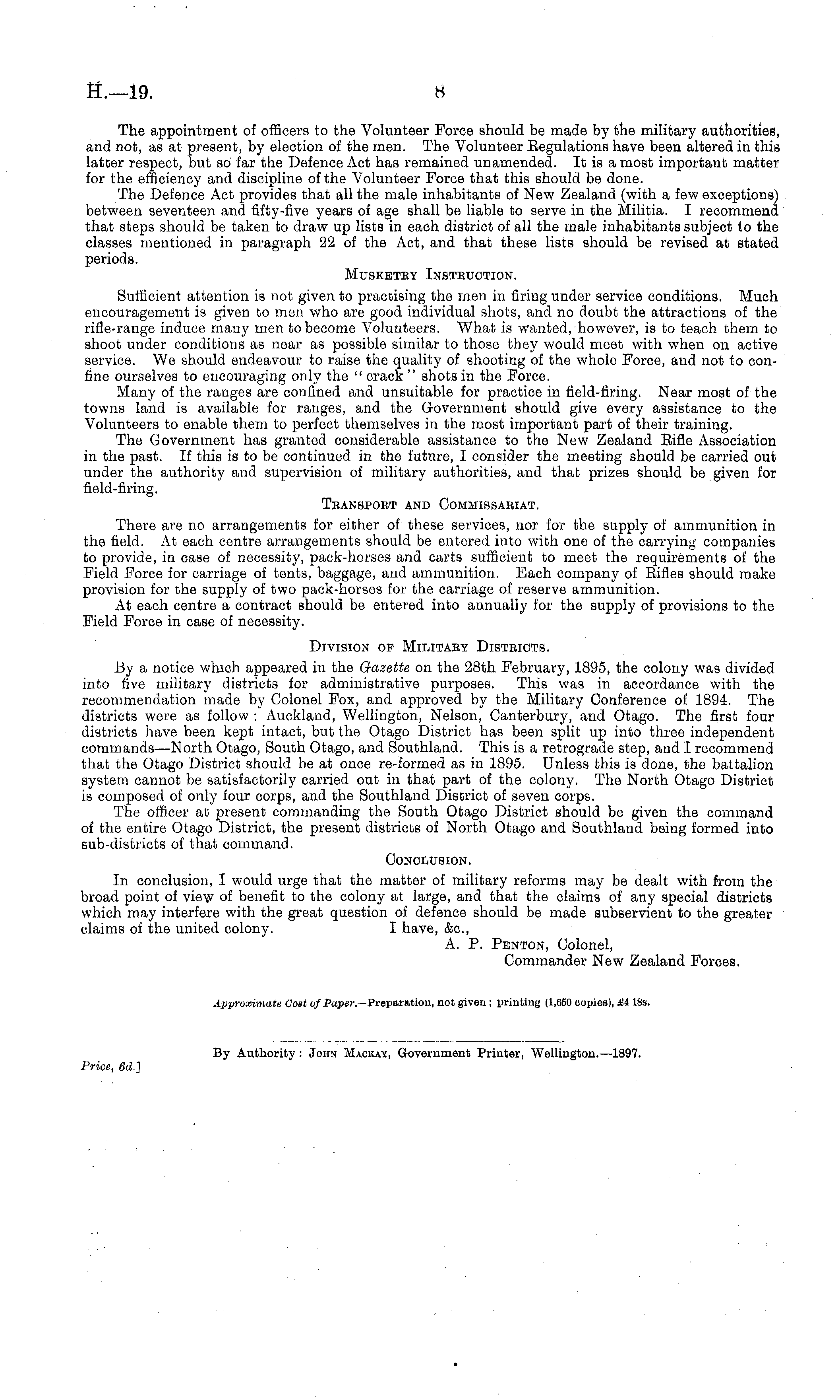 The appointment of officers to the Volunteer Force should be made by the military authorities, and not, as at present, by election of the men. The Volunteer Eegulations have been altered in this latter respect, but so far the Defence Act has remained unamended. It is a most important matter for the efficiency and discipline of the Volunteer Force that this should be done. The Defence Act provides that all the male inhabitants of New Zealand (with a few exceptions) between seventeen and fifty-five years of age shall be liable to serve in the Militia. I recommend that steps should be taken to draw up lists in each district of all the male inhabitants subject to the classes mentioned in paragraph 22 of the Act, and that these lists should be revised at stated periods. Musketry Instruction. Sufficient attention is not given to practising the men in firing under service conditions. Much encouragement is given to men who are good individual shots, and no doubt the attractions of the rifle-range induce many men to become Volunteers. What is wanted, however, is to teach them to shoot under conditions as near as possible similar to those they would meet with when on active service. We should endeavour to raise the quality of shooting of the whole Force, and not to confine ourselves to encouraging only the " crack " shots in the Force. Many of the ranges are confined and unsuitable for practice in field-firing. Near most of the towns land is available for ranges, and the Government should give every assistance to the Volunteers to enable them to perfect themselves in the most important part of their training. The Government has granted considerable assistance to the New Zealand Eifle Association in the past. If this is to be continued in the future, I consider the meeting should be carried out under the authority and supervision of military authorities, and that prizes should be given for field-firing. Transport and Commissariat. There are no arrangements for either of these services, nor for the supply of ammunition in the field. At each centre arrangements should be entered into with one of the carrying companies to provide, in case of necessity, pack-horses and carts sufficient to meet the requirements of the Field Force for carriage of tents, baggage, and ammunition. Each company of Eifles should make provision for the supply of two pack-horses for the carriage of reserve ammunition. At each centre a contract should be entered into annually for the supply of provisions to the Field Force in case of necessity. Division of Military Districts. By a notice which appeared in the Gazette on the 28th February, 1895, the colony was divided into five military districts for administrative purposes. This was in accordance with the recommendation made by Colonel Fox, and approved by the Military Conference of 1894. The districts were as follow : Auckland, Wellington, Nelson, Canterbury, and Otago. The first four districts have been kept intact, but the Otago District has been split up into three independent commands—North Otago, South. Otago, and Southland. This is a retrograde step, and I recommend that the Otago District should be at once re-formed as in 1895. Unless this is done, the battalion system cannot be satisfactorily carried out in that part of the colony. The North Otago District is composed of only four corps, and tho Southland District of seven corps. The officer at present commanding the South Otago District should be given the command of the entire Otago District, the present districts of North Otago and Southland being formed into sub-districts of that command. Conclusion. In conclusion, I would urge that the matter of military reforms may be dealt with from the broad point of view of benefit to the colony at large, and that the claims of any special districts which may interfere with the great question of defence should be made subservient to the greater claims of the united colony. I have, &c, A. P. Penton, Colonel, Commander New Zealand Forces. Approximate Cost of Paper.— Preparation, not given ; printing (1,650 copies), M 18s.
