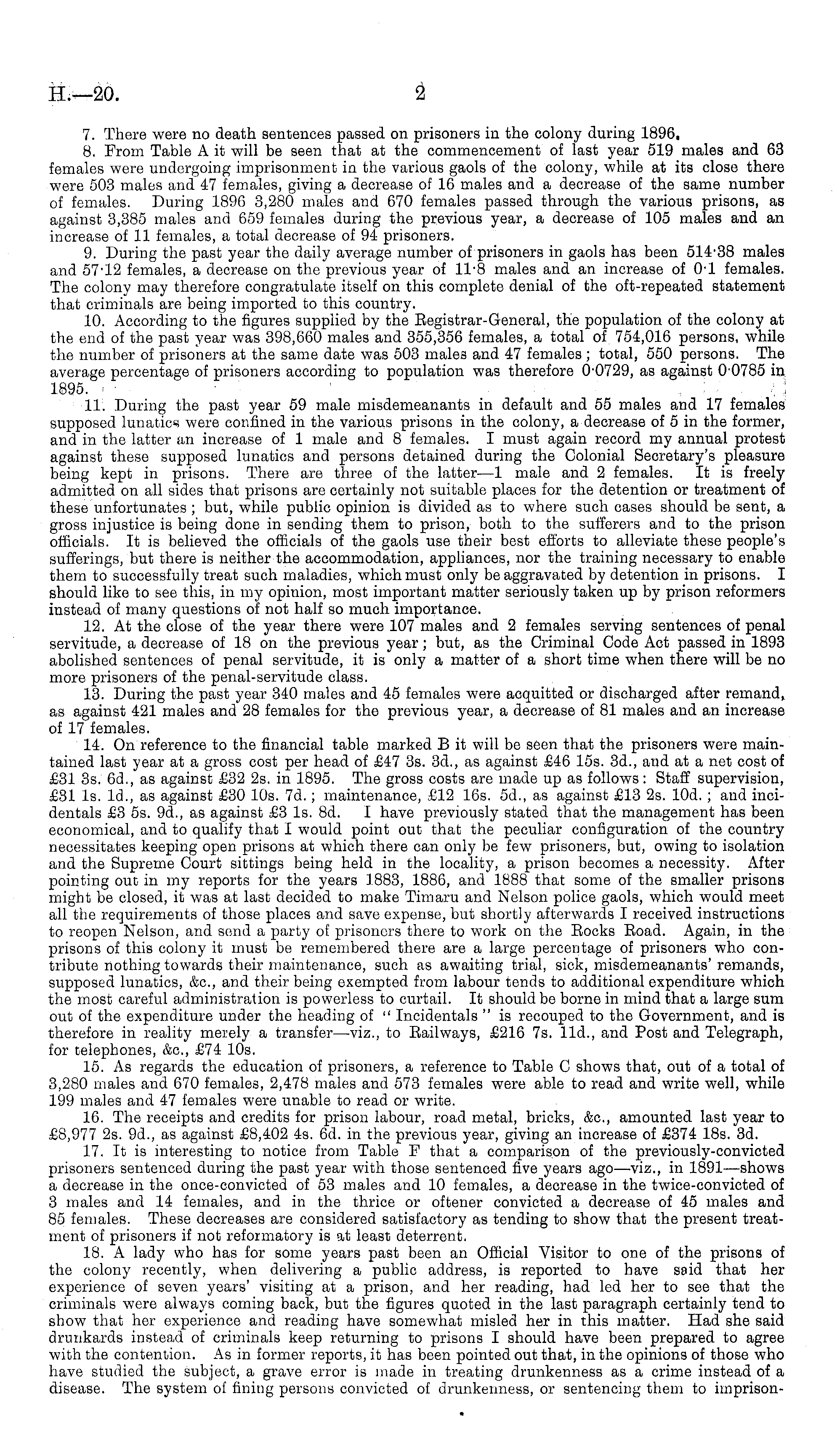7. There were no death sentences passed on prisoners in the colony during 1896, 8. From Table A it will be seen that at the commencement of last year 519 males and 63 females were undergoing imprisonment in the various gaols of the colony, while at its close there were 503 males and 47 females, giving a decrease of 16 males and a decrease of the same number of females. During 1896 3,280 males and 670 females passed through the various prisons, as against 3,385 males and 659 females during the previous year, a decrease of 105 males and an increase of 11 females, a total decrease of 94 prisoners. 9. During the past year the daily average number of prisoners in gaols has been 514-38 males and 5712 females, a decrease on the previous year of 11-8 males and an increase of 0-1 females. The colony may therefore congratulate itself on this complete denial of the oft-repeated statement that criminals are being imported to this country. 10. According to the figures supplied by the Registrar-General, the population of the colony at the end of the past year was 398,660 males and 355,356 females, a total of 754,016 persons, while the number of prisoners at the same date was 503 males and 47 females ; total, 550 persons. The average percentage of prisoners according to population was therefore 0-0729, as against 0-0785 in 1895. < ■ 11. During the past year 59 male misdemeanants in default and 55 males and 17 females supposed lunatics were confined in the various prisons in the colony, a decrease of 5 in the former, and in the latter art increase of 1 male and 8 females. I must again record my annual protest against these supposed lunatics and persons detained during the Colonial Secretary's pleasure being kept in prisons. There are three of the latter—l male and 2 females. It is freely admitted on all sides that prisons are certainly not suitable places for the detention or treatment of these unfortunates ; but, while public opinion is divided as to where such cases should be sent, a gross injustice is being done in sending them to prison, both to the sufferers and to the prison officials. It is believed the officials of the gaols use their best efforts to alleviate these people's sufferings, but there is neither the accommodation, appliances, nor the training necessary to enable them to successfully treat such maladies, which must only be aggravated by detention in prisons. I should like to see this, in my opinion, most important matter seriously taken up by prison reformers instead of many questions of not half so much importance. 12. At the close of the year there were 107 males and 2 females serving sentences of penal servitude, a decrease of 18 on the previous year; but, as the Criminal Code Act passed in 1893 abolished sentences of penal servitude, it is only a matter of a short time when there will be no more prisoners of the penal-servitude class. 13. During the past year 340 males and 45 females were acquitted or discharged after remand, as against 421 males and 28 females for the previous year, a decrease of 81 males and an increase of 17 females. 14. On reference to the financial table marked B it will be seen that the prisoners were maintained last year at a gross cost per head of £47 3s. 3d., as against £46 15s. 3d., and at a net cost of £31 3s. 6d., as against £32 2s. in 1895. The gross costs are made up as follows: Staff supervision, £31 Is. Id., as against £30 10s. 7d.; maintenance, £12 16s. 5d., as against £13 2s. 10d. ; and incidentals £3 ss. 9d., as against £3 Is. Bd. I have previously stated that the management has been economical, and to qualify that I would point out that the peculiar configuration of the country necessitates keeping open prisons at which there can only be few prisoners, but, owing to isolation and the Supreme Court sittings being held in the locality, a prison becomes a necessity. After pointing out in my reports for the years 1883, 1886, and 1888 that some of the smaller prisons might be closed, it was at last decided to make Timaru and Nelson police gaols, which would meet all the requirements of those places and save expense, but shortly afterwards I received instructions to reopen Nelson, and send a party of prisoners there to work on the Rocks Road. Again, in the prisons of this colony it must bo remembered there are a large percentage of prisoners who contribute nothing towards their maintenance, such as awaiting trial, sick, misdemeanants'remands, supposed lunatics, &c, and their being exempted from labour tends to additional expenditure which the most careful administration is powerless to curtail. It should be borne in mind that a large sum out of the expenditure under the heading of " Incidentals " is recouped to the Government, and is therefore in reality merely a transfer—viz., to Eailways, £216 7s. lid., and Post and Telegraph, for telephones, &c, £74 10s. 15. As regards the education of prisoners, a reference to Table C shows that, out of a total of 3,280 males and 670 females, 2,478 males and 573 females were able to read and write well, while 199 males and 47 females were unable to read or write. 16. The receipts and credits for prison labour, road metal, bricks, &c, amounted last year to £8,977 2s. 9d., as against £8,402 4s. 6d. in the previous year, giving an increase of £374 18s. 3d. 17. It is interesting to notice from Table F that a comparison of the previously-convicted prisoners sentenced during the past year with those sentenced five years ago —viz., in 1891—shows a decrease in the once-convicted of 53 males and 10 females, a decrease in the twice-convicted of 3 males and 14 females, and in the thrice or oftener convicted a decrease of 45 males and 85 females. These decreases are considered satisfactory as tending to show that the present treatment of prisoners if not reformatory is at least deterrent. 18. A lady who has for some years past been an Official Visitor to one of the prisons of the colony recently, whe