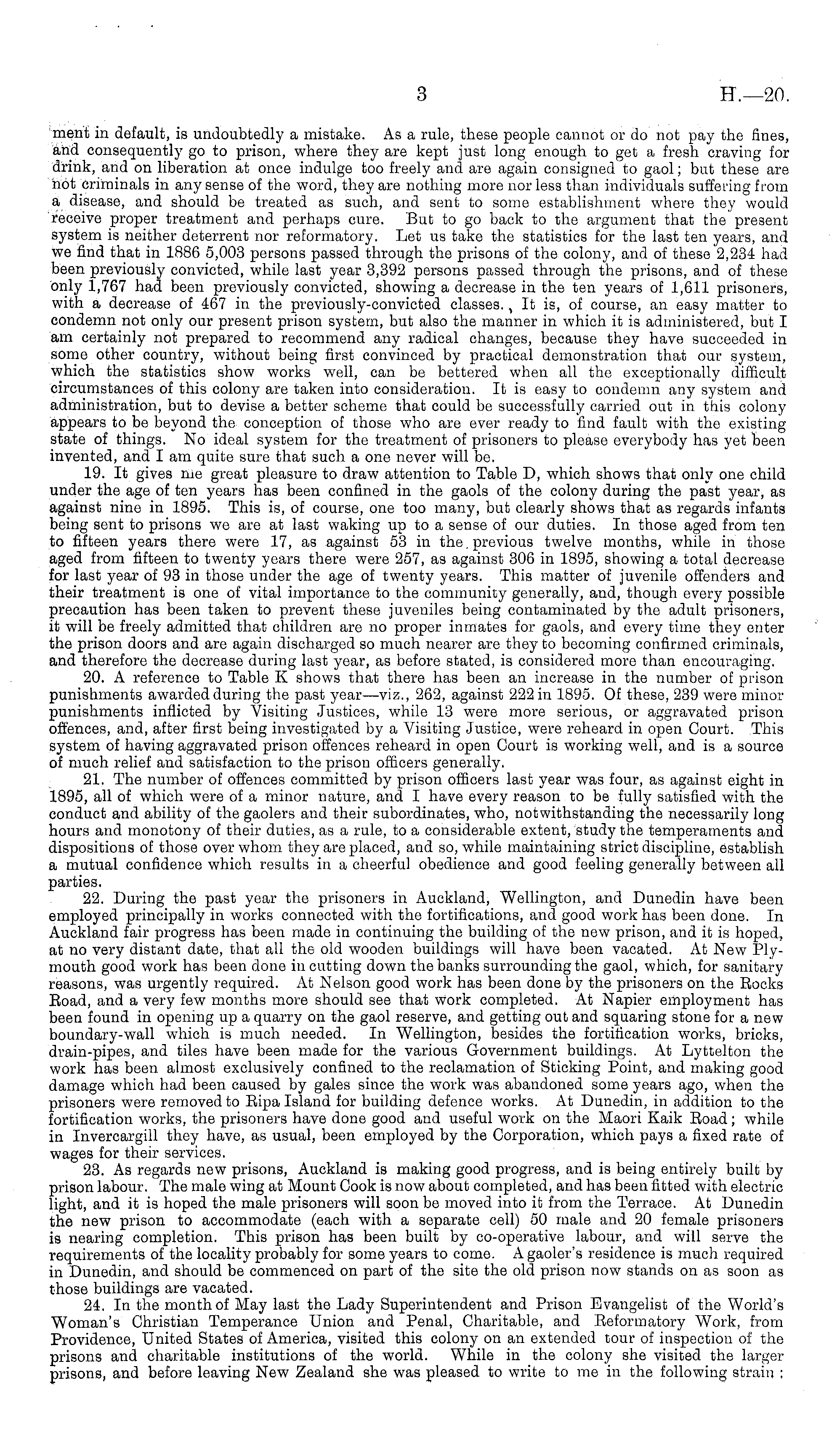 "merit in default, is undoubtedly a mistake. As a rule, these people cannot or do not pay the fineß, and consequently go to prison, where they are kept just long enough to get a fresh craving for drink, and on liberation at once indulge too freely and are again consigned to gaol; but these are not criminals in any sense of the word, they are nothing more nor less than individuals suffering from a disease, and should be treated as such, and sent to some establishment where they would receive proper treatment and perhaps cure. But to go back to the argument that the present system is neither deterrent nor reformatory. Let us take the statistics for the last ten years, and we find that in 1886 5,003 persons passed through the prisons of the colony, and of these 2,234 had been previously convicted, while last year 3,392 persons passed through the prisons, and of these only 1,767 had been previously convicted, showing a decrease in the ten years of 1,611 prisoners, with a decrease of 467 in the previously-convicted classes. : It is, of course, an easy matter to condemn not only our present prison system, but also the manner in which it is administered, but I am certainly not prepared to recommend any radical changes, because they have succeeded in some other country, without being first convinced by practical demonstration that our system, which the statistics show works well, can be bettered when all the exceptionally difficult circumstances of this colony are taken into consideration. It is easy to condemn any system and administration, but to devise a better scheme that could be successfully carried out in this colony appears to bo beyond the conception of those who are ever ready to find fault with the existing state of things. No ideal system for the treatment of prisoners to please everybody has yet been invented, and I am quite sure that such a one never will be. 19. It gives me great pleasure to draw attention to Table D, which shows that only one child under the age of ten years has been confined in the gaols of the colony during the past year, as against nine in 1895. This is, of course, one too many, but clearly shows that as regards infants being sent to prisons we are at last waking up to a sense of our duties. In those aged from ton to fifteen years there were 17, as against 53 in the. previous twelve months, while in those aged from fifteen to twenty years there were 257, as against 306 in 1895, showing a total decrease for last year of 93 in those under the age of twenty years. This matter of juvenile offenders and their treatment is one of vital importance to the community generally, and, though every possible precaution has been taken to prevent these juveniles being contaminated by the adult prisoners, it will be freely admitted that children are no proper inmates for gaols, and every time they enter the prison doors and are again discharged so much nearer are they to becoming confirmed criminals, and therefore the decrease during last year, as before stated, is considered more than encouraging. 20. A reference to Table X shows that there has been an increase in the number of prison punishments awarded during the past year—viz., 262, against 222 in 1895. Of these, 239 were minor punishments inflicted by Visiting Justices, while 13 were more serious, or aggravated prison offences, and, after first being investigated by a Visiting Justice, were reheard in open Court. This system of having aggravated prison offences reheard in open Court is working well, and is a source of much relief and satisfaction to the prison officers generally. 21. The number of offences committed by prison officers last year was four, as against eight in 1895, all of which were of a minor nature, and I have every reason to be fully satisfied with the conduct and ability of the gaolers and their subordinates, who, notwithstanding the necessarily long hours and monotony of their duties, as a rule, to a considerable extent, study the temperaments and dispositions of those over whom they are placed, and so, while maintaining strict discipline, establish a mutual confidence which results in a cheerful obedience and good feeling generally between all parties. 22. During the past year the prisoners in Auckland, Wellington, and Dunedin have been employed principally in works connected with the fortifications, and good work has been done. In Auckland fair progress has been made in continuing the building of the new prison, and it is hoped,, at no very distant date, that all the old wooden buildings will have been vacated. At New Plymouth good work has been done in cutting down the banks surrounding the gaol, which, for sanitary reasons, was urgently required. At Nelson good work has been done by the prisoners on the Rocks Road, and a very few months more should see that work completed. At Napier employment has been found in opening up a quarry on the gaol reserve, atid getting out and squaring stone for a new boundary-wall which is much needed. In Wellington, besides the fortification works, bricks, drain-pipes, and tiles have been made for the various Government buildings. At Lyttelton the work has been almost exclusively confined to the reclamation of Sticking Point, and making good damage which had been caused by gales since the work was abandoned some years ago, when the prisoners were removed to Ripa Island for building defence works. At Dunedin, in addition to the fortification works, the prisoners have done good and useful work on the Maori Kaik Road; while in Invercargill they have, as usual, been employed by the Corporation, which pays a fixed rate of wages for their services. 23. As regards new prisons, Auckland is making good progress, and is being entirely built by prison labour. The male wing at Mount Cook is now about completed, and has been fitted with electric light, and it is hoped the male prisoners will soon be moved into it from the Terrace. At Dunedin the new prison to accommodate (each 