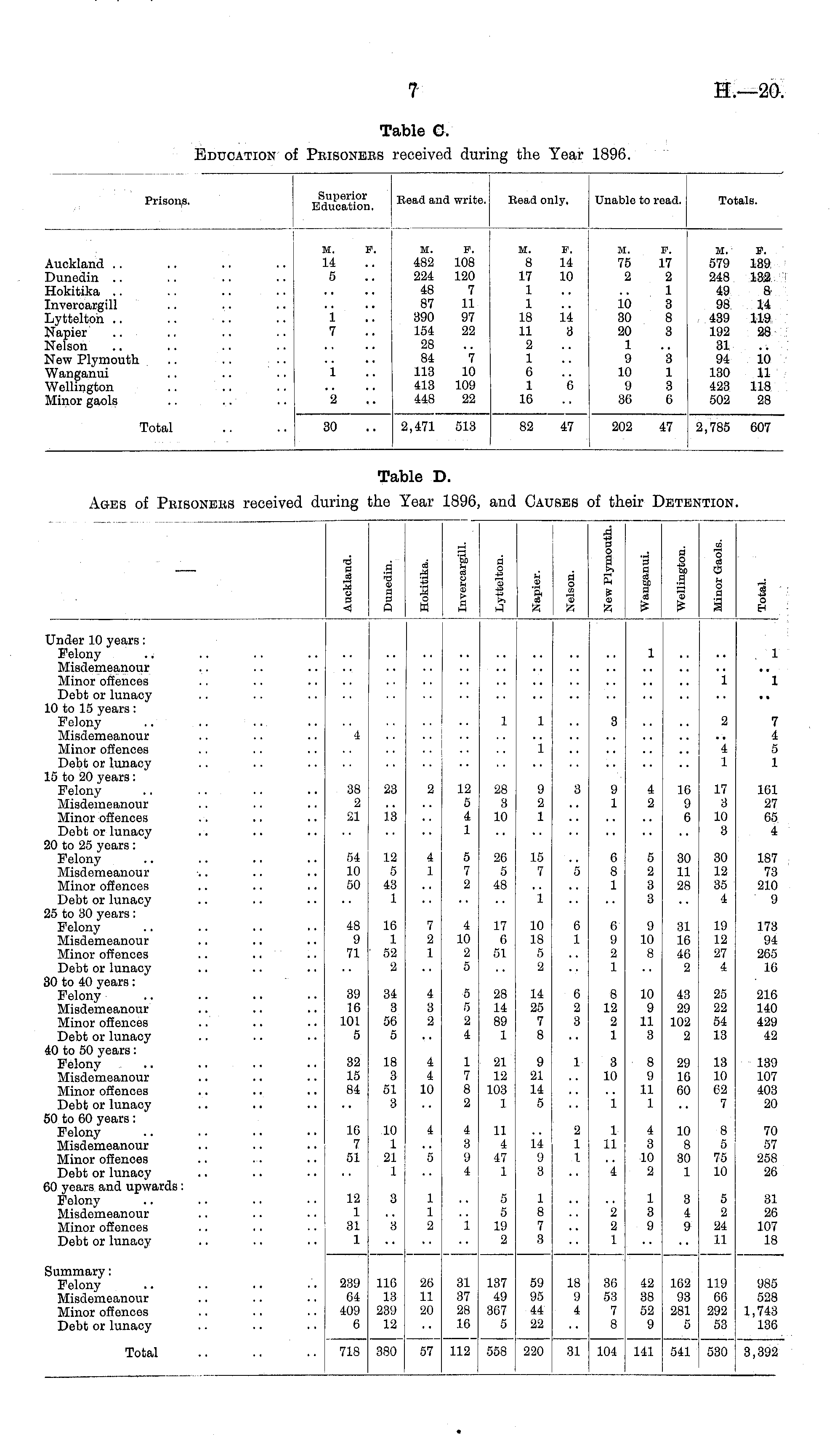 Prisons. Superior Education. Head and write. Head only. Unable to read. Totals. Auckland .. Dunedin .. Hokitika .. Inveroargill Lyttelton .. Napior Nelson New Plymouth Wanganui Wellington Minor gaols l . M. 14 5 1 7 F. M. 482 224 48 87 390 154 28 84 113 413 448 F. 108 120 7 11 97 22 *7 10 109 22 M. 8 17 1 1 18 11 2 1 6 1 16 F. 14 10 14 3 6 M. 75 2 10 30 20 1 9 10 9 36 F. 17 2 1 3 8 3 *8 1 8 6 M. 579 248 49 98 439 192 31 94 130 423 502 F. 139 132 8 14 119 28 io ii 118 28 1 '2 Total 30 2,471 513 82 47 202 47 2,785 607