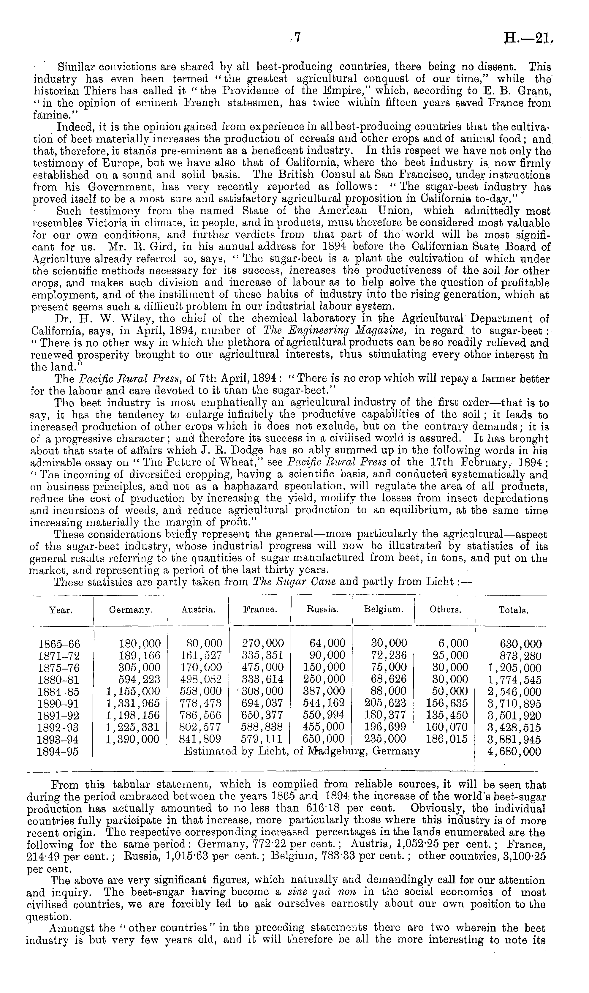 Similar convictions are shared by all beet-producing countries, there being no dissent. This industry has even been termed " the greatest agricultural conquest of our time," while the historian Thiers has called it "the Providence of the Empire," which, according to E. B. Grant, "in the opinion of eminent French statesmen, has twice within fifteen years saved France from famine." Indeed, it is the opinion gained from experience in all beet-producing countries that the cultivation of beet materially increases the production of cereals and other crops and of animal food; and that, therefore, it stands pre-eminent as a beneficent industry. In this respect we have not only the testimony of Europe, but we have also that of California, where the beet industry is now firmly established on a sound and solid basis. The British Consul at San Francisco, under instructions from his Government, has very recently reported as follows: " The sugar-beet industry has proved itself to be a most sure and satisfactory agricultural proposition in California to-day." Such testimony from the named State of the American Union, which admittedly most resembles Victoria in climate, in people, and in products, must therefore be considered most valuable for our own conditions, and further verdicts from that part of the world will be most significant for us. Mr. B. Gird, in his annual address for 1894 before the Californian State Board of Agriculture already referred to, says, " The sugar-beet is a plant the cultivation of which under the scientific methods necessary for its success, increases the productiveness of the soil for other crops, and makes such division and increase of labour as to help solve the question of profitable employment, and of the installment of these habits of industry into the rising generation, which at present seems such a difficult problem in our industrial labour system. Dr. H. W. Wiley, the chief of the chemical laboratory in the Agricultural Department of California, says, in April, 1894, number of The Engineering Magazine, in regard to sugar-beet: " There is no other way in which the plethora of agricultural products can be so readily relieved and renewed prosperity brought to our agricultural interests, thus stimulating every other interest in the land." The Pacific Bural Press, of 7th April, 1894 : " There is no crop which will repay a farmer better for the labour and care devoted to it than the sugar-beet." The beet industry is most emphatically an agricultural industry of the first order—that is to say, it has the tendency to enlarge infinitely the productive capabilities of the soil ; it leads to increased production of other crops which it does not exclude, but on the contrary demands; it is of a progressive character; and therefore its success in a civilised world is assured. It has brought about that state of affairs which J. E. Dodge has so ably summed up in the following words in his admirable essay on " The Future of Wheat," see Pacific Rural Press of the 17th February, 1894 : " The incoming of diversified cropping, having a scientific basis, and conducted systematically and on business principles, and not as a haphazard speculation, will regulate the area of all products, reduce the cost of production by increasing the yield, modify the losses from insect depredations and incursions of weeds, and reduce agricultural production to an equilibrium, at the same time increasing materially the margin of profit." These considerations briefly represent the general—more particularly the agricultural—aspect of the sugar-beet industry, whose industrial progress will now be illustrated by statistics of its general results referring to the quantities of sugar manufactured from beet, in tons, and put on the market, and representing a period of the last thirty years. These statistics are partly taken from The Stigar Gane and partly from Licht : —