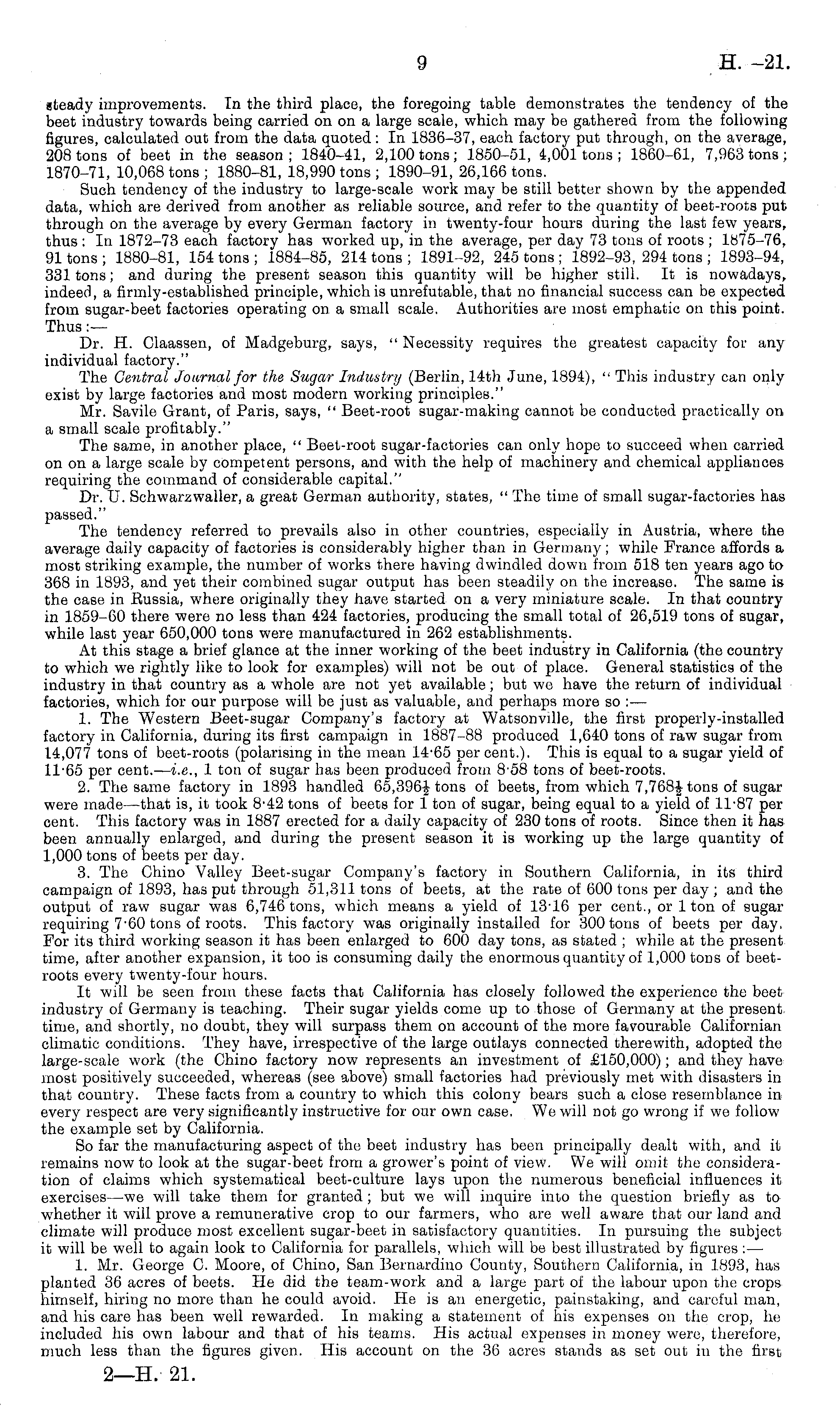 steady improvements. In the third place, the foregoing table demonstrates the tendency of the beet industry towards being carried on on a large scale, which may be gathered from the following figures, calculated out from the data quoted: In 1836-37, each factory put through, on the average, 208 tons of beet in the season; 1840-41, 2,100 tons; 1850-51, 4,001 tons ; 1860-61, 7,963 tons; 1870-71, 10,068 tons; 1880-81, 18,990 tons ; 1890-91, 26,166 tons. Such tendency of the industry to large-scale work may be still better shown by the appended data, which are derived from another as reliable source, and refer to the quantity of beet-roots put through on the average by every German factory in twenty-four hours during the last few years, thus : In 1872-73 each factory has worked up, in the average, per day 73 tons of roots ; 1875-76, 91 tons ; 1880-81, 154 tons ; 1884-85, 214 tons ; 1891-92, 245 tons ; 1892-93, 294 tons ; 1893-94, 331 tons; and during the present season this quantity will be higher still. It is nowadays, indeed, a firmly-established principle, which is unrefutable, that no financial success can be expected from sugar-beet factories operating on a small scale. Authorities are most emphatic on this point. Thus :— Dr. H. Claassen, of Madgeburg, says, " Necessity requires the greatest capacity for any individual factory." The Central Journal for the Sugar Industry (Berlin, 14th June, 1894), " This industry can only exist by large factories and most modern working principles." Mr. Savile Grant, of Paris, says, " Beet-root sugar-making cannot be conducted practically on a small scale profitably." The same, in another place, " Beet-root sugar-factories can only hope to succeed when carried on on a large scale by competent persons, and with the help of machinery and chemical appliances requiring the command of considerable capital." Dr. U. Sehwarzwaller, a great German authority, states, " The time of small sugar-factories has passed." The tendency referred to prevails also in other countries, especially in Austria, where the average daily capacity of factories is considerably higher than in Germany; while France affords a most striking example, the number of works there having dwindled down from 518 ten years ago to 368 in 1893, and yet their combined sugar output has been steadily on the increase. The same is the case in Eussia, where originally they have started on a very miniature scale. In that country in 1859-60 there were no less than 424 factories, producing the small total of 26,519 tons of sugar, while last year 650,000 tons were manufactured in 262 establishments. At this stage a brief glance at the inner working of the beet industry in California (the country to which we rightly like to look for examples) will not be out of place. General statistics of the industry in that country as a whole are not yet available; but wo have the return, of individual factories, which for our purpose will be just as valuable, and perhaps more so : — 1. The Western Beet-sugar Company's factory at Watsonville, the first properly-installed factory in California, during its first campaign in 1887-88 produced 1,640 tons of raw sugar from 14,077 tons of beet-roots (polarising in the mean 1465 per cent.). This is equal to a sugar yield of 1165 per cent. — i.e., 1 ton of sugar has been produced from B'sß tons of beet-roots. 2. The same factory in 1893 handled tons of beets, from which 7,768J tons of sugar were made—that is, it took 8-42 tons of beets for 1 ton of sugar, being equal to a yield of 11-87 percent. This factory was in 1887 erected for a daily capacity of 230 tons of roots. Since then it has been annually enlarged, and during the present season it is working up the large quantity of 1,000 tons of beets per day. 3. The Chino Valley Beet-sugar Company's factory in Southern California, in its third campaign of 1893, has put through 51,311 tons of beets, at the rate of 600 tons per day ; and the output of raw sugar was 6,746 tons, which means a yield of 13-16 per cent., or 1 ton of sugar requiring 7-60 tons of roots. This factory was originally installed for 300 tons of beets per day, For its third working season it has been enlarged to 600 day tons, as stated ; while at the present time, after another expansion, it too is consuming daily the enormous quantity of 1,000 tons of beetroots every twenty-four hours. It will be seen from these facts that California has closely followed the experience the beet industry of Germany is teaching. Their sugar yields come up to those of Germany at the present time, and shortly, no doubt, they will surpass them on account of the more favourable Californian climatic conditions. They have, irrespective of the large outlays connected therewith, adopted the large-scale work (the Chino factory now represents an investment of £150,000); and they have most positively succeeded, whereas (see above) small factories had previously met with disasters in that country. These facts from a country to which this colony bears such a close resemblance in every respect are very significantly instructive for our own case. We will not go wrong if we follow the example set by California. So far the manufacturing aspect of the beet industry has been principally dealt with, and it remains now to look at the sugar-beet from a grower's point of view. We will omit the consideration of claims which systematical beet-culture lays upon the numerous beneficial influences it exercises—we will take them for granted ; but we will inquire into the question briefly as to whether it will prove a remunerative crop to our farmers, who are well aware that our land and climate will produce most excellent sugar-beet in satisfactory quantities. In pursuing the subject it will be well to again look to California for parallels, which will be best illustrated by figures : — 1. Mr. George C. Moore, of Chino, San Bernardino County, Southern California, in 1893, has planted 36 acres of b