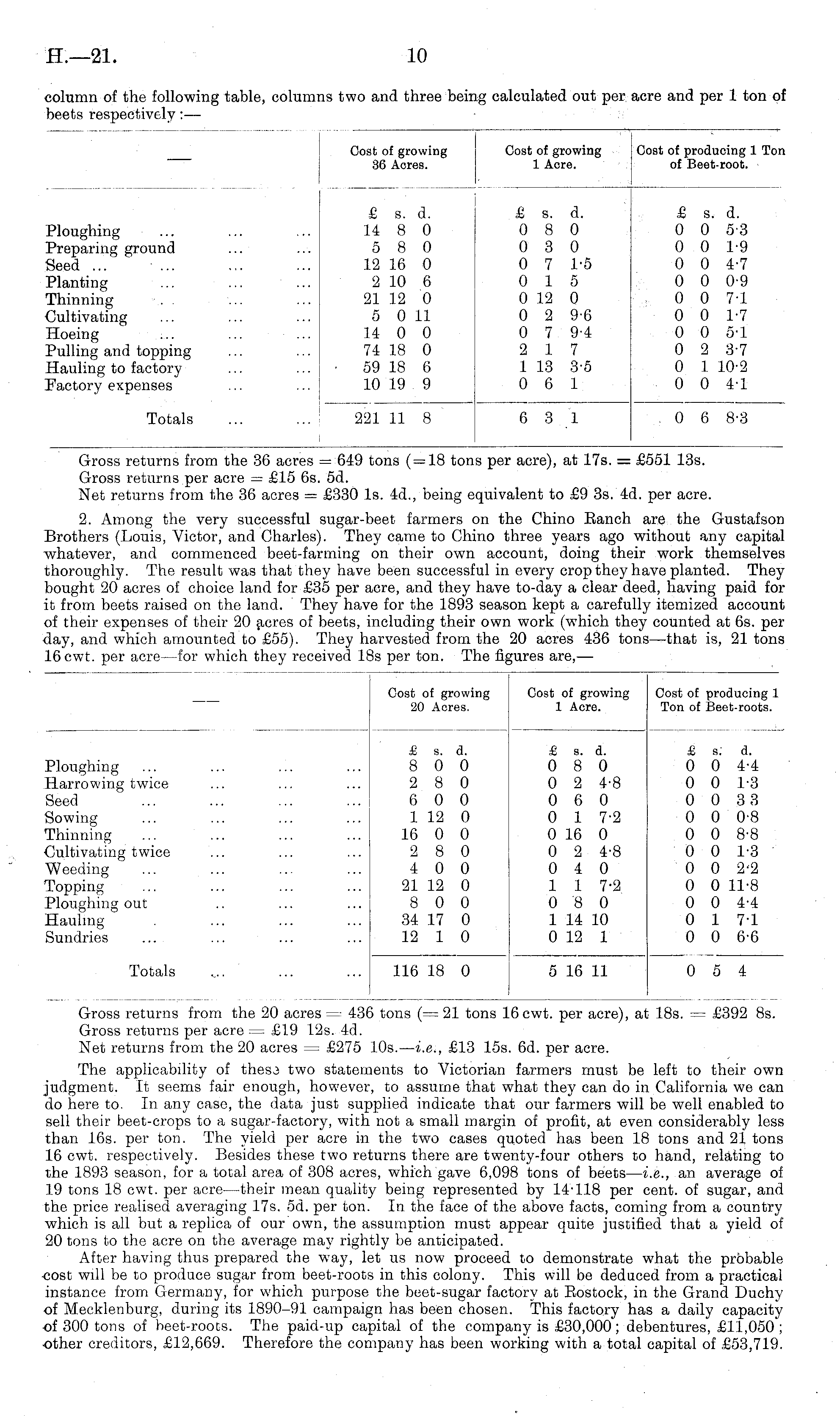 Gross returns from the 36 acres = 649 tons ( = 18 tons per acre), at 17s. = £551 13s. Gross returns per acre = £15 6s. sd. Net returns from the 36 acres = £330 Is. 4d., being equivalent to £9 3s. 4d. per acre. 2. Among the very successful sugar-beet farmers on the Chino Eanch are the Gustafson Brothers (Louis, Victor, and Charles). They came to Chino three years ago without any capital whatever, and commenced beet-farming on their own account, doing their work themselves thoroughly. The result was that they have been successful in every crop they have planted. They bought 20 acres of choice land for £35 per acre, and they have to-day a clear deed, having paid for it from beets raised on the land. They have for the 1893 season kept a carefully itemized account of their expenses of their 20 acres of beets, including their own work (which they counted at 6s. per day, and which amounted to £55). They harvested from the 20 acres 436 tons—that is, 21 tons 16 cwt. per acre —for which they received 18s per ton. The figures are, —