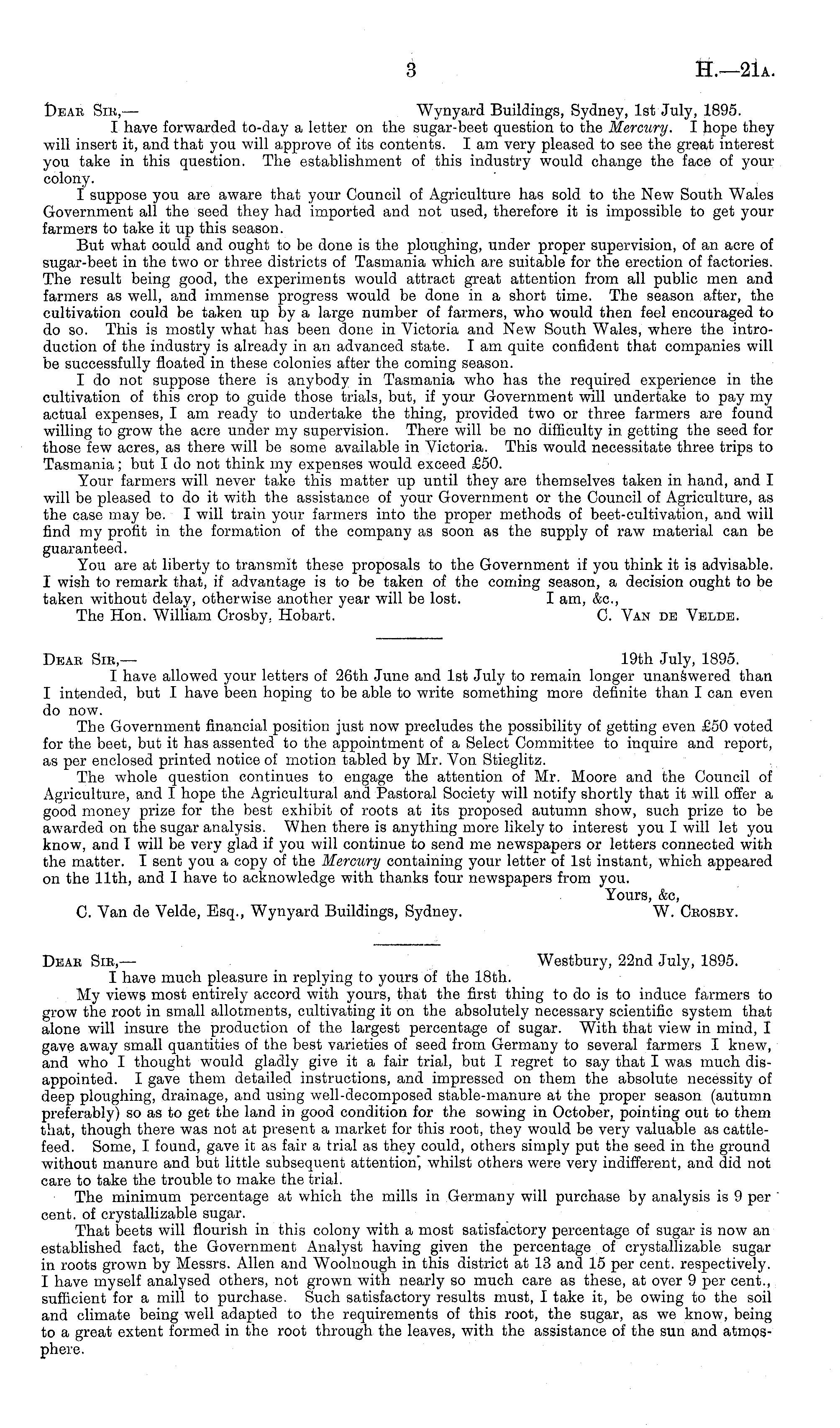 Deak Sib,— 19th July, 1895. I have allowed your letters of 26th June and Ist July to remain longer unanswered than I intended, but I have been hoping to be able to write something more definite than I can even do now. The Government financial position just now precludes the possibility of getting even £50 voted for the beet, but it has assented to the appointment of a Select Committee to inquire and report, as per enclosed printed notice of motion tabled by Mr. Yon Stieglitz. The whole question continues to engage the attention of Mr. Moore and the Council of Agriculture, and I hope the Agricultural and Pastoral Society will notify shortly that it will offer a good money prize for the best exhibit of roots at its proposed autumn show, such prize to be awarded on the sugar analysis. When there is anything more likely to interest you I will let you know, and I will be very glad if you will continue to send me newspapers or letters connected with the matter. I sent you a copy of the Mercury containing your letter of Ist instant, which appeared on the 11th, and I have to acknowledge with thanks four newspapers from you. Yours, &c, C. Van de Velde, Esq., Wynyard Buildings, Sydney. W. Ceosby.