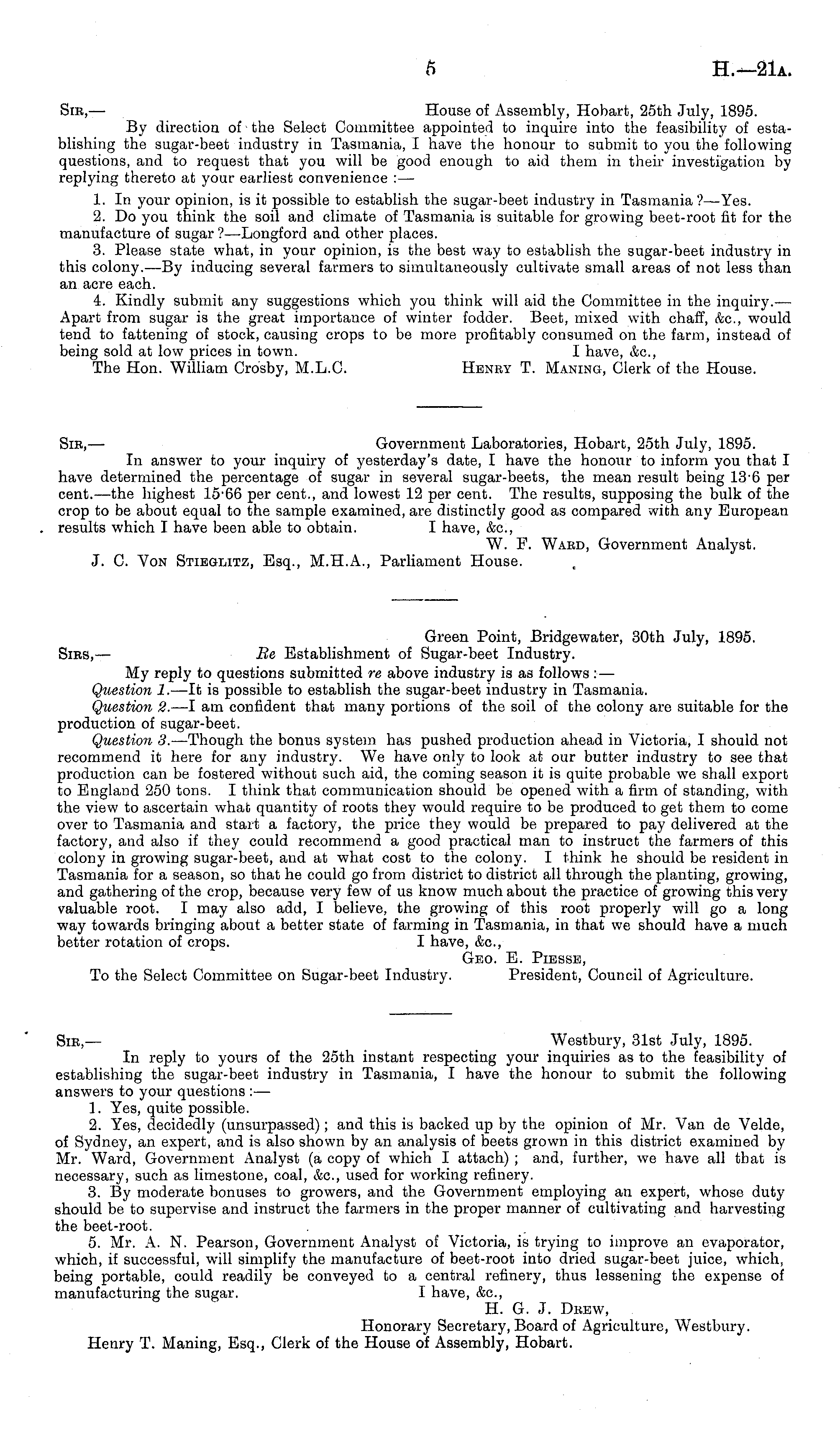 Sir, — House of Assembly, Hobart, 25th July, 1895. By direction of ■ the Select Committee appointed to inquire into the feasibility of establishing the sugar-beet industry in Tasmania, I have the honour to submit to you the following questions, and to request that you will be good enough to aid them in their investigation by replying thereto at your earliest convenience : — 1. In your opinion, is it possible to establish the sugar-beet industry in Tasmania?— Yes. 2. Do you think the soil and climate of Tasmania is suitable for growing beet-root fit for the manufacture of sugar'?— Longford and other places. 3. Please state what, in your opinion, is the best way to establish the sugar-beet industry in this colony.—By inducing several farmers to simultaneously cultivate small areas of not less than an acre each. 4. Kindly submit any suggestions which you think will aid the Committee in the inquiry.— Apart from sugar is the great importance of winter fodder. Beet, mixed with chaff, &c, would tend to fattening of stock, causing crops to be more profitably consumed on the farm, instead of being sold at low prices in town. I have, &c, The Hon. William Crosby, M.L.C. Heney T. Maning, Clerk of the House.