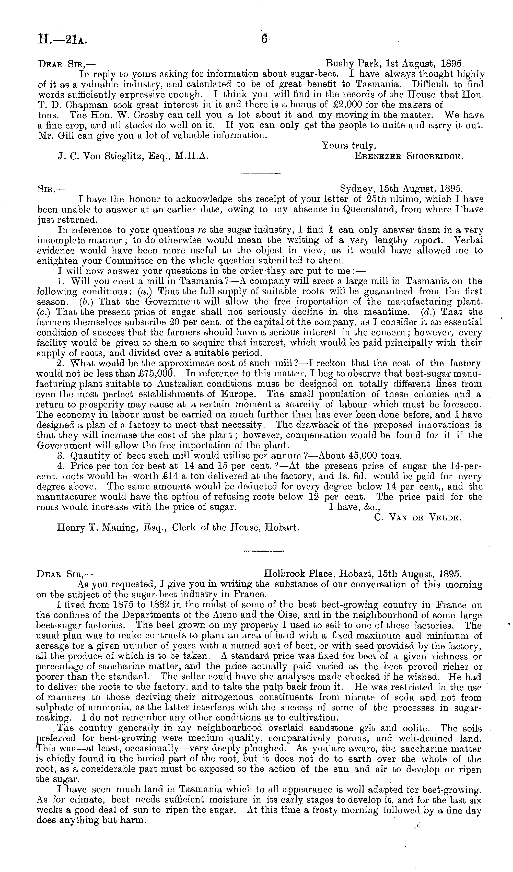 Dear Sir, — Bushy Park, Ist August, 1895. In reply to yours asking for information about sugar-beet. I have always thought highly of it as a valuable industry, and calculated to be of great benefit to Tasmania. Difficult to find words sufficiently expressive enough. I think you will find in the records of the House that Hon. T. D. Chapman took great interest in it and there is a bonus of £2,000 for the makers of tons. The Hon. W. Crosby can tell you a lot about it and my moving in the matter. We have a fine crop, and all stocks do well on it. If you can only get the people to unite and carry it out. Mr. Gill can give you a lot of valuable information. "Yours truly, J. C. Yon Stieglitz, Esq., M.H.A. Ebenezer Shoobridge.