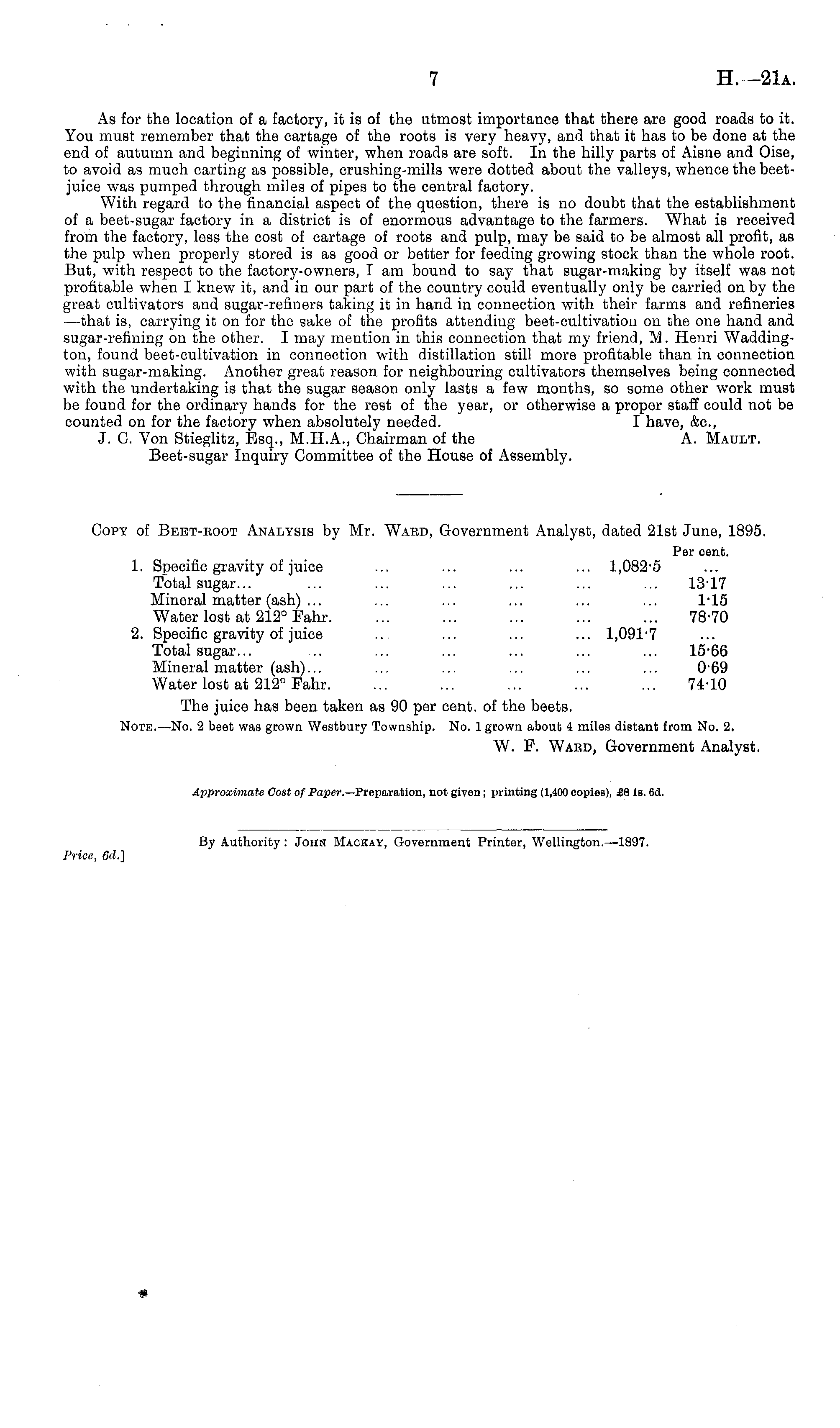 Copy of Beet-moot Analysis by Mr. Waed, Government Analyst, dated 21st June, 1895. Per oent. 1. Specific gravity of juice ... ... ... ... 1,082-5 Total sugar... ... ... ... ... ... ... 13-17 Mineral matter (ash) ... ... ... ... ... ... 1-15 Water lost at 212° Fahr. ... ... ... ... ... 78-70 2. Specific gravity of juice ... ... ... ... 1,0917 Total sugar... .. ... ... ... ... ... 15-66 Mineral matter (ash)... ... ... ... ... ... 0-69 Water lost at 212° Fahr. ... ... ... ... ... 74-10 The juice has been taken as 90 per cent, of the beets. Note.—No. 2 beet was grown Westbury Township. No. 1 grown about 4 miles distant from No. 2. W. F. Wabd, Government Analyst. Approximate Cost of Paper.— Preparation, not given; printing (1,400 copies), £ 8 Iβ. 6d.