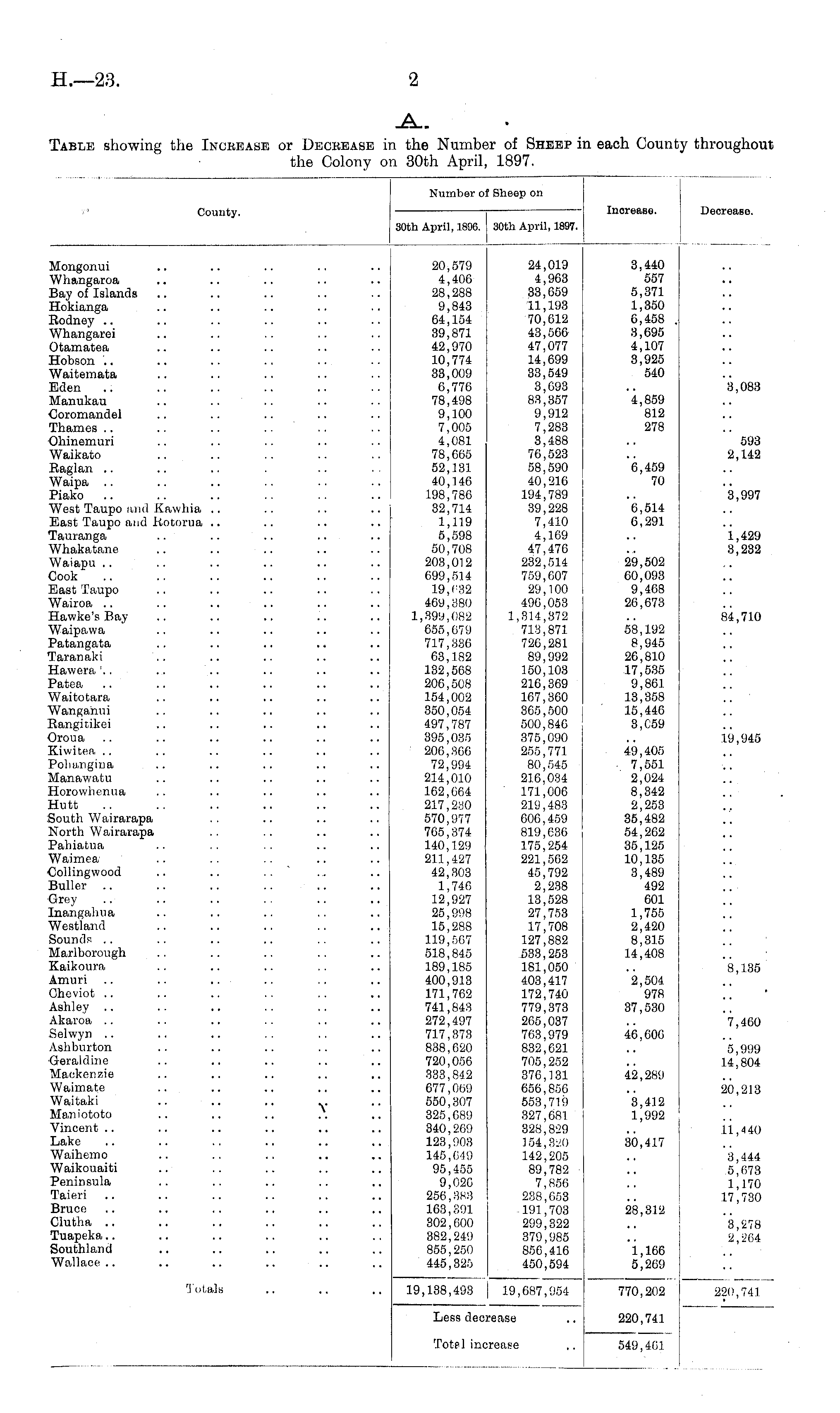 i> County. Number of Sheep on 30th April, 1890. 30th April, 1897. Number of Sheep on Increase. Decrease. Mongonui Whangaroa Bay of Islands Hokianga Rodney .. Whangaroi Otamatea Hobson .. Wai tern ata Eden Manukau Coromandel Thames Ohinemuri Waikato Raglan Waipa Piako West Taupo and Kawhia .. East Taupo and Rotorua .. Tauranga Whakatane Waiapn Cook East Taupo Wairoa Hawke's Bay Waipawa Patau gata Taranaki Haw era Patca Waitotara Wanganui Rangitikei Oroua Kiwitea .. Pohangina Manawatu Horowhenu&i Hutt South Wnirarapa North Wairarapa Pahiatua Waimea Collingwood Buller .. Grey Inangahua Westland Sounds .. Marlborough Kaikoura Amuri .. .. Cheviot Ashley Akaroa Selwyn Asli burton G-eraldine Mackenzie Waimate Wajtaki Ma.niototo Vincent Lake Waihemo Waikouaiti Peninsula Taieri Bruce Clutha .. Tuapeka Southland Wallace Y 20,579 4,406 28,288 9,843 64,154 39,871 42,970 10,774 33,009 6,776 78,498 9,100 7,005 4,081 78,665 52,131 40,146 198,786 32,714 1,119 5,598 50,708 203,012 699,514 19,682 409,380 1,399,082 655,679 717,336 63,182 132,568 206,508 154,002 350,054 497,787 395,035 206,366 72,994 214,010 162,664 217, 280 570,977 765,374 140,129 211,427 42,303 1,74(5 12,927 25,998 15,288 119,567 518,845 189,185 400,913 171,762 741,843 272,497 717,373 838,620 720,056 333,842 677,069 550,307 325,689 340,269 128,908 146,649 95,455 9,026 256,3K3 163,391 302,600 382,249 855,250 445,325 24,019 4,963 33,659 11,193 70,612 43,566 47,077 14,699 33,549 3,693 83,357 9,912 7,283 3,488 76,523 58,590 40,216 194,789 39,228 7,410 4,169 47,476 232,514 759,607 29,100 490,058 1,314,372 713,871 726,281 89,992 150,103 216,369 167,860 365,500 500,846 375,090 255,771 80,545 216,034 171,006 219,483 606,459 819,636 175,254 221,562 45,792 2,238 13,528 27,753 ]7,708 127,882 538,253 181,050 403,417 172,740 779,373 265,037 763,979 832,021 705,252 376,131 656,850 553,719 327,681 328,829 154,820 142,205 89,782 7,856 238,653 191,703 299,322 379,985 856,416 450,594 3,440 557 5,371 1,850 6,458 3,695 4,107 3,925 540 4,859 812 278 6,459 70 6,514 6,291 29,502 60,093 9,468 26,673 58,192 8,945 26,810 17,535 9,861 13,358 15,446 8.C69 49,405 7,551 2,024 8,342 2,253 35,482 54,262 35,125 10,135 3,489 492 601 1,755 \ 2,420 I 8,315 14,408 ! 3,083 593 2,142 3,997 1,429 3,232 84,710 19,945 2,504 I 978 87,580 8,135 40,606 7,460 5,999 14,804 42,289 3,412 1,992 20,213 LI, A 40 30,417 3,444 5,673 1,170 17,730 28,312 3,278 2,264 1,166 5,269 Totals 19,138,493 19,687,954 770,202 220,741 Less dec: 220,741 •ease f P/"\f-Q 1 T >T t\ rrapn