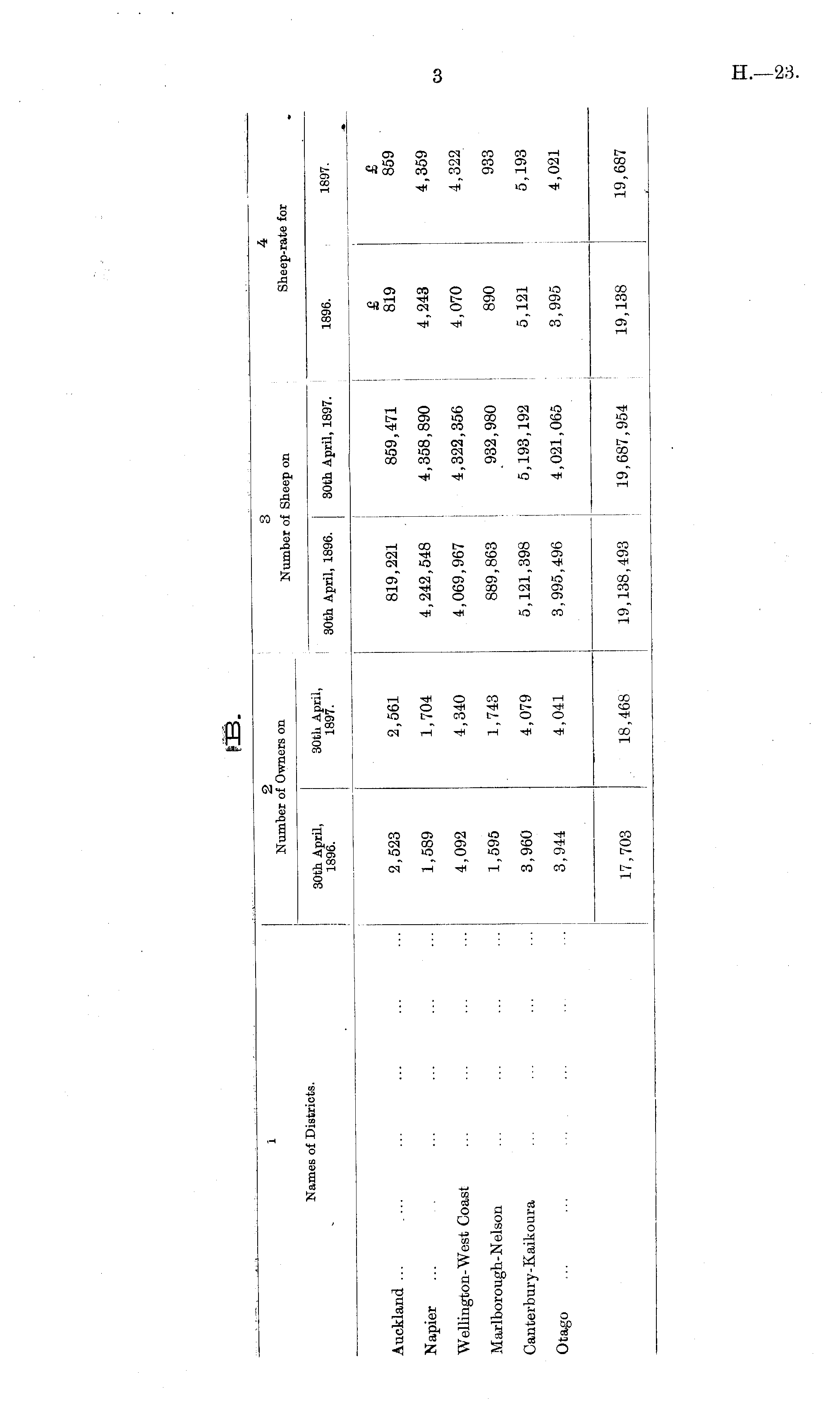 2 Number of Owners on S 4 i Number of Sheep on Sheep-rate for Names of Districts. 30th April, 1896. 30th April, 1897. 30th April, 1896. 30th April, 1897. 1896. 1897. 859,471 819 859 Auckland ... .... 2,523 2,561 819,221 Napier 1,589 1,704 4,242,548 4,358,890 4,243 4,359 Wellington- West Coast 4,092 4,340 4,069,967 4,322,356 932,980 4,070 890 4,322 Marlborough-Nelson 1,595 1,743 889,863 933 Canterbury-Kaikoura 3,960 4,079 5,121,398 5,193,192 5,121 5,193 Otago 3,944 4,041 3,995,496 4,021,065 3,995 4,021 17,703 18,468 19,138,493 19,687,954 19,138 19,687