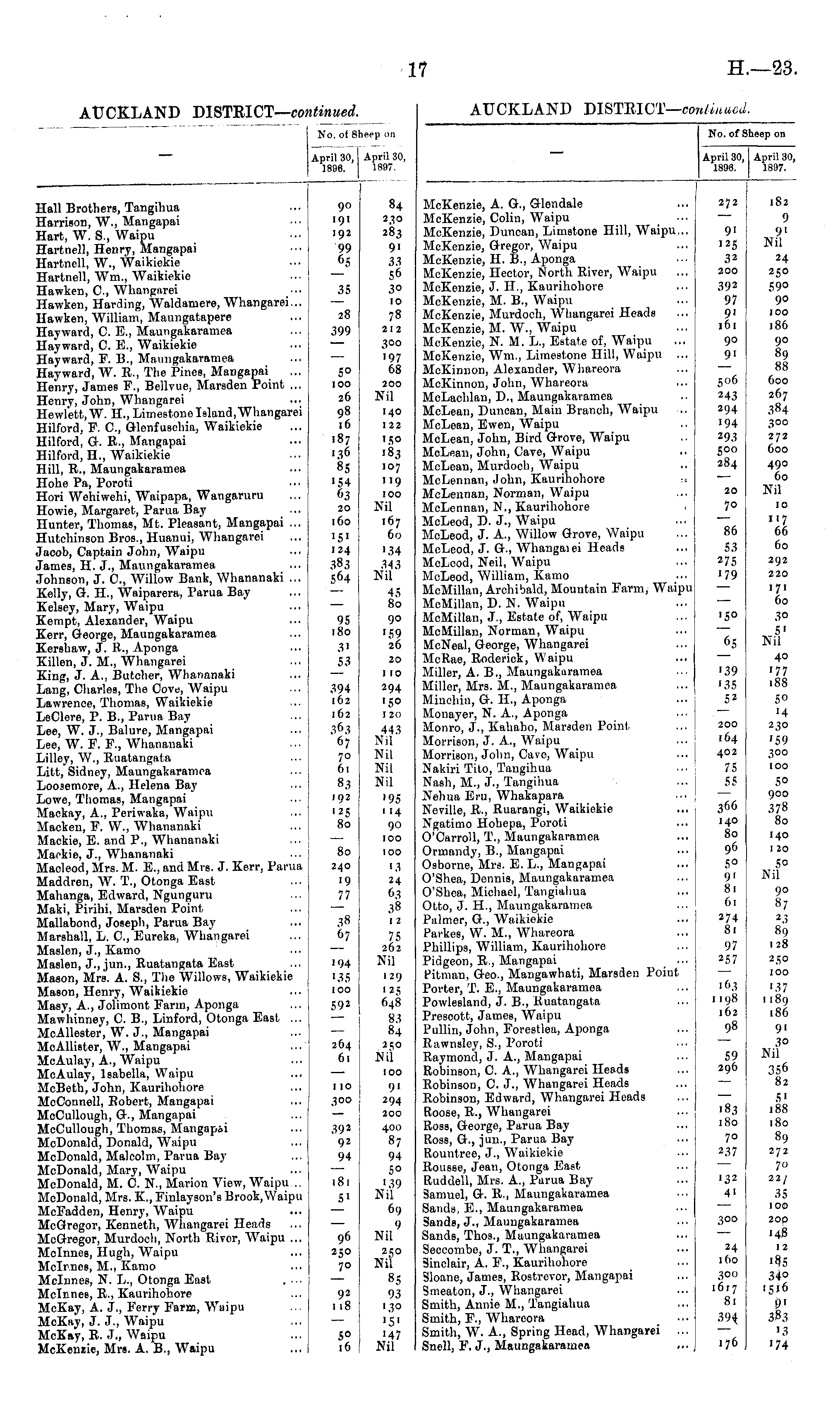No. of Sheep on April 30, April 30, 1896. 1897. Hall Brothers, Tangihua Harrison, W., Mangapai Hart, W. S., Waipu Hartnell, Henry, Mangapai Hartnell, W., Waikiekie Hartnell, Win, Waikiekie Hawken, C, Whangarei Hawken, Harding, Waldamere, Whangarei .. Hawken, William, Maungatapere Hay ward, C. E., Maungakaramea Hayward, C. E., Waikiekie Hayward, F. B., Maungakaramea Hayward, W. R., The Tines, Mangapai ... Henry, James F., Bellvue, Marsden Point ... Henry, John, Whangarei Hewlett, W. H., Limestone Island, Whangarei Hilfbrd, F. C, G-lenfuschia, Waikiekie Hilford, G. K., Mangapai Hilford, H., Waikiekie Hill, R., Maungakaramea Hohe Pa, Poroti Hori Wehiwehi, Waipapa, Wangaruru Howie, Margaret, Parua Bay ... Hunter, Thomas, Mt. Pleasant, Mangapai ... Hutchinson Bros., Huanui, Whangarei Jacob, Captain John, Waipu James, H. J., Maungakaramea Johnson, J. 0., Willow Bank, Whananaki ... Kelly, G. II., Waiparera, Parua Bay Kelsey, Mary, Waipu Kempt, Alexander, Waipu Kerr, George, Maungakaramea Kersbaw, J. R., Aponga Killen, J. M., Whangarei King, J. A., Butcher, Whananaki Lang, Charles, The Cove, Waipu Lawrence, Thomas, Waikiekie LeClere, P. B., Parua Bay Lee, W. J., Balure, Mangapai Lee, W. F. P., Whananaki Lilley, W., Ruatangata Litt, Sidney, Maungakarampa Loosemore, A., Helena Bay Lowe, Thomas, Mangapai Mackay, A., Periwaka, Waipu Macken, F. W., Whananaki Mackie, E. and P., Whananaki Maokie, J., Whananaki Macleod, Mrs. M. E., and Mrs. J. Kerr, Parua Maddren, W. T., Otonga East Mahanga, Edward, Ngunguru Maki, Pirihi, Marsden Point Mallabond, Joseph, Parua Bay Marshall, L. C, Eureka, Whangarei Maslcn, J., Kamo Maslen, J., jun., Ruatangata East Mason, Mrs. A. S., The Willows, Waikiekie Mason, Henry, Waikiekie Masy, A., Jolimont Farm, Aponga Mawhinney, C. B., Linford, Otonga East ... McAllester, W. J., Mangapai McAllister, W., Mangapai McAulay, A., Waipu McAulay, Isabella, Waipu McBeth, John, Kaurihohore McConnell, Eobert, Mangapai McCullough, G-., Mangapai McCullough, Thomas, Mangapai McDonald, Donald, Waipu McDonald, Malcolm, Parua Bay McDonald, Mary, Waipu McDonald, M. C. N., Marion View, Waipu .. McDonald, Mrs. IS.., Finlayson's Brook,Waipu McFadden, Henry, Waipu McGregor, Kenneth, Whangarei Heads McGregor, Murdoch, North Rirer, Waipu ... Mclnues, Hugh, Waipu Mclrnes, M., Kamo Mclnnes, N. L., Otonga East Mclnnee, R., Kaurihohore McKay, A. J., Ferry Farm, Waipu McKay, J. J., Waipu McKay, R. J., Waipu McKemie, Mrs. A. B., Waipu 9° 99 65 84 230 283 9' 33 56 3° 10 78 212 300 197 68 200 Nil 35 28 399 5° ioo 26 9 8 i6 187 136 85 "54 63 20 160 140 122 150 183 107 119 100 Nil 167 60 134 343 Nil 45 80 '5 1 124 383 564 95 180 9° '59 26 3.1 53 20 1 10 294 '5° 1 20 443 Nil Nil Nil Nil 394 162 162 363 67 70 61 83 192 12 5 80 80 '95 1 14 ()O 100 100 13 24 63 38 1 2 240 19 77 38 67 75 262 Nil '94 '35 100 129 '2.1 648 83 84 250 Nil 100 592 264 61 110 3°o 9' 294 200 400 87 94 5° ■39 Nil 69 9 Nil 250 Nil 8S 93 '3° '5' ■47 Nil 39J 92 94 i8( 5' 96 250 70 92 118 5° 16