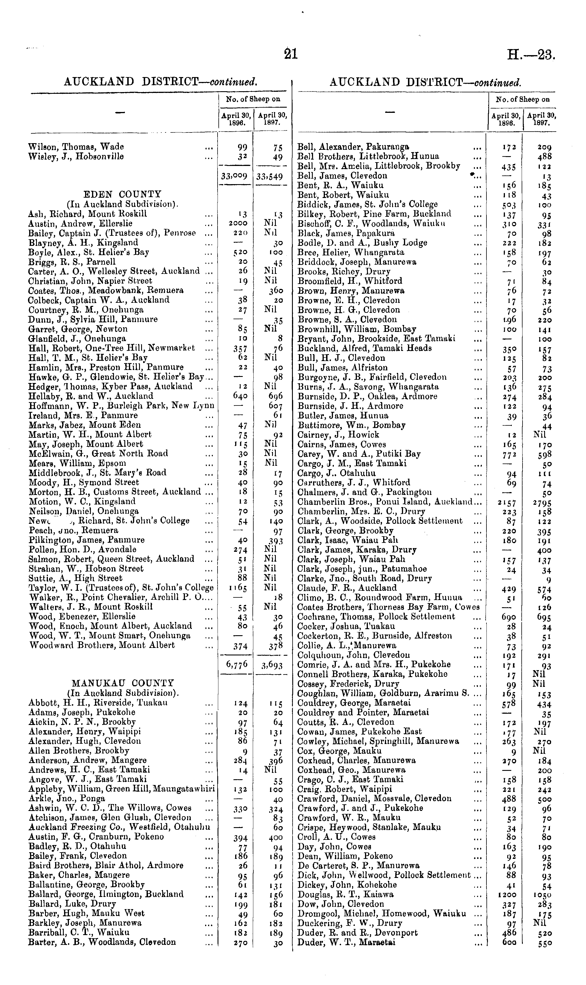 No. of Sheep on April 30, April 30, 1896. 1897. Wilson, Thomas, Wade Wisley, J., Hobsonville 99 32 75 49 EDEN COUNTY (In Auckland Subdivision). Ash, Eichard, Mount Koskill Austin, Andrew, Ellerslie Bailey, Captain J. (Trustees of), Penrose ... Blayney, A. H., Kingsland Boyle, Alex., St. Helier's Bay Briggs, R. S., Parnell Carter, A. O., Wellesley Street, Auckland ... Christian, John, Napier Street Coates, Thos., Meadowbank, Remuera Colbeck, Captain W. A., Auckland Courtney, R. M., Onehunga Dunn, J., Sylvia Hill, Paninure Garret, George, Newton G-lanfield, J., Onehunga Hall, Robert, One-Tree Hill, Newmarket ... Hall, T. M., St. Helier's Bay Hamlin, Mrs., Preston Hill, Panmure Hawko, G. P., GHendowie, St. Helier's Bay... Hedger, lhomas, Kyber Pass, Auckland Hellaby, R. and W., Auckland Hoffmann, W. P., Burlcigh Park, New Lynn Ireland, Mrs. B , Panmure Marks, Jabez, Mount Eden Martin, W. H., Mount Albert May, Joseph, Mount Albert McElwain, Or., Great North Road Mears, William, Epsom Middlobrook, J., St. Mary's Road Moody, H., Symond Street Morton, H. B., Customs Street, Auckland ... Motion, W. C, Kingsland Neilson, Daniel, Onehunga Newt ,, Richard, St. John's College Peach, tino., Remuera Pilkington, James, Panmure Pollen, Hon. D., Avondale Salmon, Robert, Queen Street, Auckland Stralian, W., Hobson Street Suttie, A., High Street Taylor, W. I. (Trusteesof), St. John's College Walker, R., Point Chevalier, Archill P. O.... Walters, J. R., Mount Roskill Wood, Ebenezor, Ellertslie Wood, Enouh, Mount Albert, Auckland Wood, W. T., Mount Smart, Onehunga Woodward Brothers, Mount Albert 33,009 33j549 13 2000 220 [3 Nil Nil 520 3° loo 20 26 '9 45 Nil Nil 360 20 Nil 38 27 85 10 35 Nil 8 76 Nil 357 62 22 1 2 640 47 75 "5 30 28 40 18 40 98 Nil 696 607 61 Nil 92 Nil Nil Nil 17 90 IS 53 1)0 140 97 39.3 Nil Nil Nil Nil Nil 18 Nil 1 2 70 54 40 274 5' 31 88 1,65 55 43 80 3° 46 45 378 374 6,776 3.693 MANUKAU COUNTY (In Auckland Subdivision). Abbott, II. II., Riverside, Tuakau Adams, Joseph, Pukekohe Aickin, N. P. N., Brookby Alexander, Henry, Waipipi Alexander, Hugh, Clevedon Allen Brothers, Brookby Anderson, Andrew, Mangere Andrews, H. C, East Tamaki Angove, W. J., East Tamaki Appleby, William, Green Hill, Maungatawhiri Arkle, Jno., Ponga Ashwin, W. 0. D., The Willows, Cowes ... Atchison, James, Glen Glush, Clevedon Auckland Freezing Co., Westfield, Otahuhu Austin, F. G., Cranburn, Pokeno Badley, R. D., Otahuhu Bailey, Frank, Clevedon Baird Brothers, Blair Athol, Ardmore Baker, Charles, Maugere Ballantine, George, Brookby Billiard, Goorge, Ilmington, Buckland Ballard, Luke, Drury Barber, Hugh, Mauku West Barkley, Joseph, Manurewa Barriball, C. T., Waiuku Barter, A. B., Woodlands, Olevedon 124 20 97 '85 86 9 284 132 33° "5 20 64 '3' 7' 37 396 Nil 55 100 40 324 8.5 60 400 94 189 11 96 >3' 156 181 60 182 189 3° 394 77 186 26 61 142 199 49 162 182 270