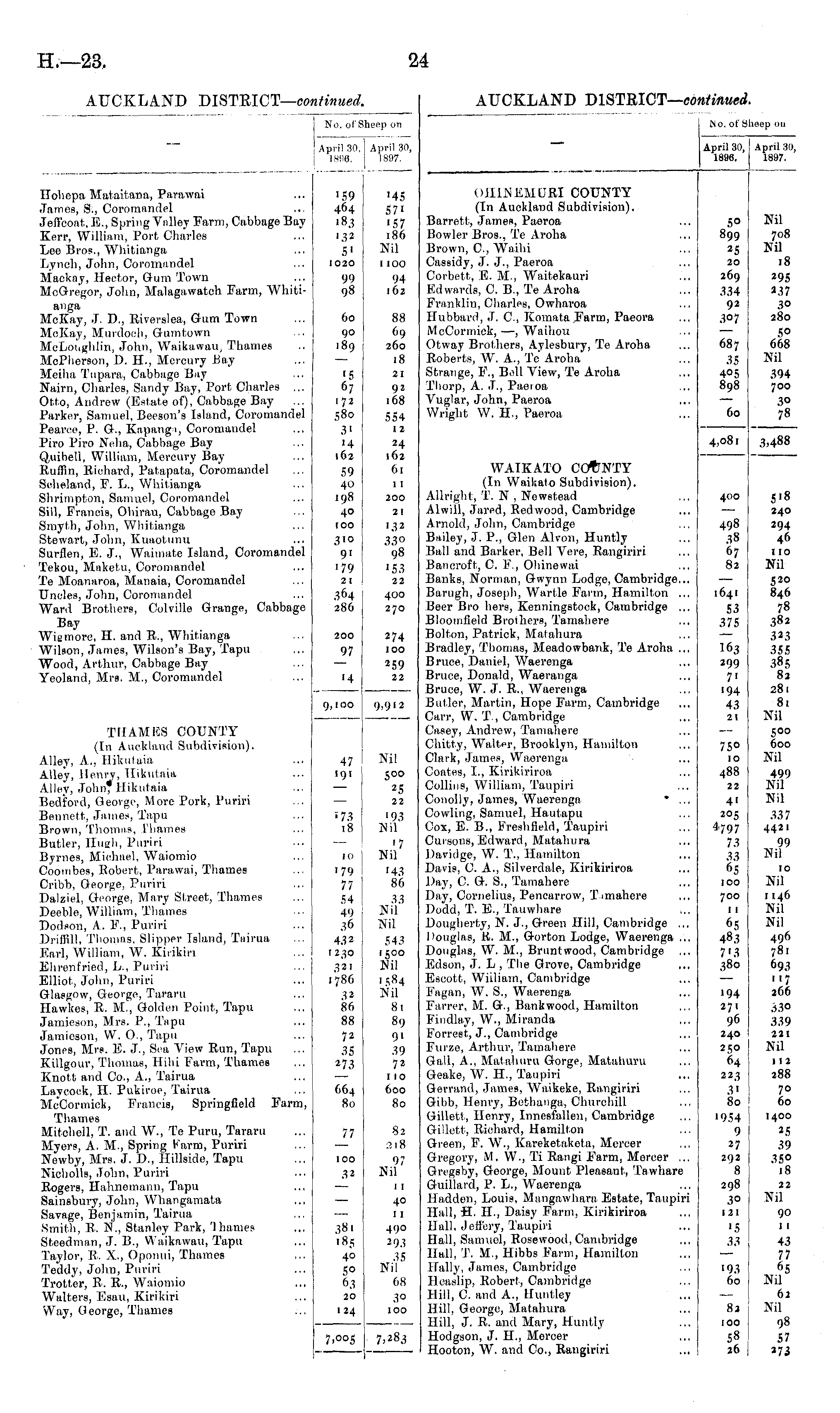 No. of 8 5heep on April :n>, 1807. Apvil 30, isfie. Holiepa Mataitana, Parawai James, 8., Coromimdel Jeffcoat, E., Spring Vnlley Farm, Cabbage Bay Kerr, William, Port Charles Lee Bros., Whitianga Lynch, John, Coromimdel Mackay, Hector, Gum Town McGregor, John, Malagawateh Farm, Whitianga McKay, J. D., Riverslea, Gum Town McKay, Murdoch, Giimtown McLoi.glilin, John, Waikawau, Thames McPherson, D, H., Mercury Bay Meiha Tupara, Cabbage Bay Nairn, Charles, Sandy Bay, Port Charles ,.. Otto, Andrew (Estate of), Cabbage Bay Parker, Samuel, Beeaon's Island, Coromandel Pearce, P. G., Kapangi, Coromandel Piro Piro Neha, Cabbage Bay Q.uibeli, William, Mercury Bay Ruffln, Richard, Patapata, Coromandel Seheland, F. L., Whitianga Shrirnpton, Samuel, Coromandel Sill, Francis, Ohirau, Cabbage Bay Smyth, John, Whitianga Stewart, John, Kuaotumi Surflen, E. J., Waitnate Island, Coromandel Tekou, Maketu, Coromandel Te Moanaroa, Manaia, Coromandel Uncles, John, Coromandel Ward Brothers, Colville Grange, Cabbage Bay Wiamore, H. and R., Whitianga Wilson, James, Wilson's Bay, Tapu Wood, Arthur, Cabbage Bay Yeoland, Mrs. M., Coromandel 464 '83 132 s> 1020 ■45 s7i '57 186 Nil 1100 99 98 94 162 60 88 69 260 18 9° ■ 89 '5 67 172 580 a 1 14 162 59 40 198 40 roo 21 92 168 554 12 162 6r 11 200 21 31° 9' 364 286 ■32 33° 98 '55 400 270 200 97 274 100 '4 2 59 22 THAMES COUNTY (In Auckland Subdivision). Alloy, A., Hikuluia Alley, Ilenrv, Ilikutaia Alley, John* Hikutaia Bedford, George, More Pork, Puriri Bennett, James, Tapu Brown, Thomas, .Thames Butler, Hug-li, Puriri Byrnes, Michael, Waiomio Coombes, Robert, Parawai, Thames Cribb, George, Puriri Dalaiel, George, Mary Street, Thames Beeble, William, Thames Dodson, A. F., Puriri DrifflH, Thonins, Slipper Tsland, Tuirua Earl, William, W. Kirikin Ehrenfried, It, Puriri Elliot, John, Puriri Glasgow, George, Tararu Hawkes, E. M., Golden Point, Tapu Jamieson, Mrs. P., Tapu Jamieson, VV. 0., Tapu Jones, Mrs. E. J., Sea View Run, Tapu Killgour, Thomas, Hihi Farm, Thames Knott and Co., A., Tairua Laycock, H. Pukiroe, Tairua McCormicli, Francis, Springfield Farm, Thames Mitchell, T. arid W., To Puru, Tararu Myers, A. M., Spring Farm, Puriri Newby, Mrs. J. D., Hillside, Tapu Nicholls, John, Puriri Rogers, Hahnemann, Tapu Sainsbury, John, Whangamata Savage, Benjamin, Tairua Smith, R. N., Stanley Park, Thames Steedman, J, B., Waikawau, Tapu Taylor, R. X., Oponui, Thames Teddy, John, Puriri Trotter, R. R., Waiomio Walters, Esau, Kirildri Way, George, Thames 9,[ 00 9,912 47 191 Nil 500 25 22 '93 Nil 1.73 18 _ 10 179 77 54 49 36 432 1230 321 1786 I ■7 Nil '43 86 Nil Nil 32 86 88 72 35 273 543 1; 00 Nil '584 Nil 81 89 9' 39 72 1 10 600 80 664 80 77 82 .!l8 97 Nil 100 32 11 381 '8S 40 5° f>3 20 124 4° 11 490 2 93 35 Nil 68 3° 100 7.005 7.283