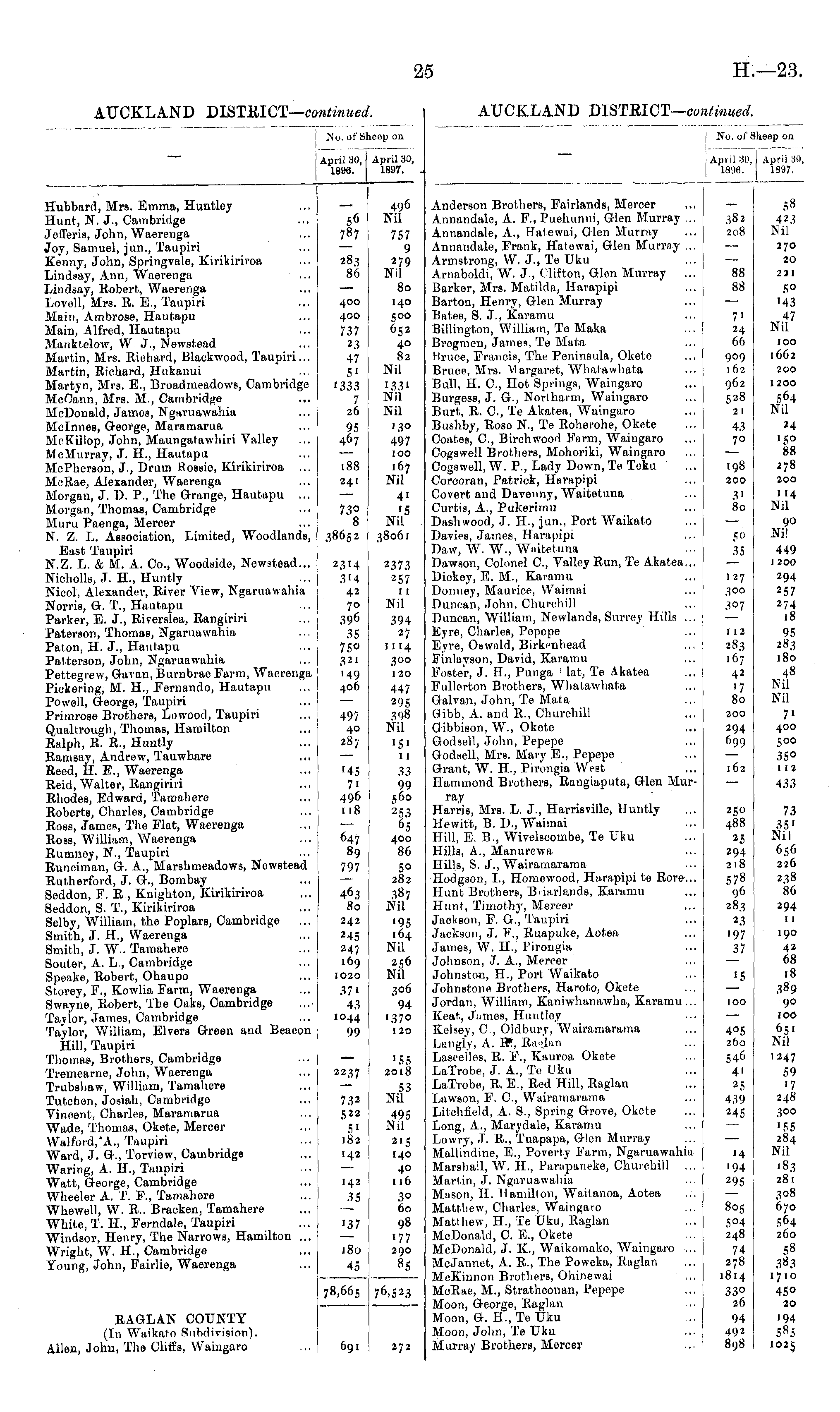 >'o. of Sheep on April 30, April 30, 1896. 1897. Hubbard, Mrs. Emma, Huntley Hunt, N. J., Cambridge Jefferis, John, Waerenga Joy, Samuel, jun., Taupiri Kenny, Jolin, Springvale, Kirikiriroa Lindsay, Ann, Waerenga Lindsay, Robert, Waerenga Lovell, Mrs. R. E., Taupiri Main, Ambrose, Hautapu Main, Alfred, Hautapu Manktelow, W J., Newstead Martin, Mrs. Richard, Blaokwood, Taupiri... Martin, Richard, Hukanui Martyn, Mrs. B., Broadmeadows, Cambridge McOarm, Mrs. M., Cambridge McDonald, Jamos, Ngnruawaliia Mclnnes, George, Maramarua MCKillop, John, Maurigatawhiri Valley McMurray, J. H., Hautapu McPherson, J., Drum Roseie, Kirikiriroa McRae, Alexander, Waerenga Morgan, J. D. P., The Grange, Hautapu ... Morgan, Thomas, Cambridge Mum Paenga, Mercer N. Z. L. Association, Limited, Woodlands, East Taupiri N.Z. L. & M. A.. Co., Woodside, Newstead... Nicholls, J. H., Huntly Nicol, Alexander, River View, Ngaruawahia Norrie, G. T., Hautapu Parker, E. J., Riverslea, Rangiriri Patereon, Thomas, Ngaruawahia Paton, H. J., Hautapu Palterson, John, Ngaruawahia Pettegrew, Gavan, Burnbrae Farm, Waerenga Pickering, M. H., Fernando, Hautapu Powell, George, Taupiri Primrose Brothers, Lowood, Taupiri Quallrough, Thomas, Hamilton Ralph, R, R., Huntly Ramsay, Andrew, Tauwhare Reed, H. E., Waerenga Reid, Waller, Rangiriri Rhodes, Edward, Tamahere Roberts, Charles, Cambridge Ross, James, The Flat, Waerenga Ross, William, Waerenga Rumney, N., Taupiri Runciman, G. A., Marslnneadows, Newstead Rutherford, J. G., Bombay Seddon, F. R , Kuighton, Kirikiriroa Seddon, S. T., Kirikiriroa Selby, William, the Poplars, Cambridge Smith, J. H., Waerenga Smith, J. W.. Tamahere Souter, A. L., Cambridge Spi-ake, Robert, Ohnupo Storey, F., Kowlia Farm, Waerenga Swayne, Robert, Xbe Oaks, Cambridge Taylor, James, Cambridge Taylor, William, Elvers Green aud Beacon Hill, Tanpiri Tliomas, Brothers, Cambridge Tremearne, John, Waerenga Trubshaw, William, Tamahere Tutclien, Jonah, Cambridge Vincent, Charles, Maramarua Wade, Thomas, Okete, Mercer Walford,"A., Taupiri Ward, J. G., Torview, Cambridge Waring, A. If., Taupiri Watt, George, Cambridge Wheeler A. T. F., Tamahere Whewell, W. R.. Bracken, Tamahere White, T. H., Ferndale, Taupiri Windsor, Henry, The Narrows, Hamilton ... Wright, W. H., Cambridge Young, John, Fairlie, Waerenga 56 787 283 86 400 400 737 23 47 5' '333 26 95 467 188 241 73° 8 38652 ! 23'4 314 42 70 396 35 75° 321 149 406 497 40 287 40,6 Nil m 9 279 Nil 80 140 500 652 40 82 Nil 1331 Nil Nil '3° 497 100 167 Nil 41 Ni'l 5 38061 2373 2 57 11 Nil 394 27 1114 300 120 447 2 95 398 Nil ■5" 11 145 7i 496 118 I 99 560 2 S3 6S 400 86 647 89 797 463 80 I So 282 387 Nil 242 245 24! 169 1020 371 43 1044 99 '95 164 Nil 256 Nil 306 94 '37° 120 ■55 2018 2237 732 522 5' 182 S3 Nil 495 Nil 142 2'5 140 40 i>6 142 35 3° 60 98 ■77 290 85 7 6 ,523 '37 180 45 78,665 RAGLAN COUNTY (In Waikaro Subdivision). Allen, John, The Cliffs, Waingaro 691 272