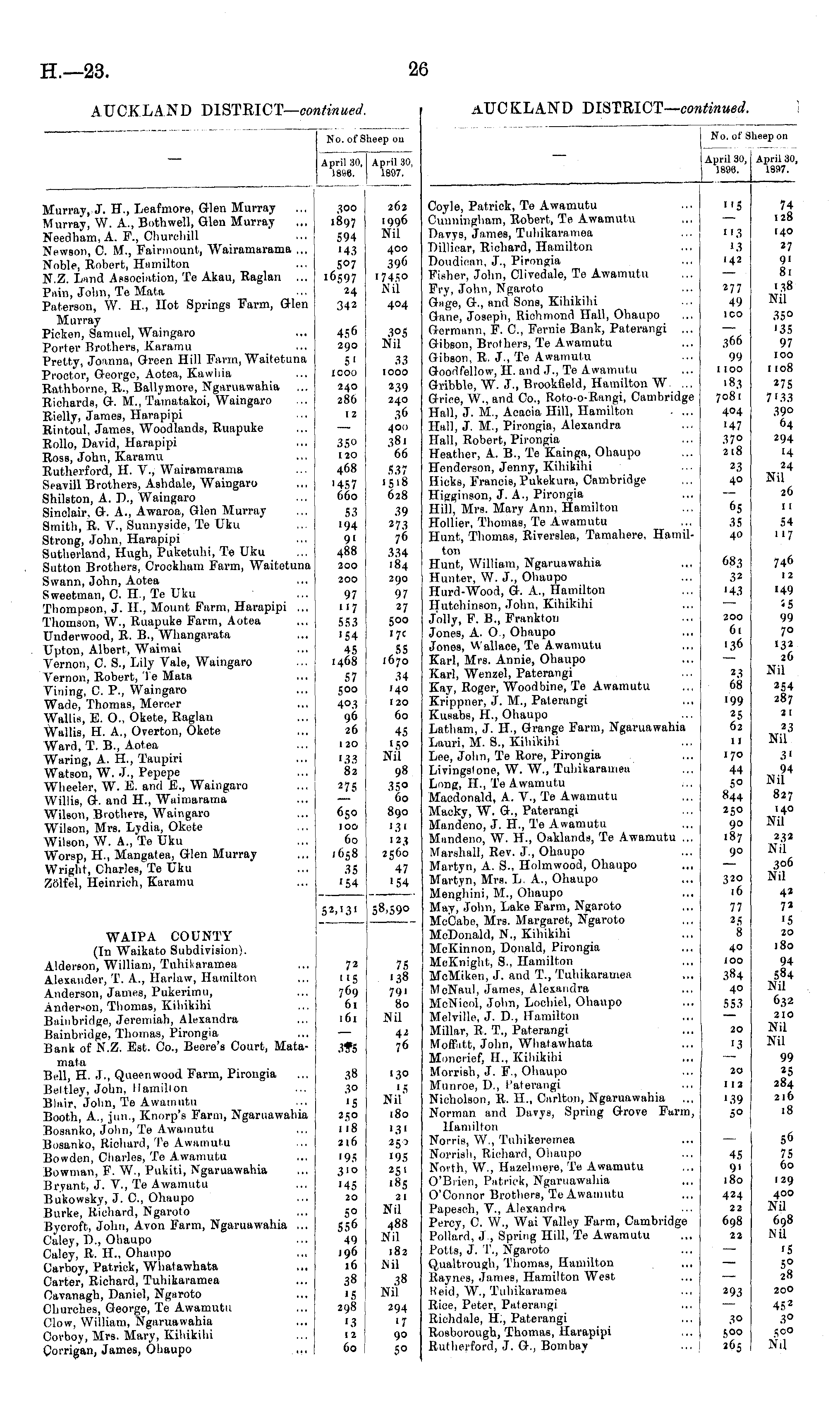No. of Sheep ou April 30, 18M). April 30, 1807. Murray, J. H., Leafinore, Glen Murray Murray, W. A., Bothwell, Glen Murray Needham.A. F., CliurcMU Ni'weon, C. M., Fairmount, Wairamaramft ... Noble, Robert., Hamilton N.Z. Lund Association, Te Akau, Raglan ... Pain, John, Te Mata Paterson, W. H., Hot Springs Farm, Glen Murray Picken, Samuel, Waingaro Porter Brothers, lfaramu Pretty, Joanna, Green Hill Farm, Waitetuna Proetor, George, Aotea, Kawhia Rathborne, R., Ballymore, Ngaruawahia Richards, G. M., Tamatakoi, Waingaro Rielly, James, Harapipi Eintoul, James, Woodlands, Ruapuke Rollo, David, Harapipi Ross, John, Karamu Rutherford, H. V., Wairamarama Seavill Brothers, Ashdale, Waingaro Shilston, A. D., Waingaro Sinclair. G. A., Awaroa, Glen Murray Smith, R. V., Sunnyside, Te Uku Strong, John, Harapipi Sutherland, Hugh, Puketuhi, Te Uku Sutton Brothers, Crockham Farm, Waitetuna Swann, John, Aotea Sweetman, C. H., Te Uku Thompson, J. H., Mount Farm, Harapipi ... Thomson, W., Ruapuke Farm, Aotea Underwood, R. B., Whangarata Upton, Albert, Waimai Vornon, C. S., Lily Vale, Waingaro Vernon, Robert, Tβ Mata Vining, C. P., Waingaro Wade, Thomas, Mereer Wallis, E. O., Okete, Raglan Wallis, H. A., Overtoil, Okete Ward, T. B., Aotea Waring, A. H., Taupiri Watson, W. J., Pepepe Wheeler, W. H. and E., Waingaro Willis, G. and H., Waimarama Wilson, Brothers, Waingaro Wilson, Mrs. Lydia, Okete Wilson, W. A., Te Uku Worsp, H., Mangatea, Glen Murray Wright, Charles, Te Uku Zolfel, Heinrich, Karamu l897 594 '43 5°7 16597 24 342 262 IQ96 Nil 400 396 ■745° JSil 404 456 290 5' 1000 305 Nil 33 1000 240 286 12 350 120 468 '457 660 2 39 240 36 400 381 66 537 1518 628 53 '94 9' i 488 ! 200 ] 200 97 117 553 '54 45 1468 57 500 4°3 96 26 120 39 273 76 334 184 290 97 27 500 17c 55 1670 3 + 140 120 60 45 ■5° Nil 98 35° 60 890 131 123 2560 '47 154 '33 82 275 650 100 60 1658 35 '54 WAIPA COUNTY (In Waikato Subdivision). Aldereon, William, Tuhiliaramea Alexander, T. A., Harlaw, Hamilton Anderson, James, Pukerimu, Anderson, Thomas, Kihikihi Bainbririge, Jeremiah, Alexandra Bainbridge, Thomas, Pirongia Bank of N.Z. fist. Co., Beere's Court, Mata5 2 .'3' 58.59° 72 '' 5 769 61 161 75 '38 791 80 Nil 42 76 3*5 mata Bell, H. .1., Queenwood Farm, Pirongia Buitley, John, Hamilton Blair, John, Te Awamiitu Booth, A., jun., Knorp's Farm, Ngaruawahia Bosanko, Jolin, Te Awamutu Bosanko, Kicliard, Te Awiimulu Bowden, Charles, Te Awamutu Bowman, F. W., Pukiti, Ngaruawahia Bryant, J. V., Te Awamutu Bukowsky, J. C, Olmupo Burke, Kicliard, Ngaroto Bycroft, John, Avon Farm, Ngaruawahia ... Caley, D., Ohaupo Caley, R. H., Ohaupo Carboy, Patrick, Whatawhata Carter, Richard, Tuhikaramea Oavanagh, Daniel, Ngaroto Churches, George, Te Awamutu Clow, William, Ngaruawahia Corboy, Mrs. Mary, Kihikihi Corrigan, James, Ohaupo 38 3° '5 250 118 216 '95 3'° '45 20 5° 556 49 196 16 38 '5 298 I '3 12 60 '30 Nil 180 >3i 25 3 195 25' '85 Nil 488 Nil 182 Nil 38 Nil 294 '7 90 5°