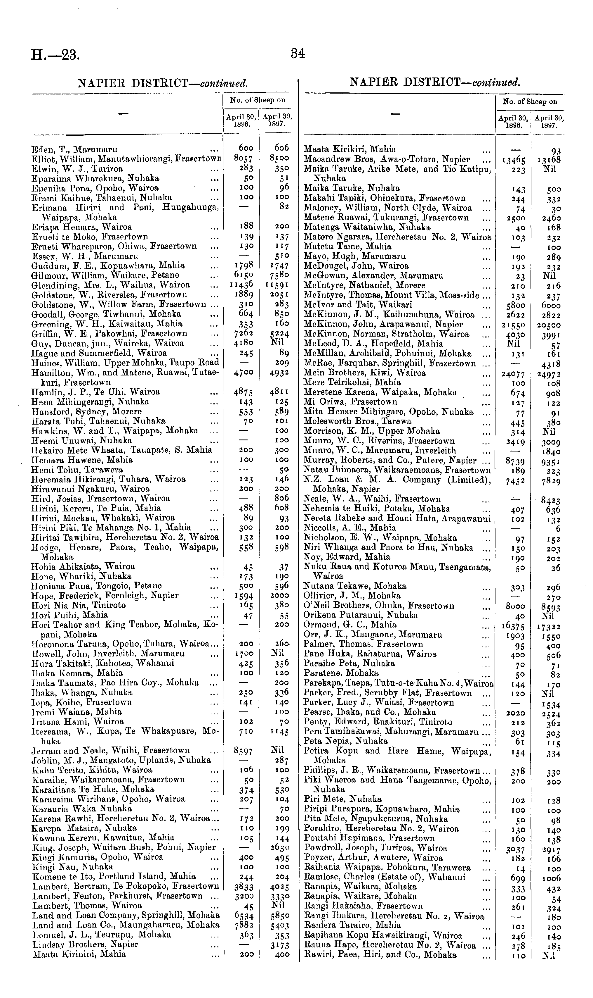 No. of Sheep on April 30, April 30, 1888. 1897. Maata Kirikiri, Mahia Macandrew Bros, Awa-o-Totara, Napier Maika Taruke, Arike Mete, and Tio Katipu, Nuhaka Maika Taruke, Nuhaka Makahi Tapiki, Oliinekura, Frasertown Maloney, William, North Clyde, Wairoa Matene Ruawai, Tukurangi, Frasertown Matenga Waitaniwha, Nuhaka Matore Ngarara, Hereheretau No. 2, Wairoa Matetu Tame, Mahia Mayo, Hugh, Marumaru McDougel, John, Wairoa McG-owan, Alexander, Marumaru Molntyre, Nathaniol, Morere Melntyre, Thomas, Mount Villa, Moss-Bide ... Melvor and Tait, Waikari MoKinnon, J. M., Kaihunahuna, Wairoa ... McKinnon, John, Arapawanui, Napier MoKinnon, Norman, Stratholm, Wairoa MeLeod, D. A., Hopefiold, Mahia McMillan, Archibald, Pohuinui, Mohaka McEae, Farquhar, Springhill, Frazertown ... Mein Brotliers, Kiwi, Wairoa Mere Teirikohai, Mahia Meretene Karena, Waipaka, Mohaka Mi Oriwa, Frasertown Mita Henare Mihingare, Opoho, Nahaka ... Moleeworth Bros., Tarewa Morrieon, K. M., Upper Mohaka Munro, W. C, Riverina, Frasertown Munro, W. C, Marumaru, Inverleith Murray, Roberts, and Co., Putere, Napier ... Natau Ihimaera, Waikaraemoana, Fiasertown N.Z. Loan & M. A. Company (Limited), Mohaka, Napier Neale, W. A., Waihi, Frasertown Nehemia te Huiki, Potaka, Mohaka Nereta Raheke and Hoani Hata, Arapawanui Niccolls, A. E., Mahia Nicholson, E. W., Waipapa, Mohaka Niri Whanga and Paora te Hau, Nuhaka ... Noy, Edward, Mahia Nuku Raua and Koturoa Manu, Taengamata, Wairoa Nutana Tekawe, Mohaka Ollivier, J. M., Mohaka O'Neil Brothers, Ohuka, Fraaertown Orikena Putaranui, Nuhaka Ortnond, Or. C, Maliia Orr, J. K., Mangaone, Marumaru Palmer, Thomas, Frasertown Pane Huka, Rahaturua, Wairoa Paraihe Peta, Nuliaka Paratene, Mohaka Parekapa, Taepa, Tutu-o-te KahaNo. 4,Wairoa Parker, Fred., Scrubby Flat, Frasertown Parker, Lucy J., Waitai, Frasertown Pearse, Ihaka, and Co., Mohaka Penty, Edward, Ruakituri, Tiniroto PeraTamihakawai, Mahurangi, Marumaru ... Peta Nepia, Nuhaka Petira Kopu and Hare Hame, Waipapa, Moliaka Phillips, J. R., Waikaremoana, Frasertown ... Piki Waerea aud Hana Tangemarae, Opoho, Nuhaka Piri Mete, Nuliaka Piripi Purapura, Kopuawharo, Mahia Pita Mete, Ngapuketurua, Nuhaka Porahiro, Hereheretau No. 2, Wairoa Poutahi Hnpimana, Frasertown Powdrell, Joseph, Turiroa, Wairoa Poyzer, Arthur, Awatere, Wairoa Rnihania Waipapa, Pohokura, Tarawera Ramlose, Charles (Estate of), Wahanui Ranapia, Waikara, Mohaka Ranapia, Waikare, Mobaka Rangi Hakaiaha, Frasertown Rangi Ihakara, Hereheretau No. 2, Wairoa Raniera Tarairo, Mahia Rapihana Kopu Hawaikirangi, Wairoa Rauna Hape, Hereheretau No. 2, Wairoa Rawiri, Paea, Hiri, and Co., Mohaka '3465 223 '43 244 74 2500 40 103 190 192 23 210 132 5800 2622 2 155° 4030 Nil '31 24077 100 674 127 77 445 3>4 24'9 8739 189 7452 407 102 97 ■5° 190 5° 93 13168 Nil 500 332 3° 2460 168 232 100 289 232 Nil 216 237 6000 2822 20500 3991 161 43'8 24972 108 908 122 9' S8o Nil 3009 1840 935 > 223 7829 8423 636 132 6 '52 203 202 26 3°3 8000 , 4° 16375 1903 95 400 70 5° 144 1 20 296 270 8593 Nil 17322 •55° 400 506 7' 82 170 Nil 2020 212 303 61 '534 2524 362 3°3 "5 334 '54 378 200 33° 200 102 100 5° 130 160 3037 182 14 699 333 100 261 128 100 98 140 138 2917 166 100 1006 432 54 324 180 101 246 278 110 100 i4o ■85 Nil