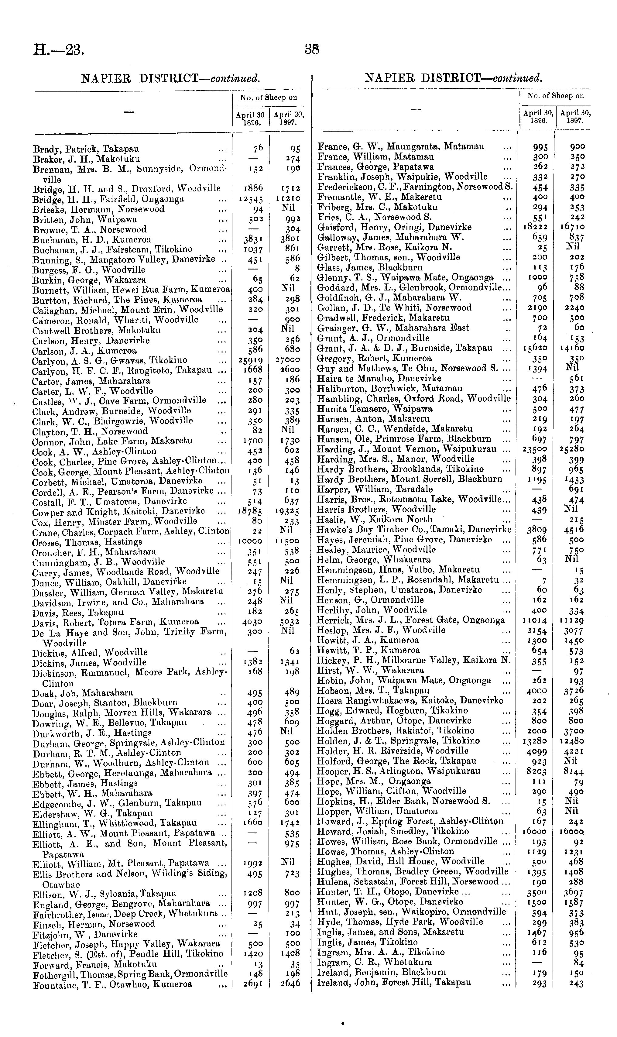No. off April 30, 1886. Sheep on , April 30, 1897. France, G. W., Maungarata, Matamau Franco, William, Matamau Frances, Q-oorge, Papatawa Franklin, Joseph, Waipukie, Woodville Frederickson, C. F., Farnington, Norsewood S. Fremantle, W. E., Makeretu Friberg, Mrs. 0., Makotuku Fries, 0. A., Norsewood S. Gaisford, Henry, Oringi, Danevirke Galloway, James, Maharahara W. Garrctt, Mrs. Rose, Kaikora N. Gilbert, Thomas, sen., Woodville Glass, James, Blackburn Glenny, T, S., Waipawa Mate, Ongaonga ... Goddard, Mrs. L., Glenbrook, Ormondville... Goldfinoh, G. J., Maharahara W. Gollan, J. D., Tβ Whiti, Norsewood Gradwell, Frederick, Makaretu Grainger, G. W., Maharahara Bast Grant, A. J., Ormondville Grant, J. A. & D. J., Burnside, Takapau ... Gregory, Robert, Kumeroa Guy and Mathews, Tβ Ohu, Noreewood S. ... Haira te Manaho, Danevirke Haliburton, Borthwick, Matamau Hambling, Charles, Oxford Road, Woodville Hanita Temaero, Waipawa Hansen, Anton, Makaretu Hansen, C. C, Wendside, Makaretu Hansen, Ole, Primrose Farm, Blackburn Harding, J., Mount Vernon, Waipukurau ... Harding, Mrs. S., Manor, Woodville Hardy Brothers, Brooklands, Tikokino Hardy Brothers, Mount Sorrell, Blackburn Harper, William, Taradale Harris, Bros., Rotomaotu Lake, Woodville... Harris Brothers, Woodville Haslie, W., Kaikora North Hawke's Bay Timber Oo., Tamaki, Danevirke Hayes, Jeremiah, Pine Grove, Danevirke Healey, Maurice, Woodville Helm, George, Wliakarara Hemmingeen, Hans, Valbo, Makaretu Ilemmingsen, L. P., Rosendahl, Makaretu ... Henly, Stephen, Umataroa, Danevirke Henson, G., Ormondville Herliliy, John, Woodvillo Herrick, Mrs. J. L., Forest Gate, Ongaonga Heslop, Mrs. J. P., Woodville Hewitt, J. A., Kumeroa Hewitt, T. P., Kumeroa Hickey, P. H., Milbourne Valley, Kaikora N. Hirst, W. W., Wakarara Hobin, John, Waipawa Mate, Ongaonga Ilobson, Mrs. T., Takapau Hoera Rangiwhakaewa, Kaitoke, Danevirke Hogg, Bdwordj Hogburn, Tikokino Iloggard, Arthur, Otope, Danevirke Holden Brothers, Rakiatoi, 'likokino Holden, J. & T., Springvale, Tikokino Holder, H. R. Riverside, Woodville Holford, George, The Rock, Takapau Hooper, H. S., Arlington, Waipukurau Hope, Mrs. M., Ongaonga Hope, William, Clifton, Woodville Hopkins, H., Elder Bank, Norsewood S. Hopper, William, Umatoroa Howard, J., Epping Forest, Ashley-Clinton Howard, Josiah, Smedley, Tikokino ... ' Howes, William, Rose Bank, Ormondville ... Howse, Thomas, Ashley-Clinton ... Hughes, David, Hill House, Woodville ... Hughes, Thomas, Bradley Green, Woodville Hulena, Sebastain, Forest Hill, Norsewood ... Hunter, T. H., Otope, Danevirke ... ... | Hunter, W. G., Otope, Danevirke ... ■ Hutt, Joseph, sen., Waikopiro, Ormondville Hyde, Thomas, Hyde Park, Woodville Inglis, James, and Sons, Makaretu Inglis, James, Tikokino Ingram, Mrs. A. A., Tikokino Ingram, C. R., Whetukura Ireland, Benjamin, Blackburn Ireland, John, Forest Hill, Takapau 995 300 262 332 454 400 294 55' 18222 6 59 25 200 115 1000 96 7°5 2190 700 72 164 15620 35° ■394 476 304 500 219 192 697 235°° 398 897 ■■95 438 439 3809 586 771 63 QOO 25° 272 270 335 400 253 242 16710 837 Nil 202 176 758 88 708 2240 500 60 '53 14160 35° Nil 56' 373 260 477 197 264 797 25280 399 965 ■453 691 474 Nil 215 45' 6 500 75° Nil 7 60 162 32 63 162 400 11014 2'54 13°° 654 355 262 4000 202 354 800 2000 13280 4099 923 8203 111 290 '5 63 167 16000 334 11129 3077 M5° 573 ■5 2 97 '93 3726 265 398 800 37°° 12480 4221 Nil 8144 79 49° Nil Nil 242 16000 '93 1129 500 '395 190 35°° 1500 394 ; 299 1467 612 116 92 '231 468 1408 288 3697 ■587 373 383 95 6 53° 95 84 •50 I 243 ■79 293 I