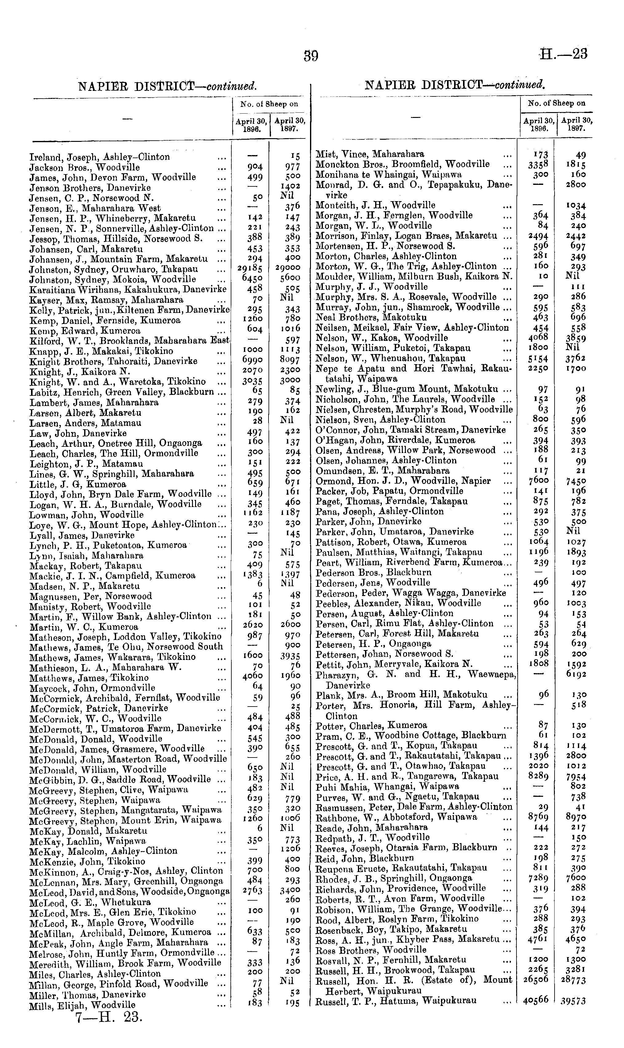 No. of Sheep on April 30, 1896. April 30, 1897. Mist, Vince, Maharabara Monckton Bros., Broomfiold, Woodville Monihana te Whaingai, Waipawa Monrad, D. G. and 0., Tepapakuku, Danevirke Monteith, J. H., Woodville Morgan, J. H, Fernglen, Woodville Morgan, W. L., Woodville Morrison, Finlay, Logan Braes, Makaretu ... Mortensen, H. P., Norsewood S. Morton, Charles, Ashley-Clinton Morton, W. G., The Trig, Ashley-Clinton ... Moulder, William, Milburn Bush, Kiiikora N. Murphy, J. J., Woodville Murphy, Mrs. S. A., Eoeevale, Woodville ... Murray, John, jun., Shamrock, Woodville ... Neal Brothers, Makotuku Neilsen, Meikael, Fair View, Ashley-Clinton Nelson, W., Kakoa, Woodville Nelson, William, Puketoi, Takapau Nelson, W., Whenuahou, Takapau Nepe te Apatu and Hori Tawhai, Rakautatahi, Waipawa Ncwling, J., Blue-gum Mount, Makotuku ... Nicholson, John, The Laurels, Woodville ... Nielsen, Chresten, Murphy's Road, Woodville Nielson, Sven, Ashley-Clinton O'Connor, John, Tamaki Stream, Danevirke O'llagan, John, Riverdale, Kumeroa Olsen, Andreas, Willow Park, Norsewood ... Olsen, Johannes, Ashley-Clinton Omundsen, E. T., Maharabara Ormond, Hon. J. D., Woodville, Napier Packer, Job, Papatu, Ormondville Paget, Thomas, Ferndale, Takapau Pana, Joseph, Ashley-Clinton Parker, John, Danevirke Parker, John, TJmataroa, Danevirke Pattison, Eobert, Otawa, Kumeroa Paulsen, Matthias, Waitangi, Takapau Peart, William, Rivcrbend Farm, Kumeroa... Pederson Bros., Blackburn Pedersen, Jens, Woodville Pederson, Peder, Wagga Wagga, Danevirke Peebles, Alexander, Nlkau, Woodville Persen, August, Aehley-Clinton Persen, Carl, Kimu Flat, Ashley-Clinton ... Petorsen, Carl, Forest Hill, Makaretu Petersen, H. P., Ongaonga Pettersen, Johan, Norsewood S. Pettit, John, Merry vale, Kaikora N. Pharazyn, Gγ. N. and H. H., Waewaepa, Danevirke Plank, Mrs. A., Broom Hill, Makotuku Porter, Mrs. Honoria, Hill Farm, AshleyClinton Potter, Charles, Kumeroa Pram, 0. E., Woodbine Cottage, Blackburn Prescott, Or. and T., Kopua, Takapau PrescOtt, G. and Tγ, Rakautatahi, Takapau ... Prescott, G. and T., Otawhao, Takapau Price, A. H. and R., Tangarewa, Takapau Puhi Mahia, Whangai, Waipawa Purves, W. and Gγ., Ngaetu, Takapau Rasmusscn, Peter, Dale Farm, Ashley-Clinton Rathbone, W., Abbotsford, Waipawa Reade, John, Maharahara Redpath, J. T., Woodville Reeves, Joseph, Otaraia Farm, Blackburn .. Reid, John, Blackburn Reupona Eruete, Rakautatahi, Takapau Rhodes, J. B., Springhill, Ongaonga Richards, John, Providence, Woodville Roberts, R. T., Avon Farm, Woodville Robison, William, The Grange, Woodville... Rood, Albert, Roslyn Farm, Tikokino Rosenback, Boy, Takipo, Makaretu Ross, A. H., jun., Khyber Pass, Makaretu ... Ross Brothers, Woodville Rosvall, N. P., Fernhill, Makaretu Russell, H. H., Brookwood, Takapau Russell, Hon. H. R. (Estate of), Mount Herbert, Waipukurau Russell, T. P., Hatuma, Waipukurau 173 3358 300 49 1815 160 2800 364 84 2494 S9 6 281 160 •°34 384 240 2442 697 349 293 Nil 111 286 583 696 558 3859 Nil 3762 1700 10 290 595 463 454 4068 1800 5>54 2250 97 •52 63 800 265 394 188 61 117 7600 141 875 292 53° 530 1064 1196 239 9" 98 76 59 6 35° 393 213 99 21 745° 196 782 375 500 Nil 1027 ■893 192 100 497 120 496 960 94 53 263 594 198 1808 1003 ■53 54 264 629 200 '592 6192 I 6 '3° 5>8 87 61 814 1396 2020 8289 130 102 1114 2800 1012 7954 802 738 41 8970 217 ■5° 272 275 39° 7600 288 102 29 8769 144 222 198 811 7289 3'9 376 288 385 4761 394 293 37& 4650 72 1300 3281 28773 1200 2265 26506 40566 39573