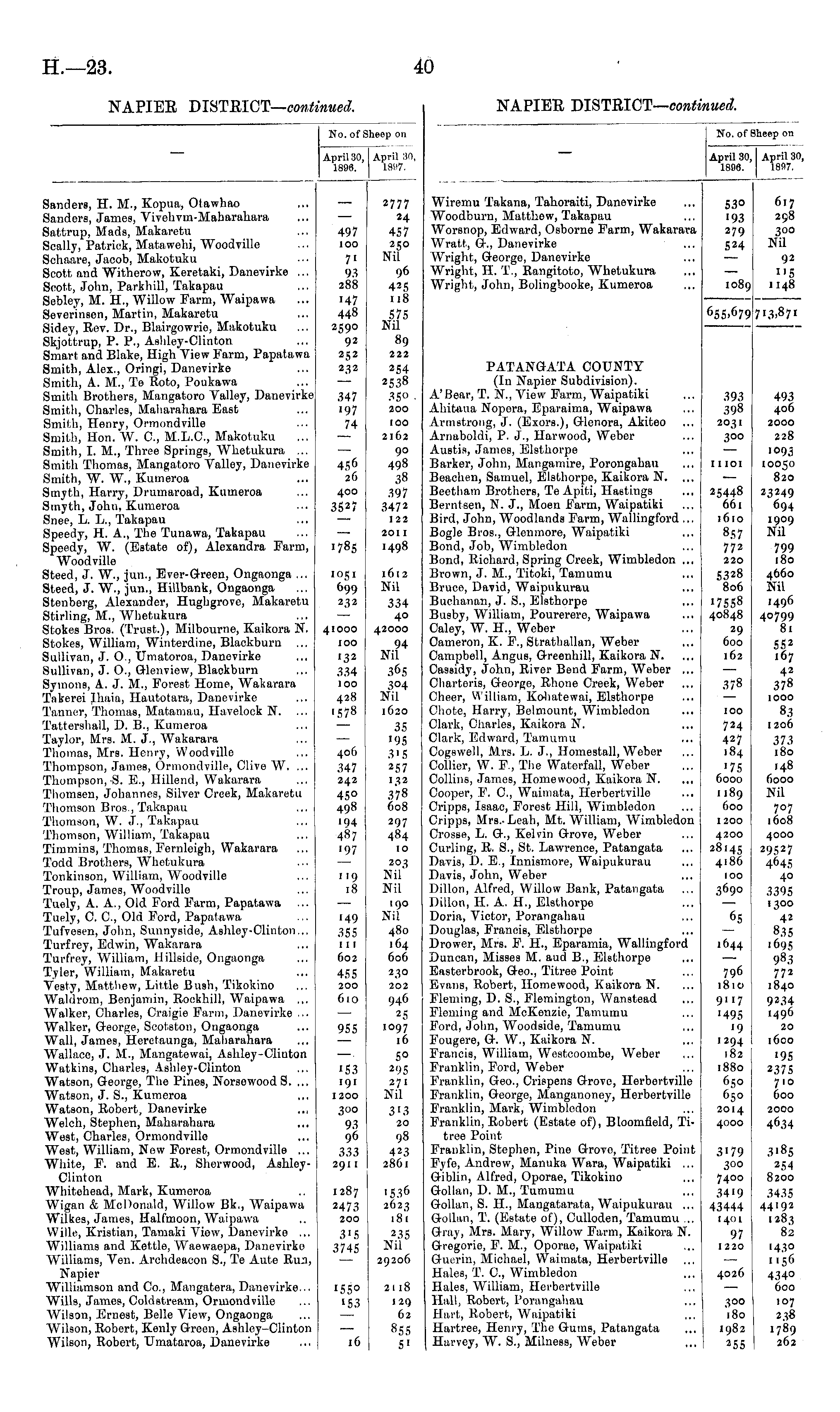 No. of Bheep on April 30, April 30, 1896. 1897. Wiromu Takana, Tahoraiti, Danevirke Woodburn, Matthew, Talapau Worsnop, Edward, Osborne Farm, Wakarava Wratt, CK, Danevirke Wright., Georgo, Danevirke Wright, H. T., Rangitoto, Whetukura Wright, John, Bolingbooke, Kumeroa 53° 193 279 S24 617 298 300 Nil 92 1 'S 1148 1089 6 5S.679 7'3,871 PATANGATA COUNTY (In Napier Subdivision). A'Uear, T. N., View Farm, Waipatiki Ahitima Nopera, Eparaima, Waipawa Armstrong, J. (Exors.), G-lenora, Akiteo Arnaboldi, P. J., Harwood, Weber Austin, James, Elsthorpe Barker, Jolm, Mangamire, Porongahau Beaolien, Samuel, Elsthorpe, Kaikora N. Beethatn Brotliers, TeApiti, Hastings Berntsen, N. J., Moen Farm, Waipatiki Bird, John, Woodlands Farm, Wallingford ... Bogle Bros., GHenmorc, Waipatiki Bond, Job, Wimbledon Bond, Richard, Spring Creek, Wimbledon ... Brown, J. M., Titoki, Tamumu Bruce, David, Waipukurau ... Buchanan, J. S., Elsthorpe Busby, William, Pourerere, Waipawa Caley, W. H., Weber Cameron, K. F., Stratliallan, Weber Campbell, Angus, Greenhill, Kaikora N. Cassidy, John, River Bend Farm, Weber ... Charteris, George, Rhone Creek, Weber Cheer, William, Kohatewai, Elsthorpe Chofce, Harry, Bclmount, Wimbledon Clark, Charles, Kaikora N. Clark, Edward, Tanmmu Cogswell, Mrs. L. J., Homestall, Weber Collier, W. F., The Waterfall, Weber Collins, James, Homewood, Kaikora N. Opoper, Fi C, Waitnata, Herbertville Cripps, Isaac, Forest Hill, Wimbledon Cripps, Mrs. Leah, Mt. William, Wimbledon Crosse, L. G., Kelvin Grove, Weber Curling, R, S., St. Lawrence, Patangata Davis, D. E., Innismore, Waipukurau Davis, John, Weber Dillon, Alfred, Willow Bank, Patangata Dillon, H. A. H., Elsthorpe Doria, Victor, Porangahau Douglas, Francis, Elsthorpo Drowor, Mrs. F. II., Eparamia, Wallingford Duncan, Misses M. aud B., Elsthorpe Easterbrook, Geo., Titree Point Evans, Robert, Homewood, Kaikora N. Fleming, D. S., Flemington, Wanstead Fleming and McKenzie, Tamumu Ford, John, Woodside, Tamumu Fougere, G. W., Kaikora N. Francis, William, Westcoombe, Weber Franklin, Ford, Weber Franklin, Geo., Crispens Grove, Herbertville Franklin, George, Manganoney, Herbertville Franklin, Mark, Wimbledon Franklin, Robert (Estate of), Bloomfield, Titree Point Franklin, Stephen, Pine Grove, Titree Point Fyf'e, Andrew, Manuka Wara, Waipatiki ... β-iblin, Alfred, Oporae, Tikokino β-ollun, D. M., Tumumu β-ollan, S. H., Mangatarata, Waipukurau ... Gollan, T. (Estate of), Culloden, Tamumu ... Gray, Mrs. Mary, Willow Farm, Kaikora N. Gregorie, F. M., Oporae, Waipatiki Gucriii, Michael, Waiinata, Herbortville Hales, T. C, Wimbledon Hales, William, Herbertville Hall, Robert, Porangahau Hart, Robert, Waipatiki Hartree, Henry, The Gums, Patangata Harvey, W. S., Milness, Weber 393 398 2O 3' 3°° I I IOI 25448 661 1610 8.57 772 220 5328 806 175.58 40848 29 600 162 378 100 724 427 184 ■75 6000 1189 600 1200 4200 28145 4186 100 3690 493 406 2000 228 ■°93 10050 820 23249 694 1909 Nil 799 180 4660 Nil 1496 40799 81 55 2 167 42 378 1000 83 1206 373 180 .48 6000 Nil 707 1608 4000 29527 4645 40 3395 1300 _65 1644 42 835 1695 983 772 1840 9 2 34 1496 20 1600 796 1810 9117 '495 ") 1294 182 1880 650 650 2014 4000 '95 2375 7 10 600 2000 4634 3179 300 7400 34'9 43444 1401 97 1220 3'85 254 8200 3435 44192 1283 82 4026 '43° 1.56 434° 600 300 180 1982 a 55 107 238 1789 262