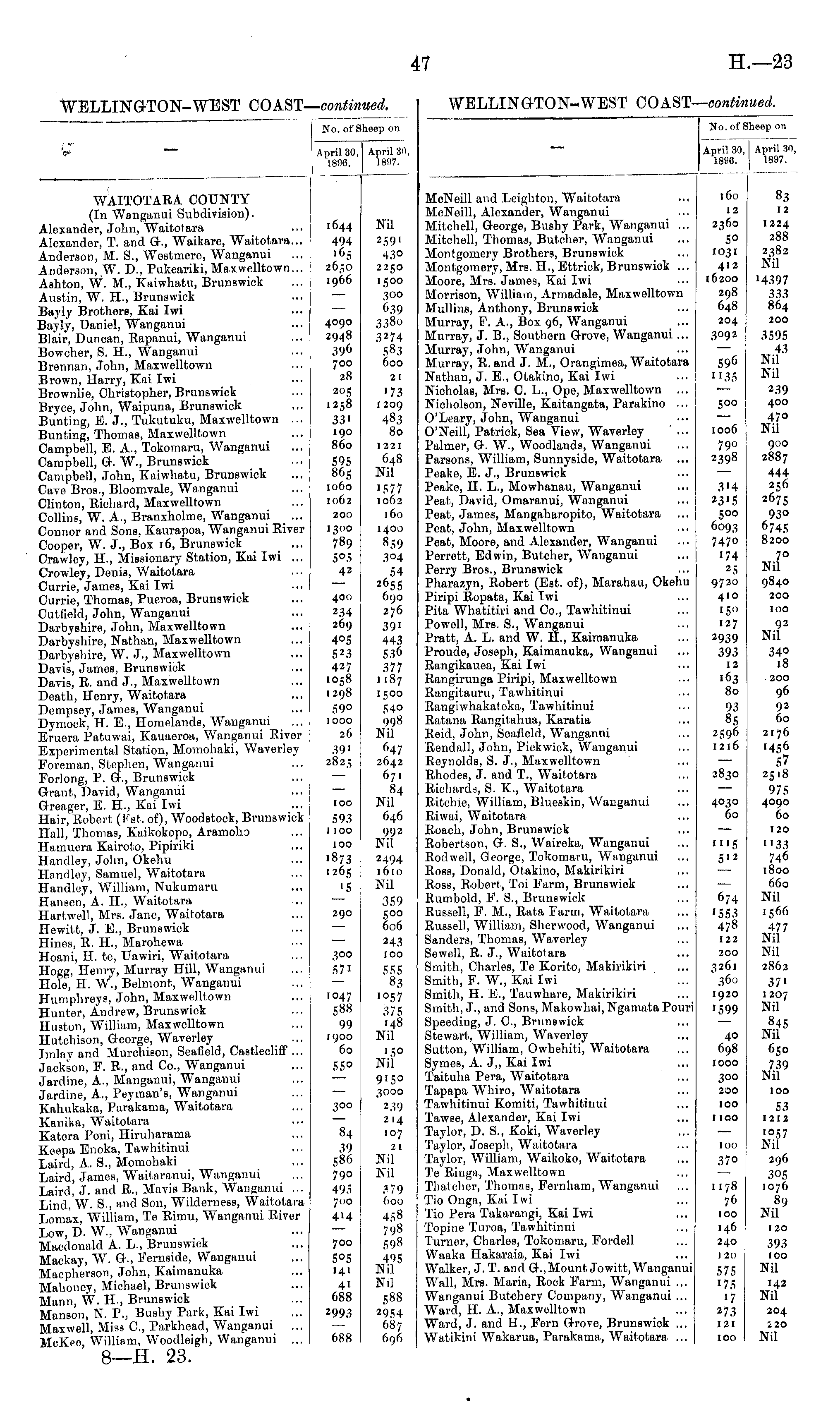 No. of 5 iheop on April 30, 1897. April 30, 1898. MoNoill and Lcighton, Wailotara McNoill, Alexander, Wanganui Mitchell, George, Bushy Park, Wanganui ... Mitchell, Thomas, Butcher, Wanganui Montgomery Brothers, Brunswick Montgomery, Mrs. H., Ettrick, Brunswick ... Moore, Mrs. James, Kai Iwi Morrison, William, Armadale, Maxwelltown Mullins, Anthony, Brunswick Murray, P. A., Box 96, Wanganui Murray, J. B., Southern Grove, Wanganui... Murray, John, Wanganui Murray, R. and J. M., Orangimea, Waitotara Nathan, J. B., Otakino, Kai Iwi Nicholas, Mrs. C. L., Ope, Maxwelltown ... Nicholson, Neville, Kaitangata, Parakino ... O'Leary, John, Wanganui O'Neill, Patrick, Sea View, Waverley ... Palmer, G. W., Woodlands, Wanganui Parsons, William, Sunnyside, Waitotara Peake, E. J., Brunswick Peake, H. L., Mowhanau, Wanganui Peat, David, Omaranui, Wanganui Peat, James, Mangaharopito, Waitotara Peat, John, Maxwelltown Peat, Moore, and Alexander, Wanganui ... Perrett, Edwin, Butcher, Wanganui Perry Bros., Brunswick Pharazyn, Robert (Est. of), Marahau, Okehu Piripi Ropata, Kai Iwi Pita Whatitiri and Co., Tawhitinui Powell, Mrs. S., Wanganui Pratt, A. L. and W. H., Kaimanuka Proude, Joseph, Kaimanuka, Wanganui Rangikauea, Kai Iwi Rangirunga Piripi, Maxwelltown Rangitauru, Tawhitinui Rangiwhakaloka, Tawhitinui Batana Rangitahua, Karatia Reid, John, Sean'eld, Wanganni Rendall, John, Pickwick, Wanganui Reynolds, S. J., Maxwelltown Rhodes, J. and T., Waitotara Richards, S. K., Waitotara Ritchie, William, Blueskin, Wanganvii Riwai, Waitotara Roach, John, Brunswick Robertson, G. S., Waireka, Wanganui Rod well, George, Tokomaru, Wnnganui Ross, Donald, Otakino, Makirikiri Ross, Robert, Toi Farm, Brunswick Rumbold, F. S., Brunswick Russell, F. M., Enta Farm, Waitotara Russell, William, Sherwood, Wanganui Sanders, Thomas, Waverley Sewell, R. J., Waitotara Smith, Charles, To Korito, Makirikiri Smith, F. W., Kai Iwi Smith, H. E., Tauwhare, Makirikiri Smith, J., and Sons, Makowhai, Ngamata Pouri Speeding, J. C, Brunswick Stewart, William, Waverley Sutton, William, Owhehiti, Waitotara Symes, A. J,, Kai Iwi Taituha Pera, Waitotara Tapapa Whiro, Waitotara Tawhitinui Komiti, Tawhitinui Tawse, Alexander, Kai Iwi Taylor, D. S., Koki, Waverley Taylor, Joseph, Waitotara Taylor, William, Waikoko, Waitotara Te Ringa, Maxwelltown Thatcher, Thomas, Fernham, Wanganui Tio Onga, Ktti Iwi Tio Pera Takarangi, Kai Iwi Topine Turoa, Tawhitinui Turner, Charles, Tokomaru, Fordell Waaka Hakaraia, Kai Iwi Walker, J. T. and G.,Mount Jowitt,Wanganui Wall, Mrs. Maria, Rock Farm, Wanganui ... Wanganui Butchery Company, Wanganui ... Ward, II. A., Maxwelltown Ward, J. and H., Fern Grove, Brunswick ... Watikini Wakarua, Parakama, Waitotara ... 160 83 12 12 2360 5° 1031 412 16200 298 648 204 3092 1224 288 2382 Nil '4397 333 864 200 3595 43 Nil Nil 59 6 '«3S 500 1006 790 2398 239 400 470 Nil 3'4 23'5 500 6093 7470 '74 2 5 9720 410 15° 127 2939 393 12 163 80 93 8S 2596 1216 900 2887 444 256 2675 93° 6745 8200 70 Nil 9840 200 100 92 Nil 34° 18 2830 4030 60 1115 5'2 .200 96 92 60 2176 '4.5" 57 2518 975 4090 60 120 "33 746 1800 660 Nil 1566 477 Nil Nil 2862 37' 1207 Nil 845 Nil 650 739 Nil 674 '553 478 122 200 3261 360 1920 '599 40 698 1000 300 200 100 1100 100 S3 1212 '°S7 Nil 100 37° 296 305 1076 89 Nil 1.78 76 100 146 240 120 575 '75 '7 273 121 100 120 393 100 Nil 142 Nil 204 220 Nil