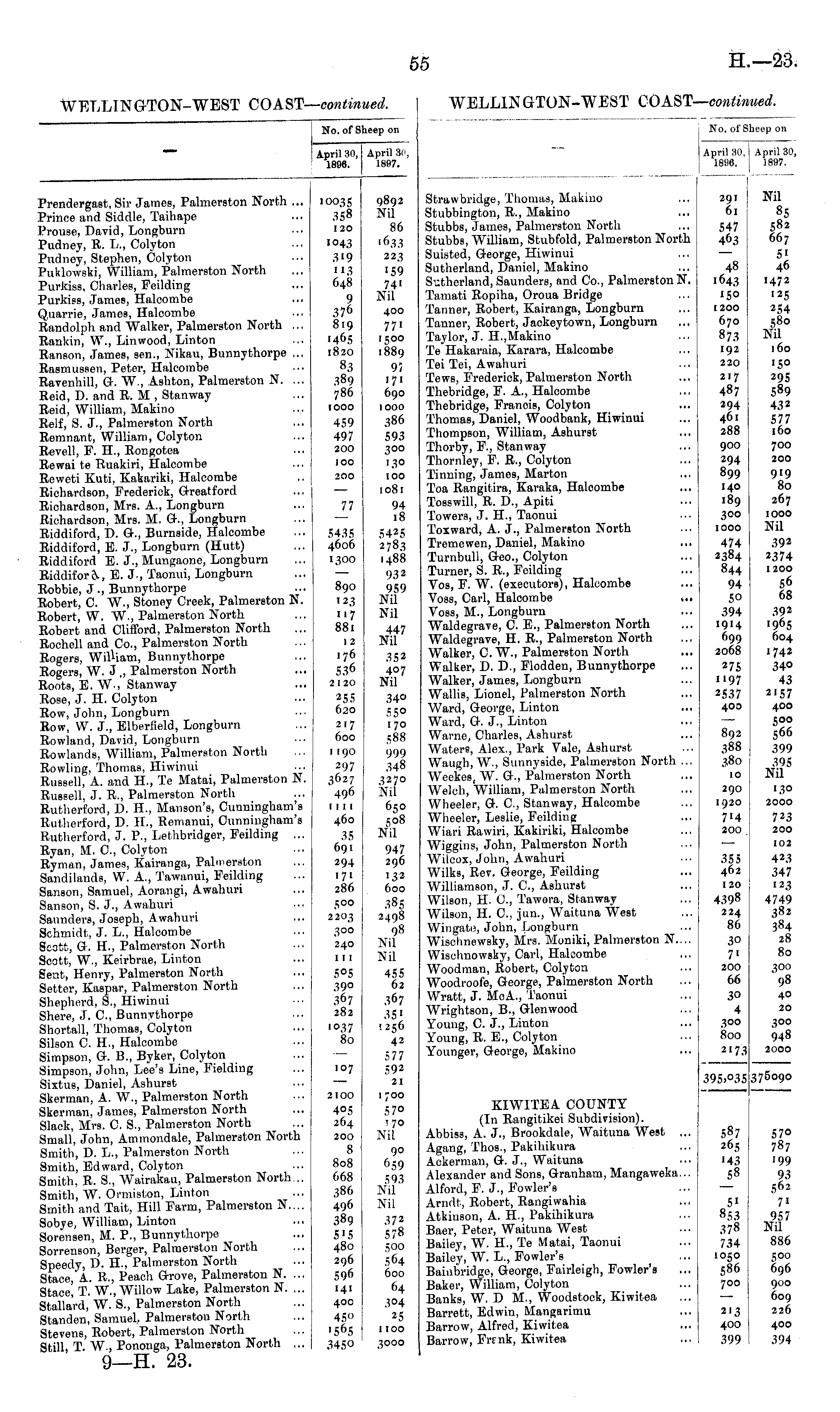 No. of Sheep on April 30, April 80, 1896. 1897. Prendergast, Sir James, Palmerston North ... Prince and Siddle, Taihape Prouse, David, Longburn Pudney, R. L., Colyton Pudney, Stephen, Colyton Puttowski, William, Palmerston North Purkiss, Charles, Feilding Purkiss, James, Halcombe Quarrie, James, Halcombe Randolph and Walker, Palmerston North ... Eankin, W., Linwood, Linton Ranson, James, sen., Nikau, Bunnythorpe ... Rasmuseen, Peter, Halcombe Ravenhill, Or. W., Ashton, Palmerston N. ... Reid, D. and R. M , Stanway Reid, William, Makino Relf, S. J., Palmereton North Remnant, William, Colyton Revell, P. H., Rongotea Rewai te Ruakiri, Halcombe Reweti Kuti, Kakariki, Halcombe Richardson, Frederick, Greatford Richardson, Mrs. A., Longburn Richardson, Mrs. M. &., Longburn Riddiford, I). &., Burnside, Halcombe Riddiford, B. J., Longbarn (Hutt) Riddiford E. J., Mungaone, Longburn Riddiford, E. J., Taonui, Longburn Robbie, J ., Bunnythorpe Robert, C. W., Stoney Creek, Palmereton N. Robert, W. W., Palmerston North Robert and Clifford, Palmerston North Rochell and Co., Palmerston North Rogers, Witiiam, Bunnythorpe Rogers, W. 3 ., Palmerston North Roots, B. W-, Stanway Rose, J. H. Colyton Row, John, Longburn Row, W. J., Elberfield, Longburn Rowland, David, Longburn Rowlands, William, Palmerston North Rowling, Thomas, Hiwinui Russell, A. and H., Te Matai, Palmerston N. Russell, J. R., Palmerston North Rutherford, D. H., Manson's, Cunningham's Rutherford, D. IT., Remanui, Cunningham's Rutherford, J. P., Lethbridger, Feilding ... Ryan, M. C, Colyton Ryman, James, Kairanga, Palmereton Sandilands, W. A., Tawanui, Feilding Sanson, Samuel, Aorangi, Awahuri Sanson, S. J., Awahuri Saunders, Joseph, Awahuri Schmidt, J. L., Halcombe Scott, Gγ. H., Palmerstion North Scott, W., Keirbrae, Linton Sent, Henry, Palmerston North Setter, Kaspar, Palmerston North Shepherd, S., Hiwinui Shere, J. C, Bunnythorpe Shortall, Thomas, Colyton Silson C. II., Halcombe Simpson, G. B., Byker, Colyton Simpson, John, Lee's Line, Fielding Sixtus, Daniel, Ashurst Skerman, A. W., Palmerston North Skerman, James, Palmerston North Slack, Mrs. C. S., Palmerston North Small, John, Atnmondale, Palmerston North Smith, D. L., Palmerston North Smith, Edward, Colyton Smith, R. S., Wairakau, Palmerston North... Smith, W. Oi'miston, Linton Smith and Tait, Hill Farm, Palmerston N.... Sobye, William, Linton Sorensen, M. P., Bunnythorpe Sorrenson, Berger, Palmereton North Speedy, D. H., Palmerston North Stace, A. R., Peach Grove, Palmereton N. ... Stace, T. W., Willow Lake, Palmerston N. ... Stallard, W. S., Palmerston North Standen, Samuel, Palmerston North Stevens, Robert, Palmerston North Still, T. W., Pononga, Palmereton North ... 10035 120 '043 319 J 13 648 9 376 819 M&5 1820 83 389 786 1000 459 497 200 100 200 77 S43S 4606 1300 890 123 117 881 12 I7 6 536 2120 255 620 217 600 1190 297 3627 496 Mil 460 35 691 294 171 286 500 2203 300 240 111 5°5 39° 367 282 9892 Nil 86 223 '59 741 Nil 400 771 1500 1889 9/ 171 690 1000 386 593 300 130 100 1081 94 18 5425 2783 1488 932 9S9 Nil Nil 447 Nil 352 407 Nil 34° 55° 170 588 999 348 3270 Nil 650 5°8 Nil 947 296 132 600 38S 2498 98 Nil Nil 455 62 367 35' 1256 42 577 592 21 1700 57° 170 Nil IO 37 80 107 2100 4°5 264 200 8 808 668 386 496 389 S'5 480 296 59 6 141 400 45° '5 6 5 3450 90 6S9 593 Nil Nil 372 578 500 564 600 64 3°4 25 1100 3000