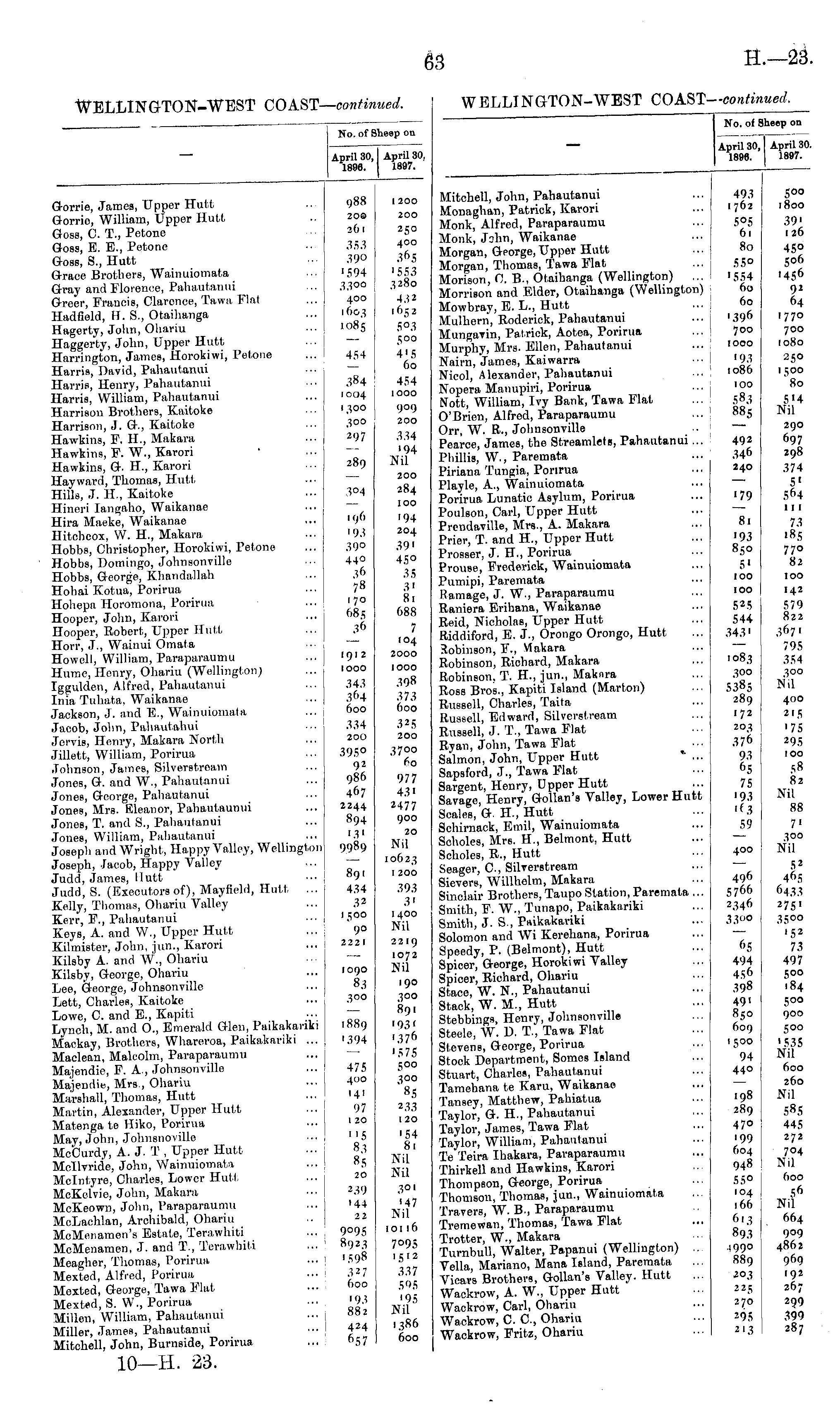 No. of Sheep on April 30, April 30. 1896. 1897. Mitchell, John, Pahautanui Monaghan, Patrick, Karori Monk, Alfred, Paraparaumu Monk, Jcjhn, Waikanae Morgan, George, Upper Hutt Morgan, Thomas, Tawa Mat Morison, 0. B., Otaihanga (Wellington) ... Morrison and Elder, Otaihanga (Wellington) Mowbray, B. L., Hutt Mulhern, Roderick, Pahautanui Mungarin, Pal-rick, Aotea, Porirua Murphy, Mrs. Ellen, Pahautanui Nairn, James, Kaiwarra Nicol, Alexander, Pahautanui Nopera Manupiri, Porirua Nott, William, Ivy Bank, Tawa Flat O'Brien, Alfred, Paraparaumu Orr, W. R., Johnsonville Pearce, James, the Streamlets, Pahautanui... Phillis, W., Paremata Piriana Tungia, Porirua Playle, A., Wainuiomata Porirua Lunatic Asylum, Porirua Poulson, Carl, Upper Hutt Prcndaville, Mrs., A. Makara Prier, T. and H., Upper Hutt Prosser, J. FT., Porirua Prouse, Frederick, Wainuiomata Pumipi, Paremata Ramage, J. W., Paraparaumu Raniera Erihana, Waikanae Roid, Nicholas, Upper Hutt Ridriiford, E. J., Orongo Orongo, Hutt Xobinson, F., Makara Robinson, Richard, Makara Robinson, T. H., jun., Makiira Ross Bros., Kapiti Island (Marton) Russell, Charles, Taita Russell, Edward, Silvcrstream Russell, J. T., Tawa Flat Ryan, John, Tawa Flat Salmon, John, Upper Hutt % ... Sapsford, J., Tawa Flat Sargent, Henry, Upper Hutt ... Savage, Henry, (Mian's Valley, Lower Hutt Scales, G. H., Hutt Schirnack, Emil, Wainuiomata Scholes, Mrs. H., Belmont, Hutt Scholee, R., Hutt Seager, C Silrerstream Sievers, Willhelm, Makara Sinclair Brothers, Taupo Station, Paremata ... Smith, F. W., Tunapo, Paikakariki Smith, J. S., Prtikakariki Solomon and Wi Kerehana, Porirua Speedy, P. (Belmont), Hutt Spicer, G-eorge, Horokiwi Valley Spieer, Richard, Ohariu Stace, W. N., Pahautanui Stack, W. M., Hutt Stebbings, Henry, Jolmeonville Steele, W. D. T., Tawa Flat Stevene, George, Porirua Stock Department, Somes Island Stuart, Charles, Pahautanui Tamehana te Karu, Waikanae Tansey, Matthew, Pahiatua Taylor, G. H., Pahautanui Taylor, James, Tawa Flat Taylor, William, Pahautanui Te Teira Ihakara, Paraparaumu Thirkell and Hawkins, Karori Thompson, George, Porirua Thomson, Thomas, jun., Wainuiomata Travers, W. B., Paraparaumu Tremewan, Thomas, Tawa Mat Trotter, W., Makara .,_*,„. . " Tiirnbull, Walter, Papanui (Wellington) ... Vella, Mariano, Mana Island, Paremata Vicars Brothers, Gollan's Valley. Hutt Wackrow, A. W., Upper Hutt Wackrow, Carl, Ohariu Waekrow, C. C, Ohariu Wackrow, Fritz, Ohariu 493 1762 5°5 61 80 5.5° 1 S.S4 60 60 '39 6 700 1000 '93 1086 100 583 885 492 34 6 240 '79 81 '93 850 5' 100 100 52.5 544 343' 1083 300 5385 289 .72 203 376 93 65 75 '93 ■<■» 59 s°° 1800 39' 126 45° 506 '45 6 9 2 64 1770 700 1080 250 1500 '8o 5'4 Nil 290 697 298 374 5' 564 111 73 185 77° 82 100 142 579 822 367' 795 354 Nil 400 *i1 '75 2Q5 100 58 82 Nil 88 7' Nil 400 496 5766 2346 3W° f'S 494 45<> 398 49' 850 609 15 00 94 440 198 289 47° 199 604 948 55° 104 166 613 893 .1990 889 203 225 270 295 *'S 52 4f>5 6433 275' 35°° '5 2 73 497 5°° 184 500 900 500 '535 Nil 600 260 Nil 585 445 272 704 Nil 600 56 Nil 664 909 4862 969 192 267 299 399 287