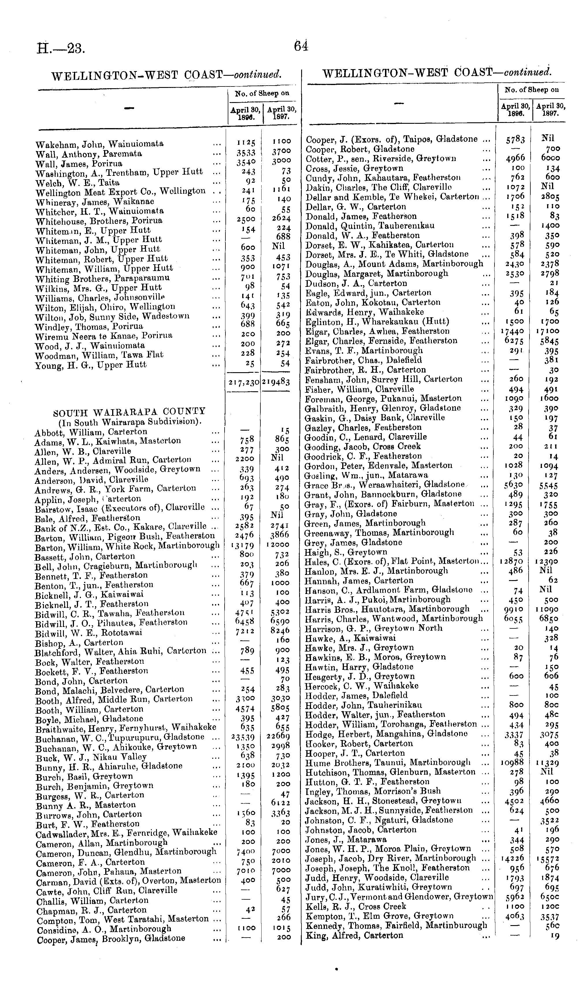 No. of Sheep on April 30, April 30, 1896. 1897. Wakeham, John, Wainuiomala Wall, Anthony, Parcmata Wall, James, Porirua Washington, A., Trentham, Upper Hutt ... Welch, W. B., Taita Wellington Meat Export Co., Wellington . . WMneray, Jamos, Waikanae Whitchoi-, H. T., Wainuiomata Whitehouse, Brothers, Porirua Whitem.in, E., Upper Hutt Wliiteman, J. M., Upper Hutt Whiteman, John, Upper Hutt Whiteinan, Robert, Upper Hutt Wliiteman, William, Upper Hutt Whiting Brothers, Paraparaumu Wiikine, Mrs. &., Upper Hutt Williams, Charles, JohnsonvillH Wilton, Elijah, Ohiro, Wellington Wilton, Job, Sunny Side, Wadestown Windley, Thomas, Porirua Wiremu Neera te Kanae, Porirua Wood, J. J., Wainuiomata Woodman, William, Tawa Flat Young, H. G., Upper Hutt 1125 3533 354° 243 92 241 '75 60 2500 '54 600 353 900 7<n 98 141 643 399 688 I [00 37 00 3000 73 5° 1 161 140 55 ! 2624 224 688 Nil 2CO 200 228 453 1071 753 54 '35 542 319 665 200 272 254 54 219483 25 2 17,230 SOUTH WA1RARAPA COUNTY (In South Wairarapa Subdivision). Abbott, William, Carlerton Adama, W. L., Kaiwhata, Mastcrton Allen, W. B., Clareville Allen, W. P., Admiral Run, Carterton Anders, Andersen, Woodside, Greytown ... Anderson, David, Clareville Andrews, G. R, York Farm, Carterton Applin, Joseph, < arterton Bairstow, Isaac (Executors of), Claroville ... Bale, Alfred, Featherston Bank of N.Z., Bet, Co., Kakare, Clareville ... Barton, William, Pigeon Bush, Featherston Barton, William, White Rock, Martinbovough Bassett, John, Carterton Bell, John, Cragieburn, Martinborough Bennett, T. F., Feathorston Benton, T., jun., Featherston Bicknell, J. G., Kaiwaiwai Bicknell, J. T., Featherston Bidwill, 0. R., Tawaha, Featherston Bidwill, J. O., Pihautea, Featherston Bidwill, W. B., Rototavvai Bishop, A., Carterton Blatchford, Walter, Ahin Ruhi, Carterton ... Bock, Walter, Feathereton Bockett, F. V., Featherston Bond, John, Carterton Bond, Malachi, Belvedere, Carterton Booth, Alfred, Middle Run, Carterton Booth, William, Carterton Boyle, Michael, Gladstone Braithwaite, Henry, Fernyhurst, Waihakeke Buchanan, W.O.,Tupurupuru, Gladstone ... Buchanan, W. C, Ahikouke, Greytown Buck, W. J., Nikau Valley Bunny, H. R., Ahiaruhe, Gladstone Burch, Basil, Greytown Burch, Benjamin, Greytown Burgess, W'. R., Carterton Bunny A. R., Masterton Burrows, John, Carterton Burt, F. W., Featherston Cadwallader, Mrs. E., Fernridge, Waihakeke Cameron, Allan, Martinborough Cameron, Duncan, Glendhu, Martinborough Cameron, F. A., Carterton Cameron, John, Pahaua, Masterton Carman, David (Exts. of), Ovorton, Mastcrton Cawte, John, Cliff Run, Clareville Challis, William, Carterton Chapman, B. J., Carterton Compton, Tom, West Taratahi, Masterton ... Considine, A. O., Martinborough Cooper, James, Brooklyn, Gladstone 758 277 22OO 339 693 263 192 67 395 2582 2476 '3'79 800 203 379 667 "3 407 475' 6458 7212 789 455 '5 865 Nil 412 49° 274 180 5° Nil 2741 3866 1 2000 732 206 380 1000 100 400 5302 6590 824ft 160 900 '23 495 70 283 5805 427 655 22669 2998 73° 2032 1200 254 3100 4574 395 635 2 3539 1350 638 2100 '395 180 200 1560 83 100 47 6122 3363 20 100 200 200 7400 75" 7010 400 7000 2010 7000 500 627 45 57 266 42 1 100 1015 200
