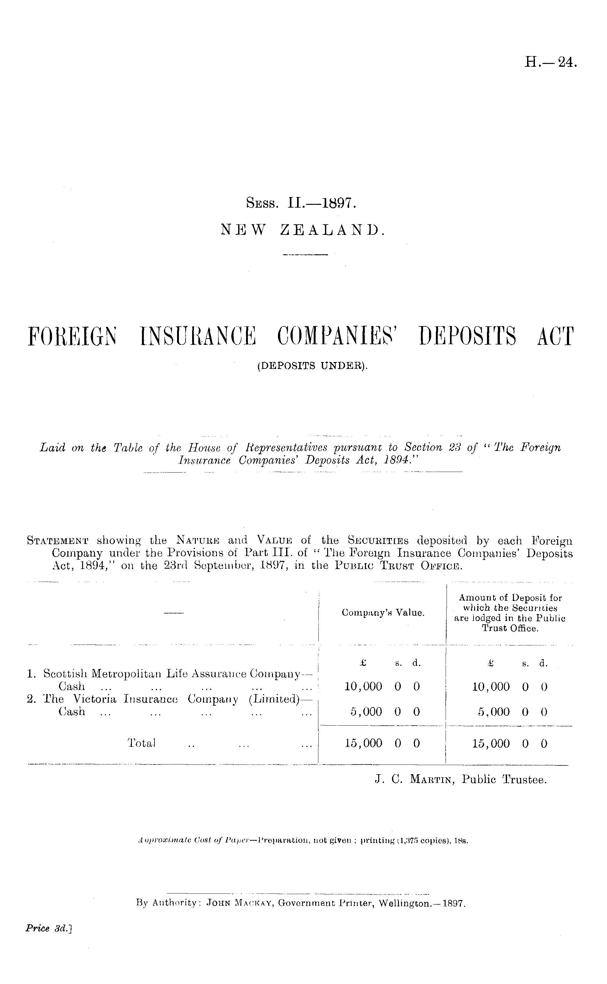 Company's Value. Amount of Deposit for which the Securities are iodged in the Public Trust Office. £ s. d. a s. d. .. Scottish Metropolitan Life Assurance Company— Cash ... ... ... ... ... !. The Victoria Insurance Company (Limited) — Cash 10,000 0 0 5,000 0 0 10,000 0 0 5,000 0 0 Total 15,000 0 0 15,000 0 0