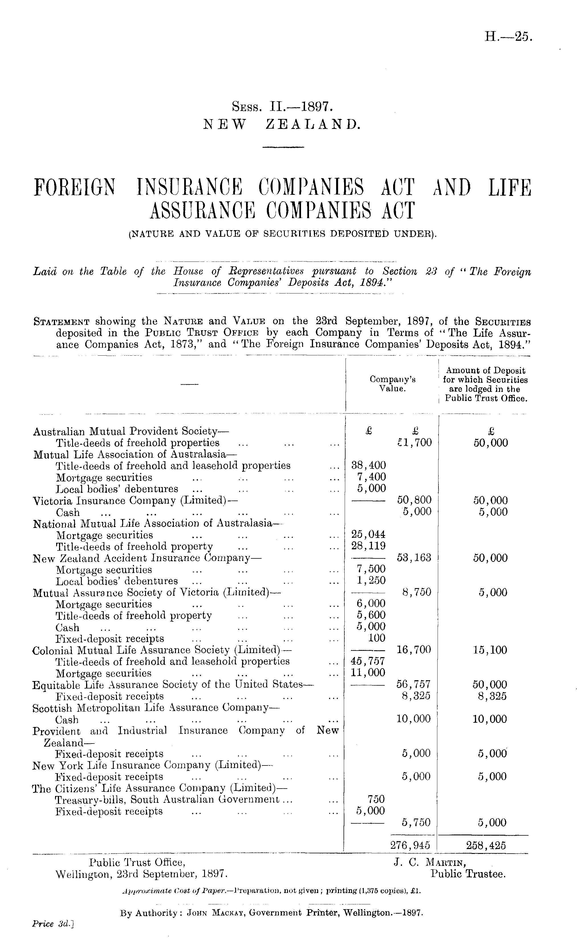 Statement showing the Nature and Value on the 23rd September, 1897, of the Securities deposited in the Public Trust Office by each Company in Terms of "The Life Assurance Companies Act, 1873," and "The Foreign Insurance Companies' Deposits Act, 1894."