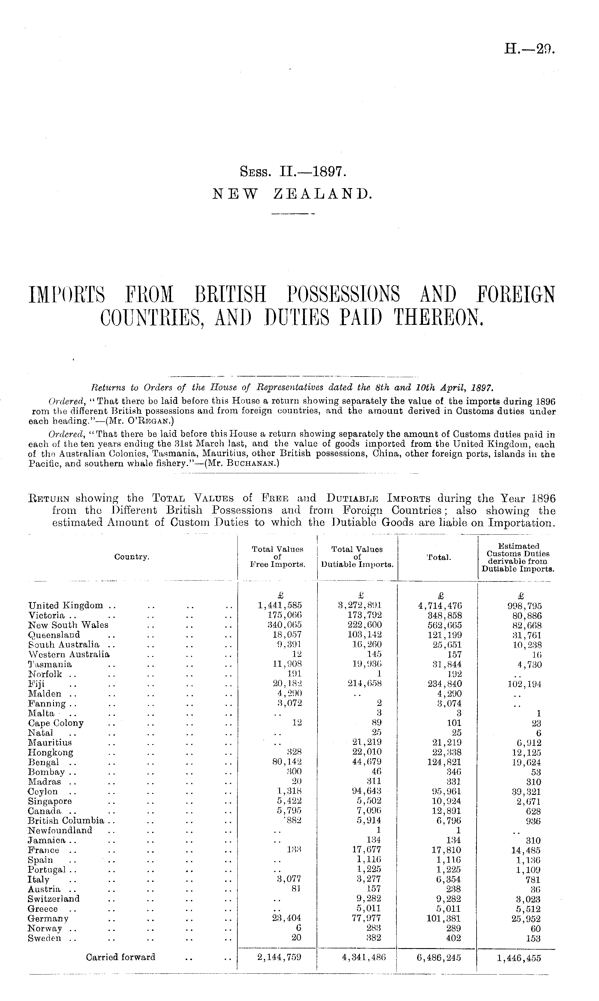 Returns to Orders of the House of Representatives dated the Bth and 10th April, 1897. Ordered, " That thero bo laid before this House a return showing separately the value of the imports during 1896 rom the different British possessions and from foreign countries, and the amount derived in Customs duties under each heading."—(Mr. O'Reqan.) Ordered, "That there be laid before this House a return showing separately the amount of Customs duties paid in each of the ten years ending the 31st March last, and the value of goods imported from the United Kingdom, each of the Australian Colonies, Tasmania, Mauritius, other British possessions, China, other foreign ports, islands In the Pacific, and southern whale fishery."—(Mr. Buchanan.)