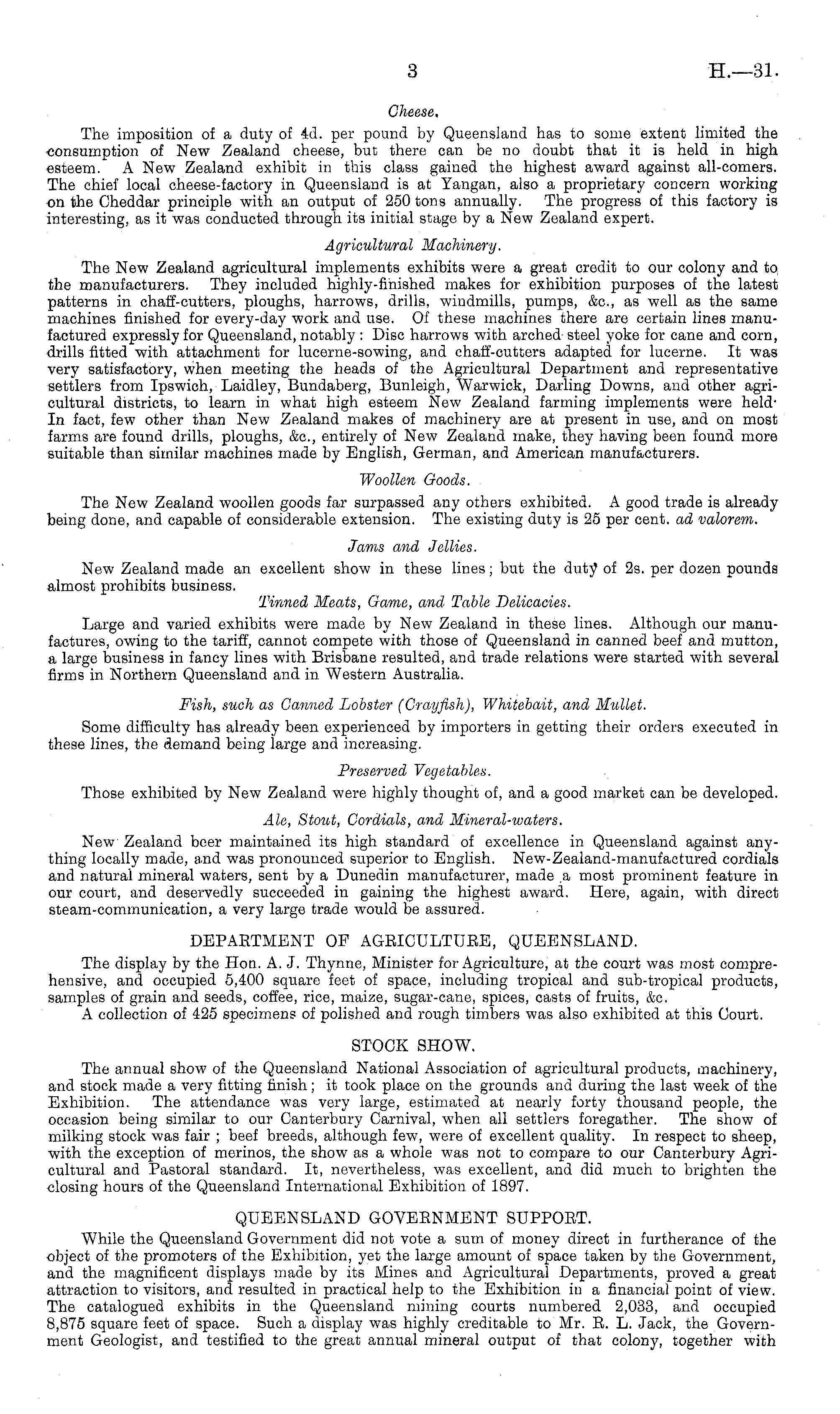 Cheese. The imposition of a duty of 4d. per pound by Queensland has to some extent limited the consumption of New Zealand cheese, but there can be no doubt that it is held in high esteem. A New Zealand exhibit in this class gained the highest award against all-comers. The chief local cheese-factory in Queensland is at Yangan, also a proprietary concern working on the Cheddar principle with an output of 250 tons annually. The progress of this factory is interesting, as it was conducted through its initial stage by a New Zealand expert. Agricultural Machinery. The New Zealand agricultural implements exhibits were a great credit to our colony and to the manufacturers. They included highly-finished makes for exhibition purposes of the latest patterns in chaff-cutters, ploughs, harrows, drills, windmills, pumps, &c, as well as the same machines finished for every-day work and use. Of these machines there are certain lines manufactured expressly for Queensland, notably : Disc harrows with arched steel yoke for cane and corn, drills fitted with attachment for lucerne-sowing, and chaff-cutters adapted for lucerne. It was very satisfactory, when meeting the heads of the Agricultural Department and representative settlers from Ipswich, Laidley, Bundaberg, Bunleigh, Warwick, Darling Downs, and other agricultural districts, to learn in what high esteem New Zealand farming implements were held - In fact, few other than New Zealand makes of machinery are at present in use, and on most farms are found drills, ploughs, &c, entirely of New Zealand make, they having been found more suitable than similar machines made by English, German, and American manufacturers. Woollen Goods. The New Zealand woollen goods far surpassed any others exhibited. A good trade is already being done, and capable of considerable extension. The existing duty is 25 per cent, ad valorem. Jams and Jellies. New Zealand made an excellent show in these lines; but the duty of 2s. per dozen pounds almost prohibits business. Tinned Meats, Game, and Table Delicacies. Large and varied exhibits were made by New Zealand in these lines. Although our manufactures, owing to the tariff, cannot compete with those of Queensland in canned beef and mutton, a large business in fancy lines with Brisbane resulted, and trade relations were started with several firms in Northern Queensland and in. Western Australia. Fish, such as Canned Lobster (Crayfish), Whitebait, and Mullet. Some difficulty has already been experienced by importers in getting their orders executed in these lines, the demand being large and increasing. Preserved Vegetables. Those exhibited by New Zealand were highly thought of, and a good market can be developed. Ale, Stout, Cordials, and Mineral-waters. New Zealand beer maintained its high standard of excellence in Queensland against anything locally made, and was pronounced superior to English. New-Zealand-manufactured cordials and natural mineral waters, sent by a Dunedin manufacturer, made a most prominent feature in our court, and deservedly succeeded in gaining the highest award. Here, again, with direct steam-communication, a very large trade would be assured. DEPARTMENT OE AGRICULTURE, QUEENSLAND. The display by the Hon. A. J. Thynne, Minister for Agriculture, at the court was most comprehensive, and occupied 5,400 square feet of space, including tropical and sub-tropical products, samples of grain and seeds, coffee, rice, maize, sugar-cane, spices, casts of fruits, &c, A collection of 425 specimens of polished and rough timbers was also exhibited at this Court. STOCK SHOW. The annual show of the Queensland National Association of agricultural products, machinery, and stock made a very fitting finish; it took place on the grounds and during the last week of the Exhibition. The attendance was very large, estimated at nearly forty thousand people, the occasion being similar to our Canterbury Carnival, when all settlers foregather. The show of milking stock was fair ; beef breeds, although few, were of excellent quality. In respect to sheep, with the exception of merinos, the show as a whole was not to compare to our Canterbury Agricultural and Pastoral standard. It, nevertheless, was excellent, and did much to brighten the closing hours of the Queensland International Exhibition of 1897. QUEENSLAND GOVERNMENT SUPPORT. While the Queensland Government did not vote a sum of money direct in furtherance of the object of the promoters of the Exhibition, yet the large amount of space taken by the Government, and the magnificent displays made by its Mines and Agricultural Departments, proved a great attraction to visitors, and resulted in practical help to the Exhibition in a financial point of view. The catalogued exhibits in the Queensland mining courts numbered 2,033, and occupied 8,875 square feet of space. Such a display was highly creditable to Mr. R. L. Jack, the Government Geologist, and testified to the great annual mineral output of that colony, together with