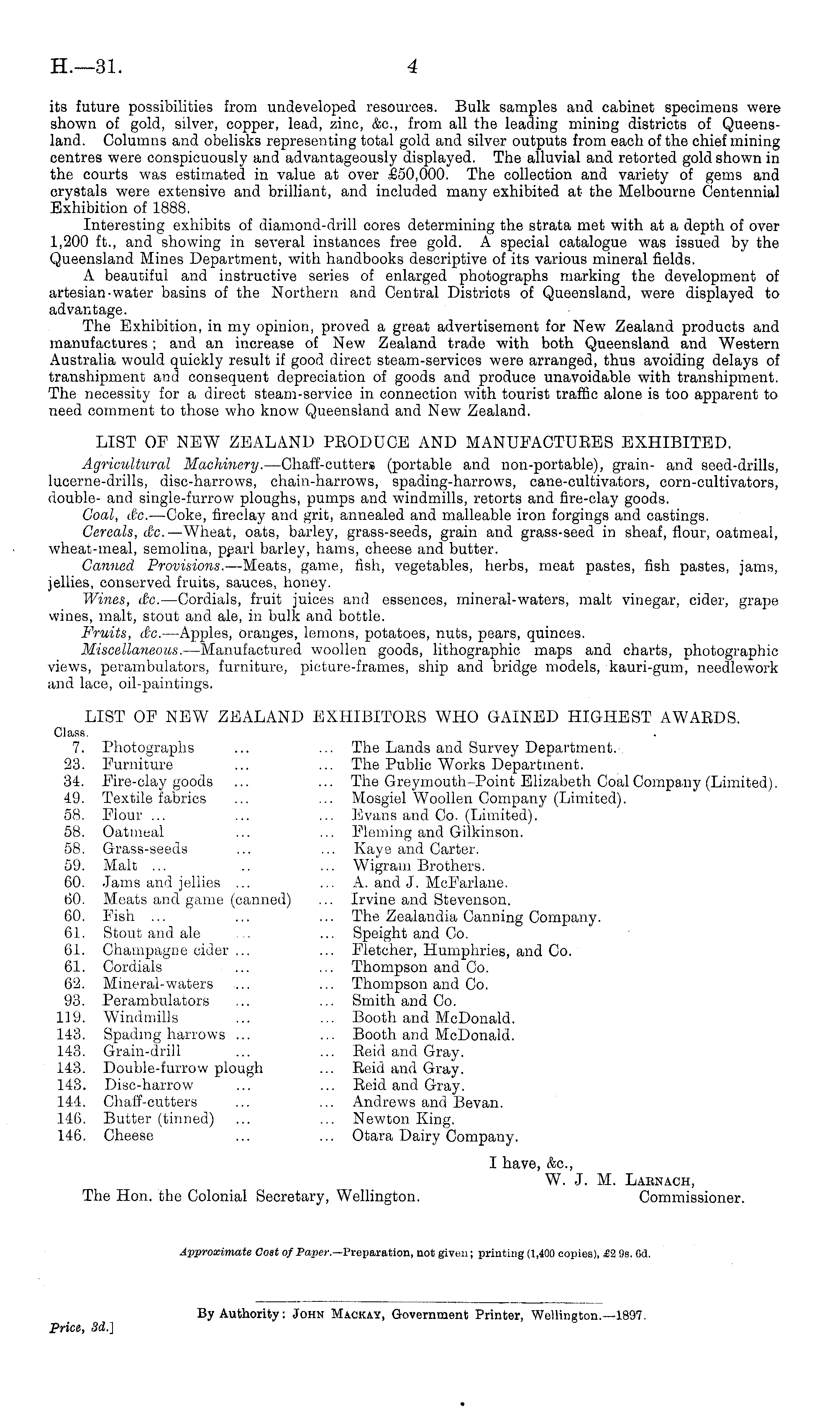 its future possibilities from undeveloped resources. Bulk samples and cabinet specimens were shown of gold, silver, copper, lead, zinc, &c, from all the leading mining districts of Queensland. Columns and obelisks representing total gold and silver outputs from each of the chief mining centres were conspicuously and advantageously displayed. The alluvial and retorted gold shown in the courts was estimated in value at over £50,000. The collection and variety of gems and crystals were extensive and brilliant, and included many exhibited at the Melbourne Centennial Exhibition of 1888. Interesting exhibits of diamond-drill cores determining the strata met with at a depth of over 1,200 ft., and showing in several instances free gold. A special catalogue was issued by the Queensland Mines Department, with handbooks descriptive of its various mineral fields. A beautiful and instructive series of enlarged photographs marking the development of artesian-water basins of the Northern and Central Districts of Queensland, were displayed to advantage. The Exhibition, in my opinion, proved a great advertisement for New Zealand products and manufactures; and an increase of New Zealand trade with both Queensland and Western Australia would quickly result if good direct steam-services were arranged, thus avoiding delays of transhipment and consequent depreciation of goods and produce unavoidable with transhipment. The necessity for a direct steam-service in connection with tourist traffic alone is too apparent to need comment to those who know Queensland and New Zealand. LIST OF NEW ZEALAND PBODUCE AND MANUFACTUBES EXHIBITED. Agricultural Machinery. —Chaff-cutters (portable and non-portable), grain- and seed-drills, lucerne-drills, disc-harrows, chain-harrows, spading-harrows, cane-cultivators, corn-cultivators, double- and single-furrow ploughs, pumps and windmills, retorts and fire-clay goods. Goal, Ac. —Coke, fireclay and grit, annealed and malleable iron forgings and castings. Cereals, dx. —Wheat, oats, barley, grass-seeds, grain and grass-seed in sheaf, flour, oatmeal, wheat-meal, semolina, pearl barley, hams, cheese and butter. Canned Provisions. —Meats, game, fish, vegetables, herbs, meat pastes, fish pastes, jams, jellies, conserved fruits, sauces, honey. Wines, etc. —Cordials, fruit juices and essences, mineral-waters, malt vinegar, cider, grape wines, malt, stout and ale, in bulk and bottle. Fruits, &c. —Apples, oranges, lemons, potatoes, nuts, pears, quinces. Miscellaneous. —Manufactured woollen goods, lithographic maps and charts, photographic views, perambulators, furniture, picture-frames, ship and bridge models, kauri-gum, needlework and lace, oil-paintings. LIST OF NEW ZEALAND EXHIBITOBS WHO GAINED HIGHEST AWARDS. Class. 7. Photographs ... ... The Lands and Survey Department. 23. Furniture ... ... The Public Works Department. 34. Fire-clay goods ... ... The Greymouth-Point Elizabeth Coal Company (Limited). 49. Textile fabrics ... ... Mosgiel Woollen Company (Limited). 58. Flour ... ... ... Evans and Co. (Limited). 58. Oatmeal ... ... Fleming and Gilkinson. 58. Grass-seeds ... ... Kaye and Carter. 59. Malt ... .. ... Wigram Brothers. 60. Jams and jellies ... ... A. and J. McFarlane. 60. Meats and game (canned) ... Irvine and Stevenson. 60. Fish ... ... ... The Zealandia Canning Company. 61. Stout and ale ... ... Speight and Co. 61. Champagne cider ... ... Fletcher, Humphries, and Co. 61. Cordials ... ... Thompson and Co. 62. Mineral-waters ... ... Thompson and Co. 93. Perambulators ... ... Smith and Co. 119. Windmills ... ... Booth and McDonald. 143. Spading harrows ... ... Booth and McDonald. 143. Grain-drill ... ... Beid and Gray. 143. Double-furrow plough ... Beid and Gray. 143. Disc-harrow ... ... Beid and Gray. 144. Chaff-cutters ... ... Andrews and Bevan. 146. Butter (tinned) ... ... Newton King. 146. Cheese ... ... Otara Dairy Company. I have, &c, W. J. M. Laenach, The Hon. the Colonial Secretary, Wellington. Commissioner.
