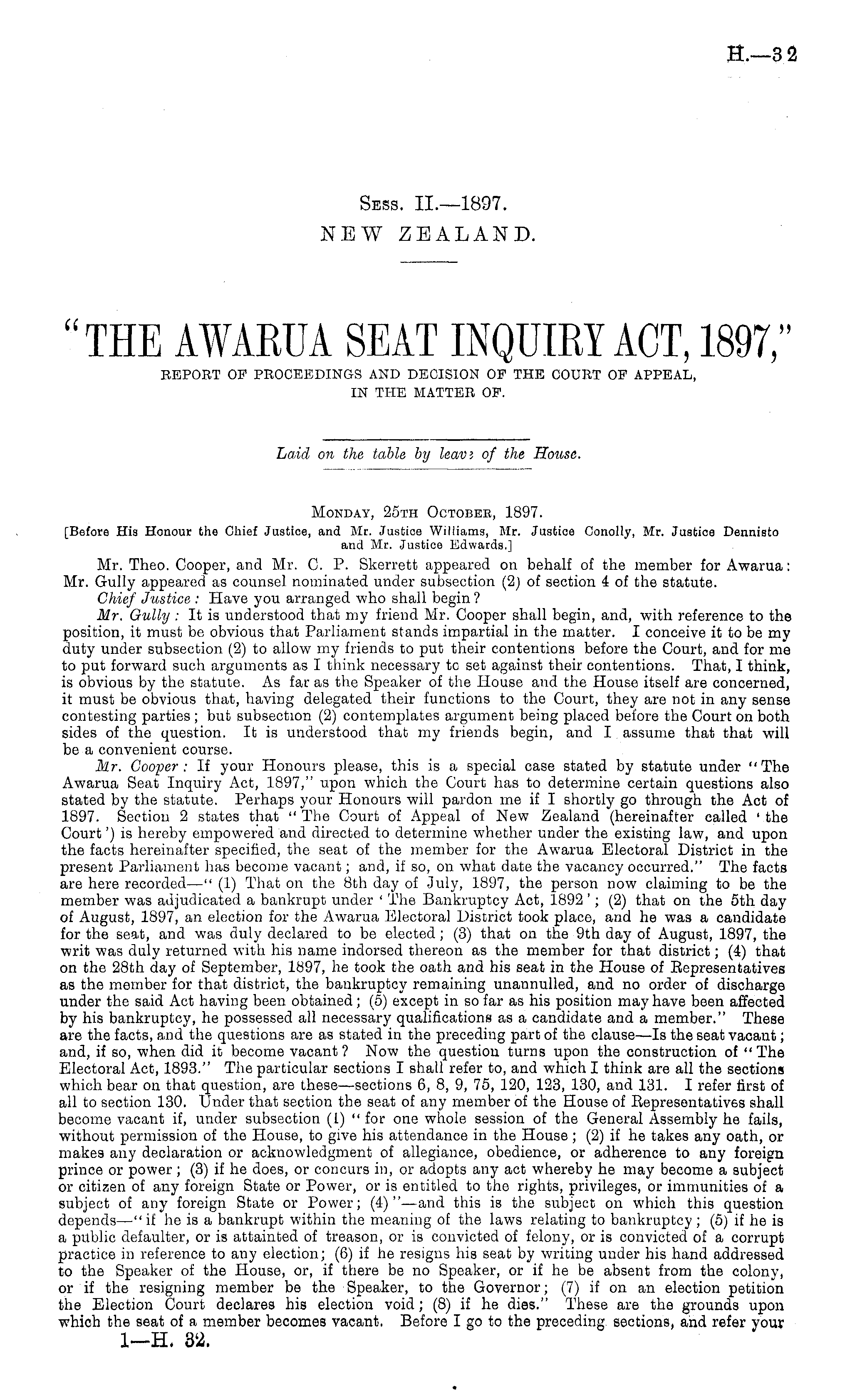 Monday, 25th Octobeh, 1897. [Before His Honour the Chief Justice, and Mr. Justice Williams, Mr. Justice Conolly, Mr. Justice Dennisto and Mr. Justice Edwards.] Mr. Theo. Cooper, and Mr. C. P. Skerrett appeared on behalf of the member for Awarua: Mr. Gully appeared as counsel nominated under subsection (2) of section 4 of the statute. Chief Justice : Have you arranged who shall begin ? Mr. Gully : It is understood that my friend Mr. Cooper shall begin, and, with reference to the position, it must be obvious that Parliament stands impartial in the matter. I conceive it to be my duty under subsection (2) to allow my friends to put their contentions before the Court, and for me to put forward such arguments as I think necessary tc set against their contentions. That, I think, is obvious by the statute. As far as the Speaker of the House and the House itself are concerned, it must be obvious that, having delegated their functions to the Court, they are not in any sense contesting parties ; but subsection (2) contemplates argument being placed before the Court on both sides of the question. It is understood that my friends begin, and I assume that that will be a convenient course. Mr. Cooper: If your Honours please, this is a special case stated by statute under "The Awarua Seat Inquiry Act, 1897," upon which the Court has to determine certain questions also stated by the statute. Perhaps your Honours will pardon me if I shortly go through the Act of 1897. Section 2 states that " The Court of Appeal of New Zealand (hereinafter called ' the Court') is hereby empowered and directed to determine whether under the existing law, and upon the facts hereinafter specified, the seat of the member for the Awarua Electoral District in the present Parliament has become vacant; and, if so, on what date the vacancy occurred." The facts are here recorded—" (1) That on the Bth day of July, 1897, the person now claiming to be the member was adjudicated a bankrupt under ' The Bankruptcy Act, 1892 '; (2) that on the sth day of August, 1897, an election for the Awarua Electoral District took place, and he was a candidate for the seat, and was duly declared to be elected; (3) that on the 9th day of August, 1897, the writ was duly returned with his name indorsed thereon as the member for that district; (4) that on the 28th day of September, 1897, he took the oath and his seat in the House of Eepresentatives as the member for that district, the bankruptcy remaining unannulled, and no order of discharge under the said Act having been obtained; (5) except in so far as his position may have been affected by his bankruptcy, he possessed all necessary qualifications as a candidate and a member." These are the facts, and the questions are as stated in the preceding part of the clause—ls the seat vacant; and, if so, when did it become vacant ? Now the question turns upon the construction of " The Electoral Act, 1893." The particular sections I shall refer to, and which I think are all the sections which bear on that question, are these—sections 6, 8, 9, 75, 120, 123, 130, and 131. I refer first of all to section 130. Under that section the seat of any member of the House of Representatives shall become vacant if, under subsection (1) " for one whole session of the General Assembly he fails, without permission of the House, to give his attendance in the House ; (2) if he takes any oath, or makes any declaration or acknowledgment of allegiance, obedience, or adherence to any foreign prince or power ; (3) if he does, or concurs in, or adopts any act whereby he may become a subject or citizen of any foreign State or Power, or is entitled to the rights, privileges, or immunities of a subject of any foreign State or Power; (4)" —and this is the subject on which this question depends—" if he is a bankrupt within the meaning of the laws relating to bankruptcy; (5) if he is a public defaulter, or is attainted of treason, or is convicted of felony, or is convicted of a corrupt practice in reference to any election; (6) if he resigns his seat by writing under his hand addressed to the Speaker of the House, or, if there be no Speaker, or if he be absent from the colony, or if the resigning member be the Speaker, to the Governor; (7) if on an election petition the Election Court declares his election void ; (8) if he dies." These are the grounds upon which the seat of a member becomes vacant. Before Igo to the preceding sections, and refer your I—H. 82.