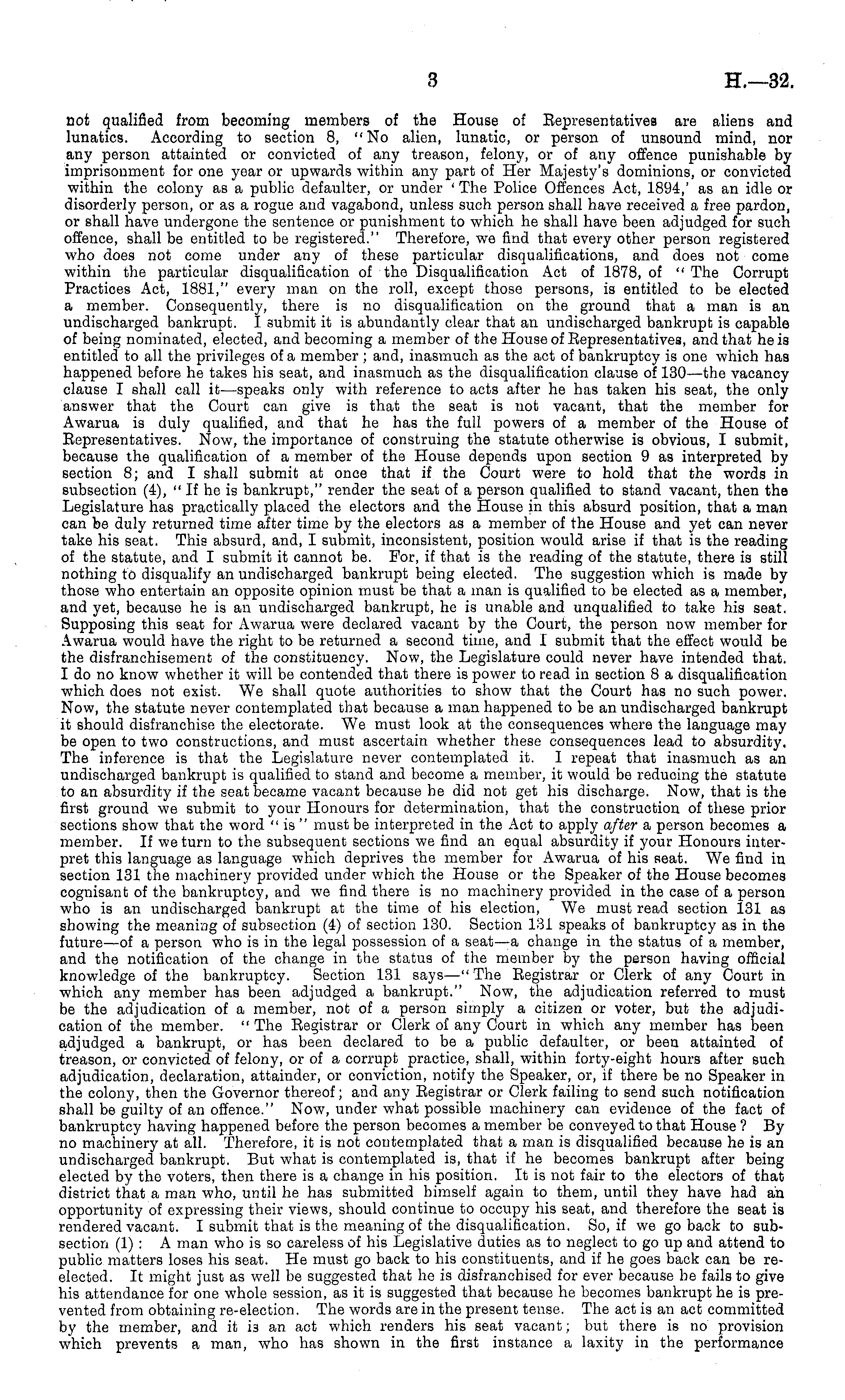 not qualified from becoming members of the House of Representatives are aliens and lunatics. According to section 8, "No alien, lunatic, or person of unsound mind, nor any person attainted or convicted of any treason, felony, or of any offence punishable by imprisonment for one year or upwards within any part of Her Majesty's dominions, or convicted within the colony as a public defaulter, or under ' The Police Offences Act, 1894,' as an idle or disorderly person, or as a rogue and vagabond, unless such person shall have received a free pardon, or shall have undergone the sentence or punishment to which he shall have been adjudged for such offence, shall be entitled to be registered." Therefore, we find that every other person registered who does not come under any of these particular disqualifications, and does not come within the particular disqualification of the Disqualification Act of 1878, of " The Corrupt Practices Act, 1881," every man on the roll, except those persons, is entitled to be elected a member. Consequently, there is no disqualification on the ground that a man is an undischarged bankrupt. I submit it is abundantly clear that an undischarged bankrupt is capable of being nominated, elected, and becoming a member of the House of Representatives, and that he is entitled to all the privileges of a member ; and, inasmuch as the act of bankruptcy is one which has happened before he takes his seat, and inasmuch as the disqualification clause of 130 —the vacancy clause I shall call it—speaks only with reference to acts after he has taken his seat, the only answer that the Court can give is that the seat is not vacant, that the member for Awarua is duly qualified, and that he has the full powers of a member of the House of Representatives. Now, the importance of construing the statute otherwise is obvious, I submit, because the qualification of a member of the House depends upon section 9 as interpreted by section 8; and I shall submit at once that if the Court were to hold that the words in subsection (4), "If he is bankrupt," render the seat of a person qualified to stand vacant, then the Legislature has practically placed the electors and the House in this absurd position, that a man can be duly returned time after time by the electors as a member of the House and yet can never take his seat. This absurd, and, I submit, inconsistent, position would arise if that is the reading of the statute, and I submit it cannot be. For, if that is the reading of the statute, there is still nothing to disqualify an undischarged bankrupt being elected. The suggestion which is made by those who entertain an opposite opinion must be that a man is qualified to be elected as a member, and yet, because he is an undischarged bankrupt, he is unable and unqualified to take his seat. Supposing this seat for Awarua were declared vacant by the Court, the person now member for Awarua would have the right to be returned a second time, and I submit that the effect would be the disfranchisement of the constituency. Now, the Legislature could never have intended that. I do no know whether it will be contended that there is power to read in section 8 a disqualification which does not exist. We shall quote authorities to show that the Court has no such power. Now, the statute never contemplated that because a man happened to be an undischarged bankrupt it should disfranchise the electorate. We must look at the consequences where the language may be open to two constructions, and must ascertain whether these consequences lead to absurdity. The inference is that the Legislature never contemplated it. I repeat that inasmuch as an undischarged bankrupt is qualified to stand and become a member, it would be reducing the statute to an absurdity if the seat became vacant because he did not get his discharge. Now, that is the first ground we submit to your Honours for determination, that the construction of these prior sections show that the word " is " must be interpreted in the Act to apply after a person becomes a member. If we turn to the subsequent sections we find an equal absurdity if your Honours interpret this language as language which deprives the member for Awarua of his seat. We find in section 131 the machinery provided under which the House or the Speaker of the House becomes cognisant of the bankruptcy, and we find there is no machinery provided in the case of a person who is an undischarged bankrupt at the time of his election, We must read section 131 as showing the meaning of subsection (4) of section 130. Section 131 speaks of bankruptcy as in the future—of a person who is in the legal possession of a seat—a change in the status of a member, and the notification of the change in the status of the member by the person having official knowledge of the bankruptcy. Section 131 says —" The Registrar or Clerk of any Court in which any member has been adjudged a bankrupt." Now, the adjudication referred to must be the adjudication of a member, not of a person simply a citizen or voter, but the adjudication of the member. " The Registrar or Clerk of any Court in which any member has been adjudged a bankrupt, or has been declared to be a public defaulter, or been attainted of treason, or convicted of felony, or of a corrupt practice, shall, within forty-eight hours after such adjudication, declaration, attainder, or conviction, notify the Speaker, or, if there be no Speaker in the colony, then the Governor thereof; and any Registrar or Clerk failing to send such notification shall be guilty of an offence." Now, under what possible machinery can evidence of the fact of bankruptcy having happened before the person becomes a member be conveyed to that House ? By no machinery at all. Therefore, it is not contemplated that a man is disqualified because he is an undischarged bankrupt. But what is contemplated is, that if he becomes bankrupt after being elected by the voters, then there is a change in
