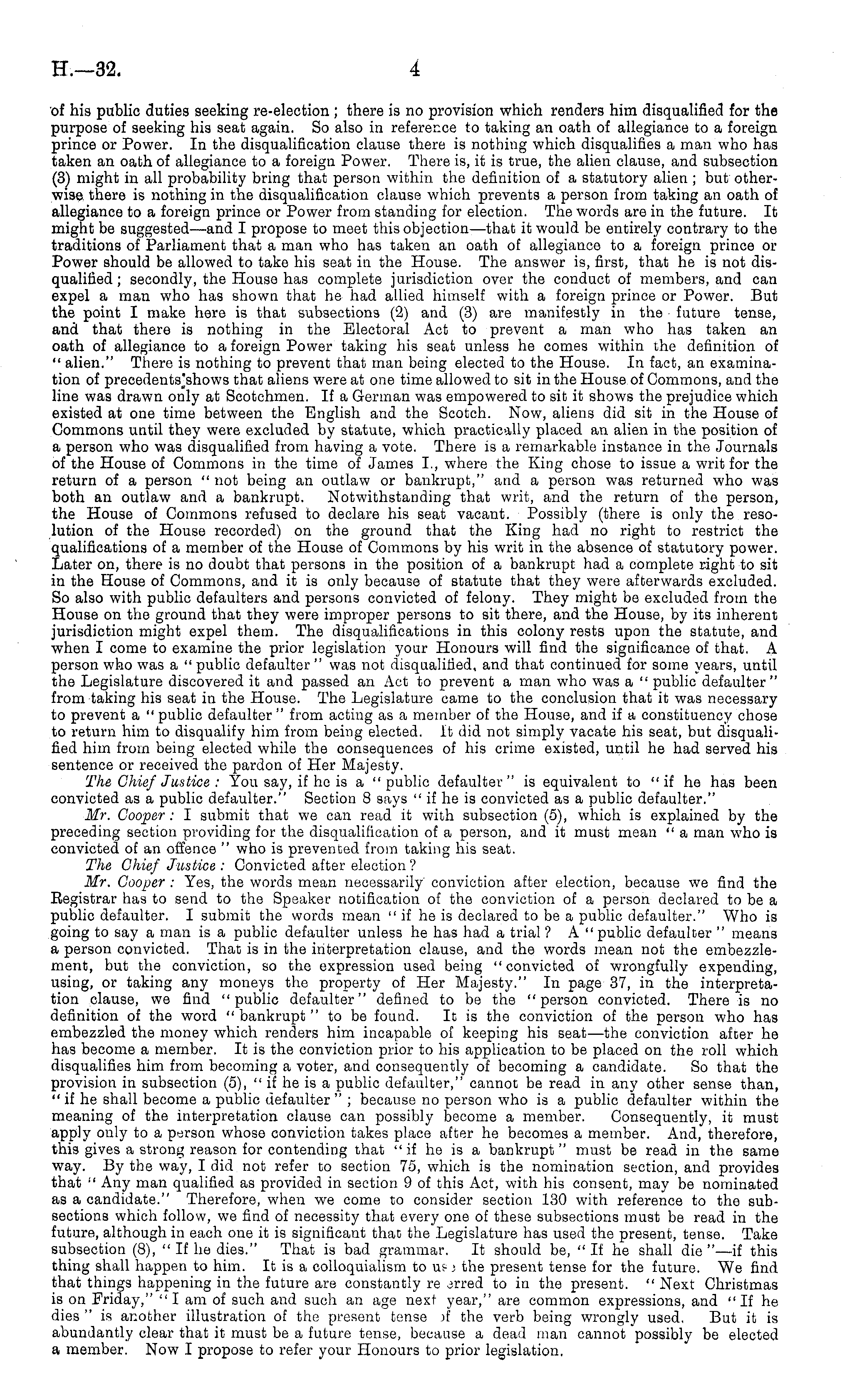 of his public duties seeking re-election ; there is no provision which renders him disqualified for the purpose of seeking his seat again. So also in reference to taking an oath of allegiance to a foreign prince or Power. In the disqualification clause there is nothing which disqualifies a man who has taken an oath of aliegiance to a foreign Power. There is, it is true, the alien clause, and subsection (3) might in all probability bring that person within the definition of a statutory alien ; but otherwise there is nothing in the disqualification clause which prevents a person from taking an oath of allegiance to a foreign prince or Power from standing for election. The words are in the future. It might be suggested—and I propose to meet this objection—that it would be entirely contrary to the traditions of Parliament that a man who has taken an oath of allegiance to a foreign prince or Power should be allowed to take his seat in the House. The answer is, first, that he is not disqualified ; secondly, the House has complete jurisdiction over the conduct of members, and can expel a man who has shown that he had allied himself with a foreign prince or Power. But the point I make here is that subsections (2) and (3) are manifestly in the future tense, and that there is nothing in the Electoral Act to prevent a man who has taken an oath of allegiance to a foreign Power taking his seat unless he comes within the definition of " alien." There is nothing to prevent that man being elected to the House. In fact, an examination of precedents'shows that aliens were at one time allowed to sit in the House of Commons, and the line was drawn only at Scotchmen. If a German was empowered to sit it shows the prejudice which existed at one time between the English and the Scotch. Now, aliens did sit in the House of Commons until they were excluded by statute, which practically placed an alien in the position of a person who was disqualified from having a vote. There is a remarkable instance in the Journals of the House of Commons in the time of James 1., where the King chose to issue a writ for the return of a person " not being an outlaw or bankrupt," and a person was returned who was both an outlaw and a bankrupt. Notwithstanding that writ, and the return of the person, the House of Commons refused to declare his seat vacant. Possibly (there is only the resolution of the House recorded) on the ground that the King had no right to restrict the qualifications of a member of the House of Commons by his writ in the absence of statutory power. Later on, there is no doubt that persons in the position of a bankrupt had a complete right to sit in the House of Commons, and it is only because of statute that they wore afterwards excluded. So also with public defaulters and persons convicted of felony. They might be excluded from the House on the ground that they were improper persons to sit there, and the House, by its inherent jurisdiction might expel them. The disqualifications in this colony rests upon the statute, and when I come to examine the prior legislation your Honours will find the significance of that. A person who was a " public defaulter " was not disqualified, and that continued for some years, until the Legislature discovered it and passed an Act to prevent a man who was a " public defaulter" from taking his seat in the House. The Legislature came to the conclusion that it was necessary to prevent a " public defaulter " from acting as a member of the House, and if a constituency chose to return him to disqualify him from being elected. It did not simply vacate his seat, but disqualified him from being elected while the consequences of his crime existed, until he had served his sentence or received the pardon of Her Majesty. The Chief Justice : You say, if ho is a " public defaulter " is equivalent to "if he has been convicted as a public defaulter." Section 8 says "ifhe is convicted as a public defaulter." Mr. Cooper: I submit that we can read it with subsection (5), which is explained by the preceding section providing for the disqualification of a person, and it must mean " a man who is convicted of an offence " who is prevented from taking his seat. The Chief Justice : Convicted after election? Mr. Cooper : Yes, the words mean necessarily conviction after election, because we find the Registrar has to send to the Speaker notification of the conviction of a person declared to be a public defaulter. I submit the words mean "if he is declared to be a public defaulter." Who is going to say a man is a public defaulter unless he has had a trial? A "public defaulter " means a person convicted. That is in the interpretation clause, and the words mean not the embezzlement, but the conviction, so the expression used being "convicted of wrongfully expending, using, or taking any moneys the property of Her Majesty." In page 37, in the interpretation clause, we find "public defaulter" defined to be the "person convicted. There is no definition of the word " bankrupt "to be found. It is the conviction of the person who has embezzled the money which renders him incapable of keeping his seat —the conviction after he has become a member. It is the conviction prior to his application to be placed on the roll which disqualifies him from becoming a voter, and consequently of becoming a candidate. So that the provision in subsection (5), " if he is a public defaulter," cannot be read in any other sense than, "if he shall become a public defaulter " ; because no person who is a public defaulter within the meaning of the interpretation clause can possibly become a member. Consequently, it must apply only to a person whose conviction takes place after he becomes a member. And, therefore, this gives a strong reason for contending that "if he is a bankrupt" must be read in the same way. By the way, I did not refer to section 75, which is the nomination section, and provides that " Any man qualified as provided in 