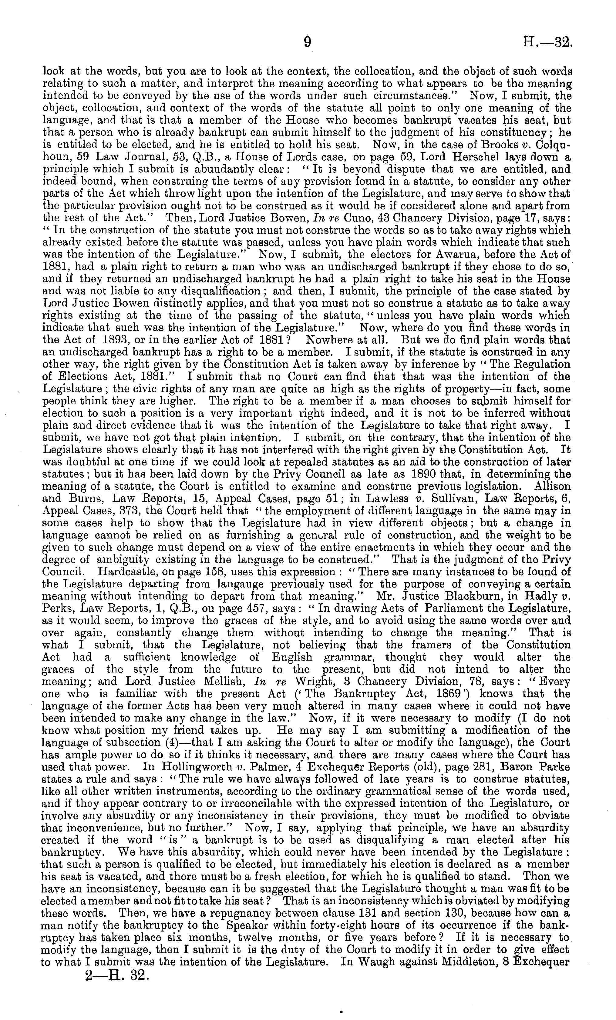 look at the words, but you are to look at the context, the collocation, and the object of such words relating to such a matter, and interpret the meaning according to what appears to be the meaning intended to be conveyed by the use of the words under such circumstances." Now, I submit, the object, collocation, and context of the words of the statute all point to only one meaning of the language, and that is that a member of the House who becomes bankrupt vacates his seat, but that a person who is already bankrupt can submit himself to the judgment of his constituency; he is entitled to be elected, and he is entitled to hold his seat. Now, in the case of Brooks v. Colquhoun, 59 Law Journal, 53, Q. 8., a House of Lords case, on page 59, Lord Herschel lays down a principle which I submit is abundantly clear: "It is beyond dispute that we are entitled, and indeed bound, when construing the terms of any provision found in a statute, to consider any other parts of the Act which throw light upon the intention of the Legislature, and may serve to show that the particular provision ought not to be construed as it would be if considered alone and apart from the rest of the Act." Then, Lord Justice Bowen, In re Cuno, 43 Chancery Division, page 17, says: " In the construction of the statute you must not construe the words so as to take away rights which already existed before the statute was passed, unless you have plain words which indicate that such was the intention of the Legislature." Now, I submit, the electors for Awarua, before the Act of 1881, had a plain right to return a man who was an undischarged bankrupt if they chose to do so, and if they returned an undischarged bankrupt he had a plain right to take his seat in the House and was not liable to any disqualification ; and then, I submit, the principle of the case stated by Lord Justice Bowen distinctly applies, and that you must not so construe a statute as to take away rights existing at the time of the passing of the statute, " unless you have plain words which indicate that such was the intention of the Legislature." Now, where do you find these words in the Act of 1893, or in the earlier Act of 1881 ? Nowhere at all. But we do find plain words that an undischarged bankrupt has a right to be a member. I submit, if the statute is construed in any other way, the right given by the Constitution Act is taken away by inference by " The Regulation of Elections Act, 1881." I submit that no Court can find that that was the intention of the Legislature ; the civic rights of any man are quite as high as the rights of property —in fact, some people think they are higher. The right to be a member if a man chooses to submit himself for election to such a position is a very important right indeed, and it is not to be inferred without plain and direct evidence that it was the intention of the Legislature to take that right away. I submit, we have not got that plain intention. I submit, on the contrary, that the intention of the Legislature shows clearly that it has not interfered with the right given by the Constitution Act. It was doubtful at one time if we could look at repealed statutes as an aid to the construction of later statutes; but it has been laid down by the Privy Council as late as 1890 that, in determining the meaning of a statute, the Court is entitled to examine and construe previous legislation. Allison and Burns, Law Reports, 15, Appeal Cases, page 51; in Lawless v. Sullivan, Law Reports, 6, Appeal Cases, 373, the Court held that " the employment of different language in the same may in some cases help to show that the Legislature had in view different objects ; but a change in language cannot be relied on as furnishing a general rule of construction, and the weight to be given to such change must depend on a view of the entire enactments in which they occur and the degree of ambiguity existing in the language to be construed." That is the judgment of the Privy Council. Hardcastle, on page 158, uses this expression : " There are many instances to be found of the Legislature departing from langauge previously used for the purpose of conveying a certain meaning without intending to depart from that meaning." Mr. Justice Blackburn, in Hadly v. Perks, Law Reports, 1, Q. 8., on page 457, says : " In drawing Acts of Parliament the Legislature, as it would seem, to improve the graces of the style, and to avoid using the same words over and over again, constantly change them without intending to change the meaning." That is what I submit, that the Legislature, not believing that the framers of the Constitution Act had a sufficient knowledge of English grammar, thought they would alter the graces of the style from the future to the present, but did not intend to alter the meaning; and Lord Justice Mellish, In re Wright, 3 Chancery Division, 78, says: "Every one who is familiar with the present Act (' The Bankruptcy Act, 1869') knows that the language of the former Acts has been very much altered in many cases where it could not have been intended to make any change in the law." Now, if it were necessary to modify (I do not know what position my friend takes up. He may say I am submitting a modification of the language of subsection (4) —that I am asking the Court to alter or modify the language), the Court has ample power to do so if it thinks it necessary, and there are many cases where the Court has used that power. In Hollingworth v. Palmer, 4 Exchequer Reports (old), page 281, Baron Parke states a rule and says : "The rule we have always followed of late years is to construe statutes, like all other written instruments, according to the ordinary grammatical sense of the words used, and if they appear contrary to or irreconcilable with the expressed intention of the Legislature, or involve any absurdity or any inconsistency in their provisions, they must be modified to obviate that inconvenience, but no further." Now, I say, applyi