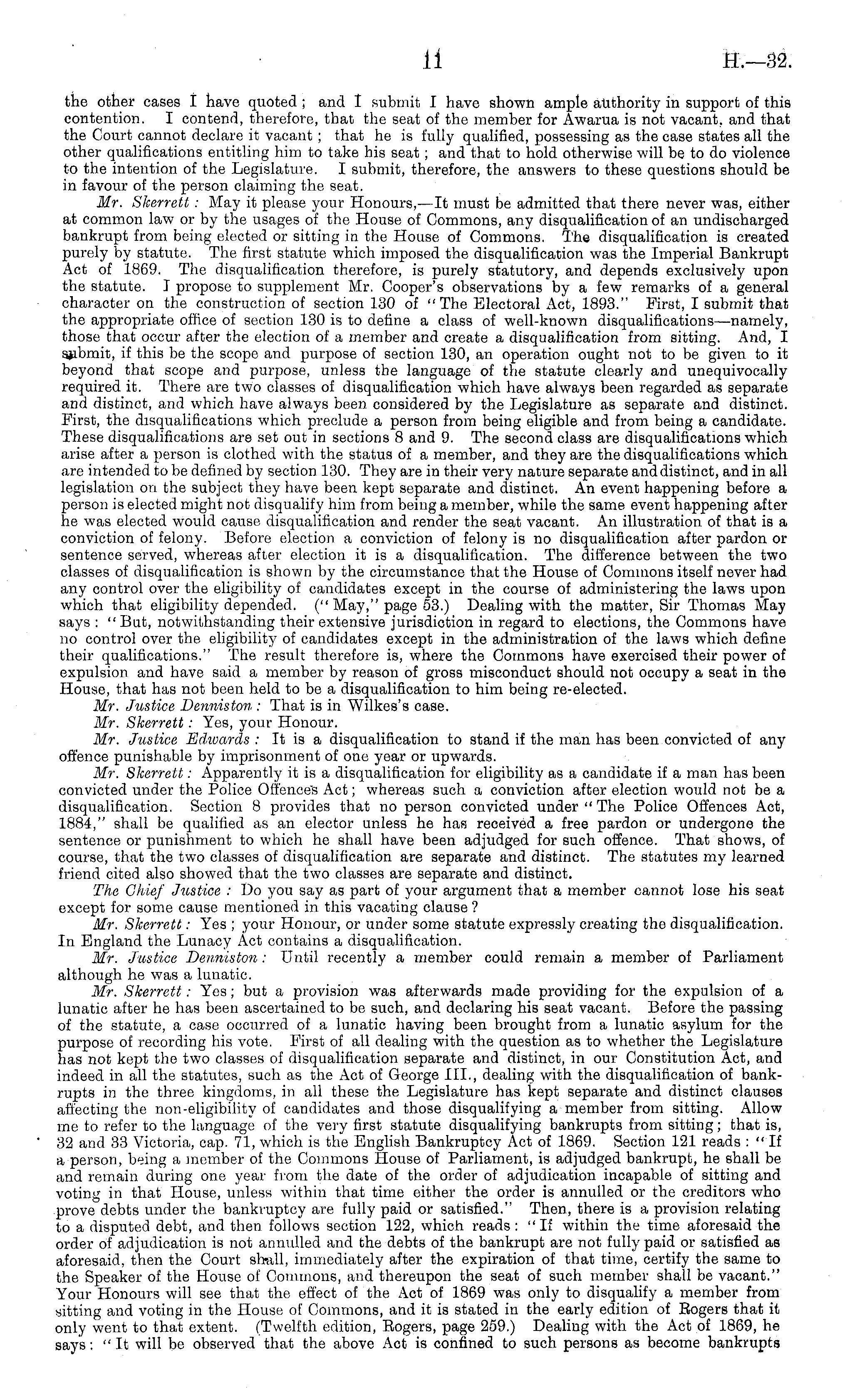the other cases I have quoted ; and I submit I have shown ample authority in support of this contention. I contend, therefore, that the seat of the member for Awarua is not vacant, and that the Court cannot declare it vacant; that he is fully qualified, possessing as the case states all the other qualifications entitling him to take his seat; and that to hold otherwise will be to do violence to the intention of the Legislature. I submit, therefore, the answers to these questions should be in favour of the person claiming the seat. Mr. Skerrett: May it please your Honours, —It must be admitted that there never was, either at common law or by the usages of the House of Commons, any disqualification of an undischarged bankrupt from being elected or sitting in the House of Commons. The disqualification is created purely by statute. The first statute which imposed the disqualification was the Imperial Bankrupt Act of 1869. The disqualification therefore, is purely statutory, and depends exclusively upon the statute. I propose to supplement Mr. Cooper's observations by a few remarks of a general character on the construction of section 130 of "The Electoral Act, 1893." First, I submit that the appropriate office of section 130 is to define a class of well-known disqualifications—namely, those that occur after the election of a member and create a disqualification from sitting. And, I submit, if this be the scope and purpose of section 130, an operation ought not to be given to it beyond that scope and purpose, unless the language of the statute clearly and unequivocally required it. There are two classes of disqualification which have always been regarded as separate and distinct, and which have always been considered by the Legislature as separate and distinct. First, the disqualifications which preclude a person from being eligible and from being a candidate. These disqualifications are set out in sections 8 and 9. The second class are disqualifications which arise after a person is clothed with the status of a member, and they are the disqualifications which are intended to be defined by section 130. They are in their very nature separate and distinct, and in all legislation on the subject they have been kept separate and distinct. An event happening before a person is elected might not disqualify him from being a member, while the same event happening after he was elected would cause disqualification and render the seat vacant. An illustration of that is a conviction of felony. Before election a conviction of felony is no disqualification after pardon or sentence served, whereas after election it is a disqualification. The difference between the two classes of disqualification is shown by the circumstance that the House of Commons itself never had any control over the eligibility of candidates except in the course of administering the laws upon which that eligibility depended. (" May," page 53.) Dealing with the matter, Sir Thomas May says : "But, notwithstanding their extensive jurisdiction in regard to elections, the Commons have no control over the eligibility of candidates except in the administration of the laws which define their qualifications." The result therefore is, where the Commons have exercised their power of expulsion and have said a member by reason of gross misconduct should not occupy a seat in the House, that has not been held to be a disqualification to him being re-elected. Mr. Justice Denniston : That is in Wilkes's case. Mr. Skerrett: Yes, your Honour. Mr. Justice Edivards : It is a disqualification to stand if the man has been convicted of any offence punishable by imprisonment of one year or upwards. Mr. Skerrett: Apparently it is a disqualification for eligibility as a candidate if a man has been convicted under the Police Offence's Act; whereas such a conviction after election would not be a disqualification. Section 8 provides that no person convicted under " The Police Offences Act, 1884," shall be qualified as an elector unless he has received a free pardon or undergone the sentence or punishment to which he shall have been adjudged for such offence. That shows, of course, that the two classes of disqualification are separate and distinct. The statutes my learned friend cited also showed that the two classes are separate and distinct. The Chief Justice : Do you say as part of your argument that a member cannot lose his seat except for some cause mentioned in this vacating clause ? Mr. Skerrett: Yes ; your Honour, or under some statute expressly creating the disqualification. In England the Lunacy Act contains a disqualification. Mr. Justice Denniston: Until recently a member could remain a member of Parliament although he was a lunatic. Mr. Skerrett : Yes; but a provision was afterwards made providing for the expulsion of a lunatic after he has been ascertained to be such, and declaring his seat vacant. Before the passing of the statute, a case occurred of a lunatic having been brought from a lunatic asylum for the purpose of recording his vote. First of all dealing with the question as to whether the Legislature has not kept the two classes of disqualification separate and distinct, in our Constitution Act, and indeed in all the statutes, such as the Act of George 111., dealing with the disqualification of bankrupts in the three kingdoms, in all these the Legislature has kept separate and distinct clauses affecting the non-eligibility of candidates and those disqualifying a member from sitting. Allow me to refer to the language of the very first statute disqualifying bankrupts from sitting; that is, 32 and 33 Victoria, cap. 71, which is the English Bankruptcy Act of 1869. Section 121 reads :" If a person, being a member of the Commons House of Parliament, is adjudged bankrupt, he shall be and remain during one year from the date of the order of adjudication incapable of sitting and voting in that House, unless within that time either the order is annulle