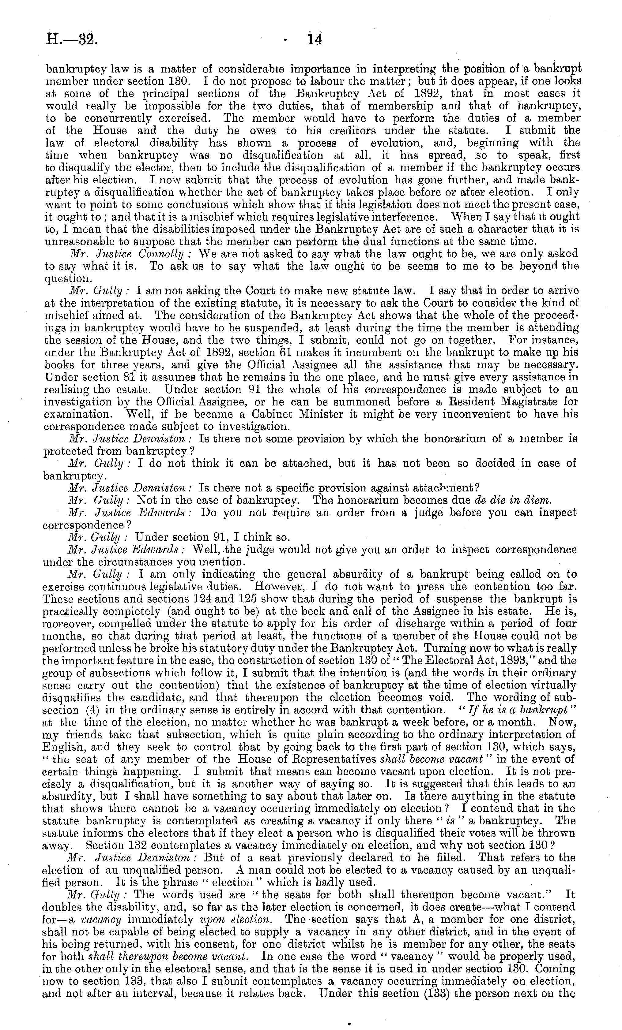 bankruptcy law is a matter of considerable importance in interpreting the position of a bankrupt member under section 130. Ido not propose to labour the matter; but it does appear, if one looks at some of the principal sections of the Bankruptcy Act of 1892, that in most cases it would really be impossible for the two duties, that of membership and that of bankruptcy, to be concurrently exercised. The member would have to perform the duties of a member of the House and the duty he owes to his creditors under the statute. I submit the law of electoral disability has shown a process of evolution, and, beginning with the time when bankruptcy was no disqualification at all, it has spread, so to speak, first to disqualify the elector, then to include the disqualification of a member if the bankruptcy occurs after his election. I now submit that the process of evolution has gone further, and made bankruptcy a disqualification whether the act of bankruptcy takes place before or after election. I only want to point to some conclusions which show that if this legislation does not meet the present case, it ought to ; and that it is a mischief which requires legislative interference. When I say that it ought to, 1 mean that the disabilities imposed under the Bankruptcy Act are of such a character that it is unreasonable to suppose that the member can perform the dual functions at the same time. Mr. Justice Connolly : We are not asked to say what the law ought to be, we are only asked to say what it is. To ask us to say what the law ought to be seems to me to be beyond the question. Mr. Gaily : lam not asking the Court to make new statute law. I say that in order to arrive at the interpretation of the existing statute, it is necessary to ask the Court to consider the kind of mischief aimed at. The consideration of the Bankruptcy Act shows that the whole of the proceedings in bankruptcy would have to be suspended, at least during the time the, member is attending the session of the House, and the two things, I submit, could not go on together. For instance, under the Bankruptcy Act of 1892, section 61 makes it incumbent on the bankrupt to make up his books for three years, and give the Official Assignee all the assistance that may be necessary. Under section 81 it assumes that he remains in the one place, and he must give every assistance in realising the estate. Under section 91 the whole of his correspondence is made subject to an investigation by the Official Assignee, or he can be summoned before a Resident Magistrate for examination. Well, if he became a Cabinet Minister it might be very inconvenient to have his correspondence made subject to investigation. Mr. Justice Denniston: Is there not some provision by which the honorarium of a member is protected from bankruptcy ? Mr. Gully : I do not think it can be attached, but it has not been so decided in case of bankruptcy. Mr. Justice Denniston : Is there not a specific provision against attachment? Mr. Gully : Not in the case of bankruptcy. The honorarium becomes due de die in diem. Mr. Justice Edwards : Do you not require an order from a judge before you can inspect correspondence ? Mr. Gully : Under section 91, I think so. Mr. Justice Edwards : Well, the judge would not give you an order to inspect correspondence under the circumstances you mention. Mr. Gully : I am only indicating the general absurdity of a bankrupt being called on to exercise continuous legislative duties. However, I do not want to press the contention too far. These sections and sections 124 and 125 show that during the period of suspense the bankrupt is practically completely (and ought to be) at the beck and call of the Assignee in his estate. He is, moreover, compelled under the statute to apply for his order of discharge within a period of four months, so that during that period at least, the functions of a member of the House could not be performed unless he broke his statutory duty under the Bankruptcy Act. Turning now to what is really the important feature in the case, the construction of section 130 of " The Electoral Act, 1893," and the group of subsections which follow it, I submit that the intention is (and the words in their ordinary sense carry out the contention) that the existence of bankruptcy at the time of election virtually disqualifies the candidate, and that thereupon the election becomes void. The wording of subsection (4) in the ordinary sense is entirely in accord with that contention. "Ifhe is a bankrupt " at the time of the election, no matter whether he was bankrupt a week before, or a month. Now, my friends take that subsection, which is quite plain according to the ordinary interpretation of English, and they seek to control that by going back to the first part of section 130, which says, " the seat of any member of the House of Representatives shall become vacant " in the event of certain things happening. I submit that means can become vacant upon election. It is not precisely a disqualification, but it is another way of saying so. It is suggested that this leads to an absurdity, but I shall have something to say about that later on. Is there anything in the statute that shows there cannot be a vacancy occurring immediately on election? I contend that in the statute bankruptcy is contemplated as creating a vacancy if only there !< is " a bankruptcy. The statute informs the electors that if they elect a person who is disqualified their votes will be thrown away. Section 132 contemplates a vacancy immediately on election, and why not section 130? Mr. Justice Denniston : But of a seat previously declared to be filled. That refers to the election of an unqualified person. A man could not be elected to a vacancy caused by an unqualified person. It is the phrase " election " which is badly used. Mr. Gully : The words used are " the seats for both shall thereupon become vacant." It doubles the disability, and, so far as the later election is concern