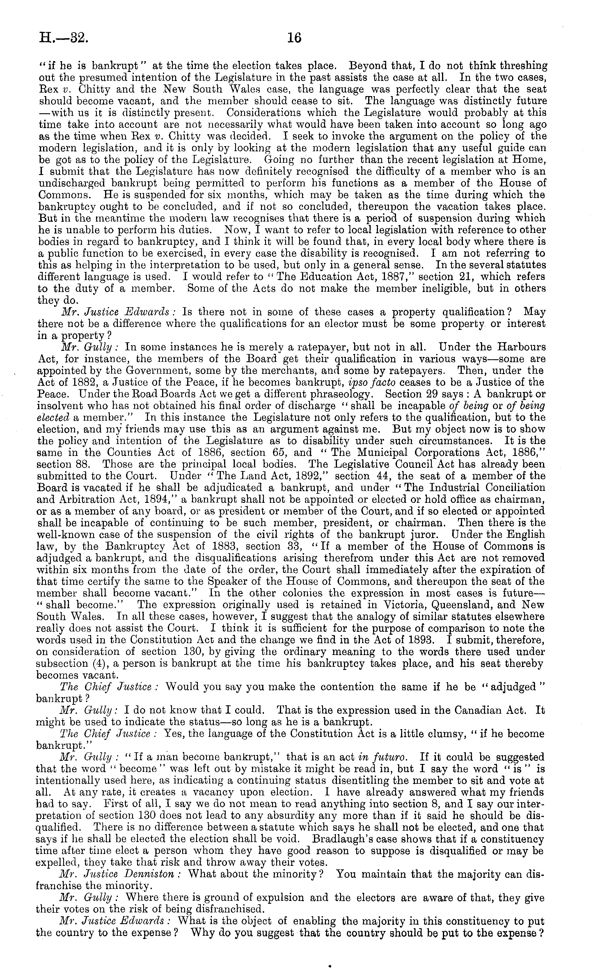"if he is bankrupt" at the time the election takes place. Beyond that, Ido not think threshing out the presumed intention of the Legislature in the past assists the case at all. In the two cases, Rex v. Chitty and the New South Wales case, the language was perfectly clear that the seat should become vacant, and the member should cease to sit. The language was distinctly future —with us it is distinctly present. Considerations which the Legislature would probably at this time take into account are not necessarily what would have been taken into account so long ago as the time when Rex v. Chitty was decided. I seek to invoke the argument on the policy of the modern legislation, and it is only by looking at the modern legislation that any useful guide can be got as to the policy of the Legislature. Going no further than the recent legislation at Home, I submit that the Legislature has now definitely recognised the difficulty of a member who is an undischarged bankrupt being permitted to perform his functions as a member of the House of Commons. He is suspended for six months, which may be taken as the time during which the bankruptcy ought to be concluded, and if not so concluded, thereupon the vacation takes place. But in the meantime the modern law recognises that there is a period of suspension during which he is unable to perform his duties. Now, I want to refer to local legislation with reference to other bodies in regard to bankruptcy, and I think it will be found that, in every local body where there is a public function to be exercised, in every case the disability is recognised. I am not referring to this as helping in the interpretation to be used, but only in a general sense. In the several statutes different language is used. I would refer to "The Education Act, 1887," section 21, which refers to the duty of a member. Some of the Acts do not make the member ineligible, but in others they do. Mr. Justice Edwards : Is there not in some of these cases a property qualification ? May there not be a difference where the qualifications for an elector must be some property or interest in a property ? Mr. Gully : In some instances he is merely a ratepayer, but not in all. Under the Harbours Act, for instance, the members of the Board get their qualification in various ways—some are appointed by the Government, some by the merchants, and some by ratepayers. Then, under the Act of 1882, a Justice of the Peace, if he becomes bankrupt, ipso facto ceases to be a Justice of the Peace. Under the Road Boards Act we get a different phraseology. Section 29 says : A bankrupt or insolvent who has not obtained his final order of discharge " shall be incapable of being or of being elected a member." In this instance the Legislature not only refers to the qualification, but to the election, and my friends may use this as an argument against me. But my object now is to show the policy and intention of the Legislature as to disability under such circumstances. It is the same in the Counties Act of 1886, section 65, and " The Municipal Corporations Act, 1886," section 88. Those are the principal local bodies. The Legislative Council Act has already been submitted to the Court. Under " The Land Act, 1892," section 44, the seat of a member of the Board is vacated if he shall be adjudicated a bankrupt, and under " The Industrial Conciliation and Arbitration Act, 1894," a bankrupt shall not be appointed or elected or hold office as chairman, or as a member of any board, or as president or member of the Court, and if so elected or appointed shall be incapable of continuing to be such member, president, or chairman. Then there is the well-known case of the suspension of the civil rights of the bankrupt juror. Under the English law, by the Bankruptcy Act of 1883, section 33, "If a member of the House of Commons is adjudged a bankrupt, and the disqualifications arising therefrom under this Act are not removed within six months from the date of the order, the Court shall immediately after the expiration of that time certify the same to the Speaker of the House of Commons, and thereupon the seat of the member shall become vacant." In the other colonies the expression in most cases is future— " shall become." The expression originally used is retained in Victoria, Queensland, and New South Wales. In all these cases, however, I suggest that the analogy of similar statutes elsewhere really does not assist the Court. I think it is sufficient for the purpose of comparison to note the words used in the Constitution Act and the change we find in the Act of 1893. I submit, therefore, on consideration of section 130, by giving the ordinary meaning to the words there used under subsection (4), a person is bankrupt at the time his bankruptcy takes place, and his seat thereby becomes vacant. The Chief Justice : Would you say you make the contention the same if he be " adjudged " bankrupt ? Mr. Gully: Ido not know that I could. That is the expression used in the Canadian Act. It might be used to indicate the status —so long as he is a bankrupt. The Chief Justice : Yes, the language of the Constitution Act is a little clumsy, " if he become bankrupt." Mr. Gully : "If a man become bankrupt," that is an act in futuro. If it could be suggested that the word " become " was left out by mistake it might be read in, but I say the word " is " is intentionally used here, as indicating a continuing status disentitling the member to sit and vote at all. At any rate, it creates a vacancy upon election. 1 have already answered what my friends had to say. First of all, I say we do not mean to read anything into section 8, and I say our interpretation of section 130 does not lead to any absurdity any more than if it said he should be disqualified. There is no difference between a statute which says he shall not be elected, and one that says if he shall be elected the election shall be void. Bradlaugh's case shows that if a constituency