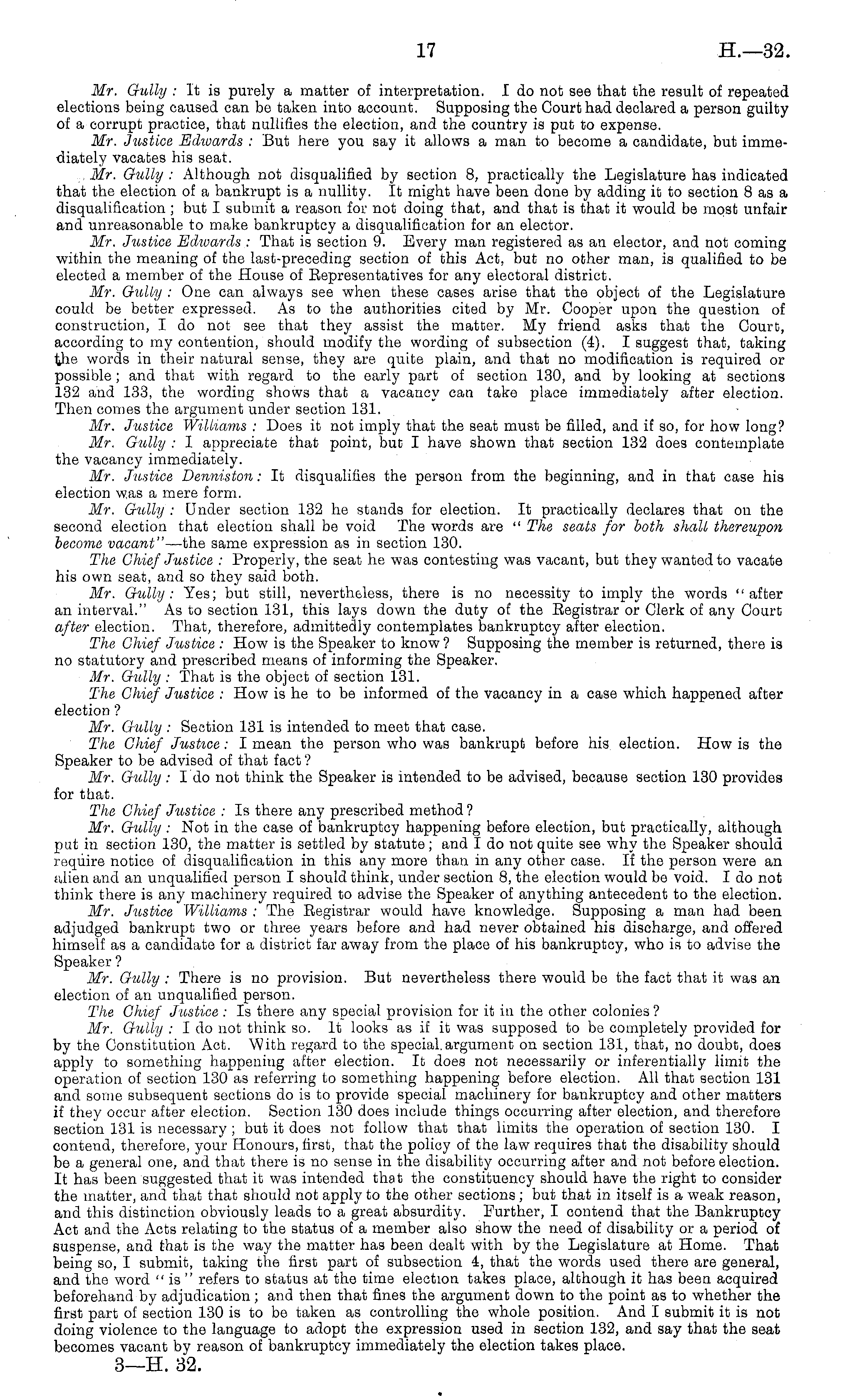 Mr. Gully : It is purely a matter of interpretation. Ido not see that the result of repeated elections being caused can be taken into account. Supposing the Court had declared a person guilty of a corrupt practice, that nullifies the election, and the country is put to expense. Mr. Justice Edwards : But here you say it allows a man to become a candidate, but immediately vacates his seat. Mr. Gully : Although not disqualified by section 8, practically the Legislature has indicated that the election of a bankrupt is a nullity. It might have been done by adding it to section Bas a disqualification ; but I submit a reason for not doing that, and that is that it would be most unfair and unreasonable to make bankruptcy a disqualification for an elector. Mr. Justice Edioards : That is section 9. Every man registered as an elector, and not coming within the meaning of the last-preceding section of this Act, but no other man, is qualified to be elected a member of the House of Representatives for any electoral district. Mr. Gully : One can always see when these cases arise that the object of the Legislature could be better expressed. As to the authorities cited by Mr. Cooper upon the question of construction, I do not see that they assist the matter. My friend asks that the Court, according to my contention, should modify the wording of subsection (4). I suggest that, taking lihe words in their natural sense, they are quite plain, and that no modification is required or possible; and that with regard to the early part of section 130, and by looking at sections 132 and 133, the wording shows that a vacancy can take place immediately after election. Then comes the argument under section 131. Mr. Justice Williams : Does it not imply that the seat must be filled, and if so, for how long? Mr. Gully : I appreciate that point, but I have shown that section 132 does contemplate the vacancy immediately. Mr. Justice Denniston : It disqualifies the person from the beginning, and in that case his election was a mere form. Mr. Gully : Under section 132 he stands for election. It practically declares that on the second election that election shall be void The words are " The seats for both shall thereupon become vacant" —the same expression as in section 130. The Chief Justice : Properly, the seat he was contesting was vacant, but they wanted to vacate his own seat, and so they said both. Mr. Gully: Yes; but still, nevertheless, there is no necessity to imply the words "after an interval." As to section 131, this lays down the duty of the Registrar or Clerk of any Court after election. That, therefore, admittedly contemplates bankruptcy after election. The Chief Justice : How is the Speaker to know ? Supposing the member is returned, there is no statutory and prescribed means of informing the Speaker. Mr. Gully : That is the object of section 131. The Chief Justice : How is he to be informed of the vacancy in a case which happened after election ? Mr. Gully : Section 131 is intended to meet that case. The Chief Justice: I mean the person who was bankrupt before his election. How is the Speaker to be advised of that fact ? Mr. Gully : I do not think the Speaker is intended to be advised, because section 130 provides for that. The Chief Justice : Is there any prescribed method ? Mr. Gully : Not in the case of bankruptcy happening before election, but practically, although put in section 130, the matter is settled by statute; and I do not quite see why the Speaker should require notice of disqualification in this any more than in any other case. If the person were an alien and an unqualified person I should think, under section 8, the election would be void. Ido not think there is any machinery required to advise the Speaker of anything antecedent to the election. Mr. Justice Williams : The Registrar would have knowledge. Supposing a man had been adjudged bankrupt two or three years before and had never obtained his discharge, and offered himself as a candidate for a district far away from the place of his bankruptcy, who is to advise the Speaker ? Mr. Gully : There is no provision. But nevertheless there would be the fact that it was an election of an unqualified person. The Chief Justice : Is there any special provision for it in the other colonies? Mr. Gully : Ido not think so. It looks as if it was supposed to be completely provided for by the Constitution Act. With regard to the special, argument on section 131, that, no doubt, does apply to something happening after election. It does not necessarily or inferentially limit the operation of section 130 as referring to something happening before election. All that section 131 and some subsequent sections do is to provide special machinery for bankruptcy and other matters if they occur after election. Section 130 does include things occurring after election, and therefore section 131 is necessary ; but it does not follow that that limits the operation of section 130. I contend, therefore, your Honours, first, that the policy of the law requires that the disability should be a general one, and that there is no sense in the disability occurring after and not before election. It has been suggested that it was intended that the constituency should have the right to consider the matter, and that that should not apply to the other sections ; but that in itself is a weak reason, and this distinction obviously leads to a great absurdity. Further, I contend that the Bankruptcy Act and the Acts relating to the status of a member also show the need of disability or a period of suspense, and that is the way the matter has been dealt with by the Legislature at Home. That being so, I submit, taking the first part of subsection 4, that the words used there are general, and the word " is " refers to status at the time election takes place, although it has been acquired beforehand by adjudication; and then that fines the argument down to the point as to whether the first part