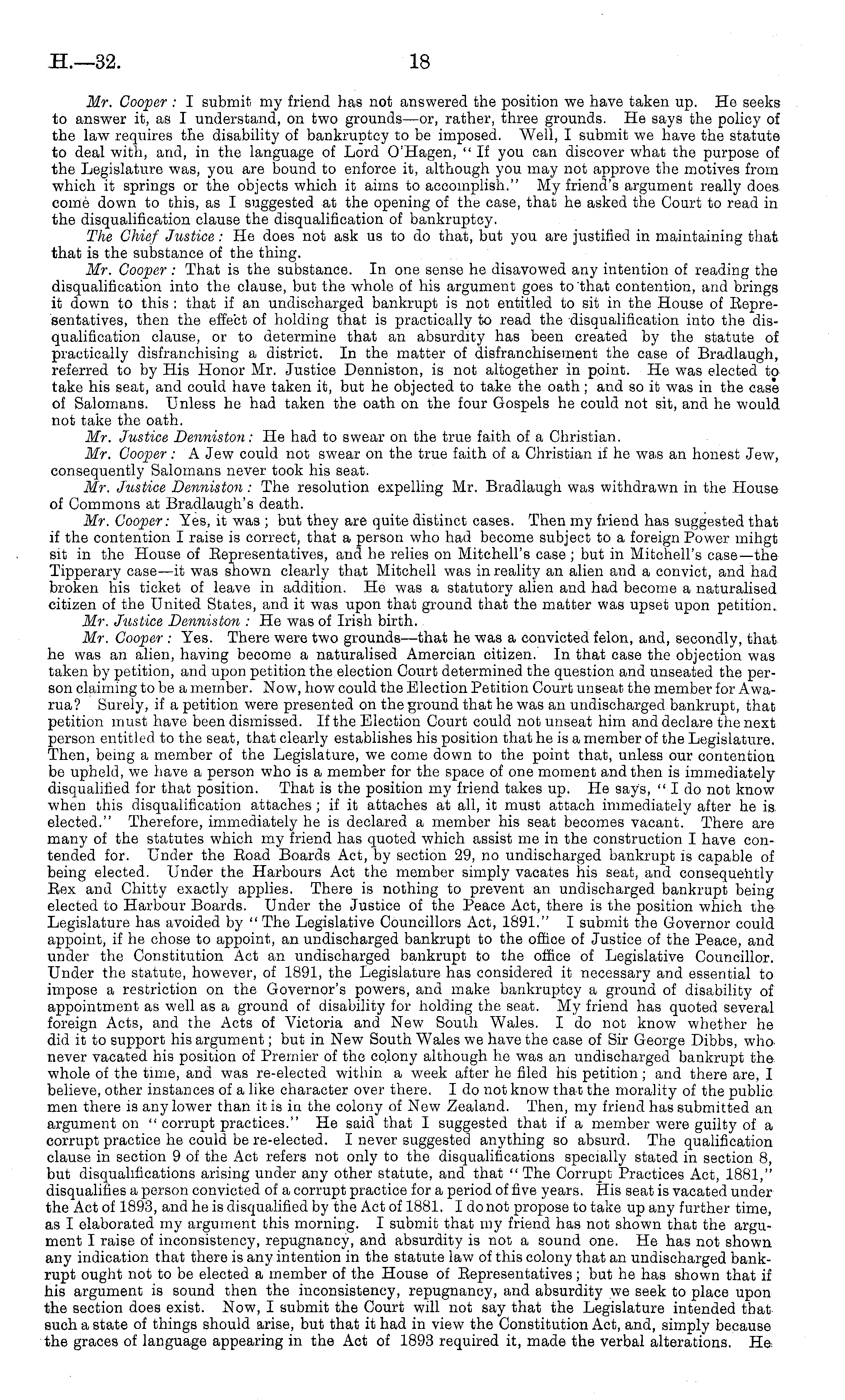 Mr. Cooper : I submit my friend has not answered the position we have taken up. He seeks to answer it, as I understand, on two grounds—or, rather, three grounds. He says the policy of the law requires the disability of bankruptcy to be imposed. Well, I submit we have the statute to deal with, and, in the language of Lord O'Hagen, " If you can discover what the purpose of the Legislature was, you are bound to enforce it, although you may not approve the motives from which it springs or the objects which it aims to accomplish." My friend's argument really does come down to this, as I suggested at the opening of the case, that he asked the Court to read in the disqualification clause the disqualification of bankruptcy. The Chief Justice: He does not ask us to do that, but you are justified in maintaining that that is the substance of the thing. Mr. Cooper : That is the substance. In one sense he disavowed any intention of reading the disqualification into the clause, but the whole of his argument goes to'that contention, and brings it down to this : that if an undischarged bankrupt is not entitled to sit in the House of Representatives, then the effect of holding that is practically to read the disqualification into the disqualification clause, or to determine that an absurdity has been created by the statute of practically disfranchising a district. In the matter of disfranchisement the case of Bradlaugh, referred to by His Honor Mr. Justice Denniston, is not altogether in point. He was elected to take his seat, and could have taken it, but he objected to take the oath ; and so it was in the case of Salomans. Unless he had taken the oath on the four Gospels he could not sit, and he would not take the oath. Mr. Justice Denniston: He had to swear on the true faith of a Christian. Mr. Cooper: A Jew could not swear on the true faith of a Christian if he was an honest Jew, consequently Salomans never took his seat. Mr. Justice Denniston : The resolution expelling Mr. Bradlaugh was withdrawn in the House of Commons at Bradlaugh's death. Mr. Cooper: Yes, it was ; but they are quite distinct cases. Then my friend has suggested that if the contention I raise is correct, that a person who had become subject to a foreign Power niihgt sit in the House of Representatives, and he relies on Mitchell's case ; but in Mitchell's case —the Tipperary case —it was shown clearly that Mitchell was in reality an alien and a convict, and had broken his ticket of leave in addition. He was a statutory alien and had become a naturalised citizen of the United States, and it was upon that ground that the matter was upset upon petition. Mr. Justice Denniston : He was of Irish birth. Mr. Cooper: Yes. There were two grounds—that he was a convicted felon, and, secondly, that he was an alien, having become a naturalised Amercian citizen. In that case the objection was taken by petition, and upon petition the election Court determined the question and unseated the person claiming to be a member. Now, how could the Election Petition Court unseat the member for Awarua? Surely, if a petition were presented on the ground that he was an undischarged bankrupt, that petition must have been dismissed. If the Election Court could not unseat him and declare the next person entitled to the seat, that clearly establishes his position that he is a member of the Legislature. Then, being a member of the Legislature, we come down to the point that, unless our contention be uphold, we have a person who is a member for the space of one moment and then is immediately disqualified for that position. That is the position my friend takes up. He says, "I do not know when this disqualification attaches ; if it attaches at all, it must attach immediately after he is elected." Therefore, immediately he is declared a member his seat becomes vacant. There are many of the statutes which my friend has quoted which assist me in the construction I have contended for. Under the Road Boards Act, by section 29, no undischarged bankrupt is capable of being elected. Under the Flarbours Act the member simply vacates his seat, and consequently Rex and Chitty exactly applies. There is nothing to prevent an undischarged bankrupt being elected to Harbour Boards. Under the Justice of the Peace Act, there is the position which the Legislature has avoided by " The Legislative Councillors Act, 1891." I submit the Governor could appoint, if he chose to appoint, an undischarged bankrupt to the office of Justice of the Peace, and under the Constitution Act an undischarged bankrupt to the office of Legislative Councillor. Under the statute, however, of 1891, the Legislature has considered it necessary and essential to impose a restriction on the Governor's powers, and make bankruptcy a ground of disability of appointment as well as a ground of disability for holding the seat. My friend has quoted several foreign Acts, and the Acts of Victoria and New South Wales. I do not know whether he did it to support his argument; but in New South Wales we have the case of Sir George Dibbs, who< never vacated his position of Premier of the colony although he was an undischarged bankrupt the whole of the time, and was re-elected within a week after he filed his petition ; and there are, I believe, other instances of a like character over there. Ido not know that the morality of the public men there is any lower than it is in the colony of New Zealand. Then, my friend has submitted an argument on " corrupt practices." He said that I suggested that if a member were guilty of a corrupt practice he could be re-elected. I never suggested anything so absurd. The qualification clause in section 9 of the Act refers not only to the disqualifications specially stated in section 8, but disqualifications arising under any other statute, and that " The Corrupt Practices Act, 1881," disqualifies a person convicted of a corrupt practice for a period of five years. His seat is vacated under the