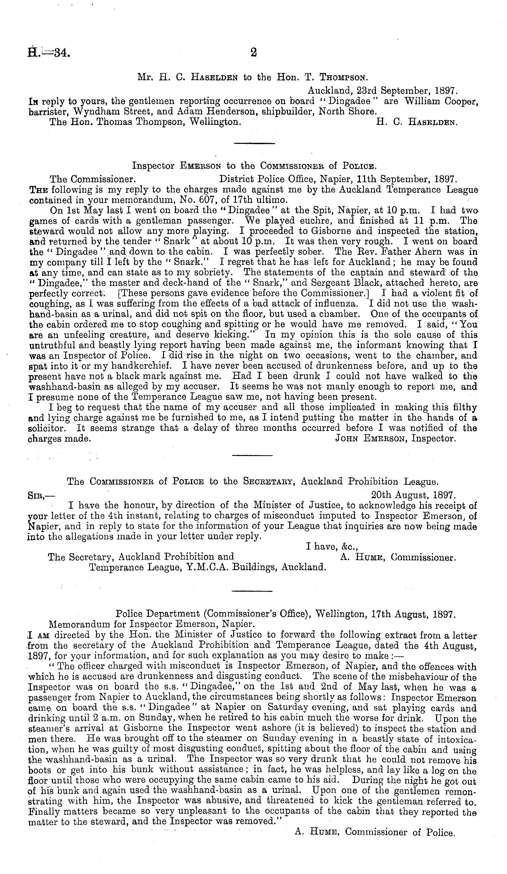 Police Department (Commissioner's Office), Wellington, 17th August, 1897. Memorandum for Inspector Emerson, Napier. I am directed by the Hon. the Minister of Justice to forward the following extract from a letter from the secretary of the Auckland Prohibition and Temperance League, dated the 4th August, 1897, for your information, and for such explanation as you may desire to make :— " The officer charged with misconduct is Inspector Emerson, of Napier, and the offences with which he is accused are drunkenness and disgusting conduct. The scene of the misbehaviour of the Inspector was on board the s.s. " Dingadee," on the Ist and 2nd of May last, when he was a passenger from Napier to Auckland, the circumstances being shortly as follows: Inspector Emerson came on board the s.s. "Dingadee" at Napier on Saturday evening, and sat playing cards and drinking until 2 a.m. on Sunday, when he retired to his cabin much the worse for drink. Upon the steamer's arrival at Gisborne the Inspector went ashore (it is believed) to inspect the station and men there. He was brought off to the steamer on Sunday evening in a beastly state of intoxication, when he was guilty of most disgusting conduct, spitting about the floor of the cabin and using the washhand-basin as a urinal. The Inspector was so very drunk that he could not remove his boots or get into his bunk without assistance; in fact, he was helpless, and lay like a log on the floor until those who were occupying the same cabin came to his aid. During the night he got out of his bunk and again used the washhand-basin as a urinal. Upon one of the gentlemen remonstrating with him, the Inspector was abusive, and threatened to kick the gentleman referred to. Finally matters became so very unpleasant to the occupants of the cabin that they reported the matter to the steward, and the Inspector was removed." A. Hume, Commissioner of Police.