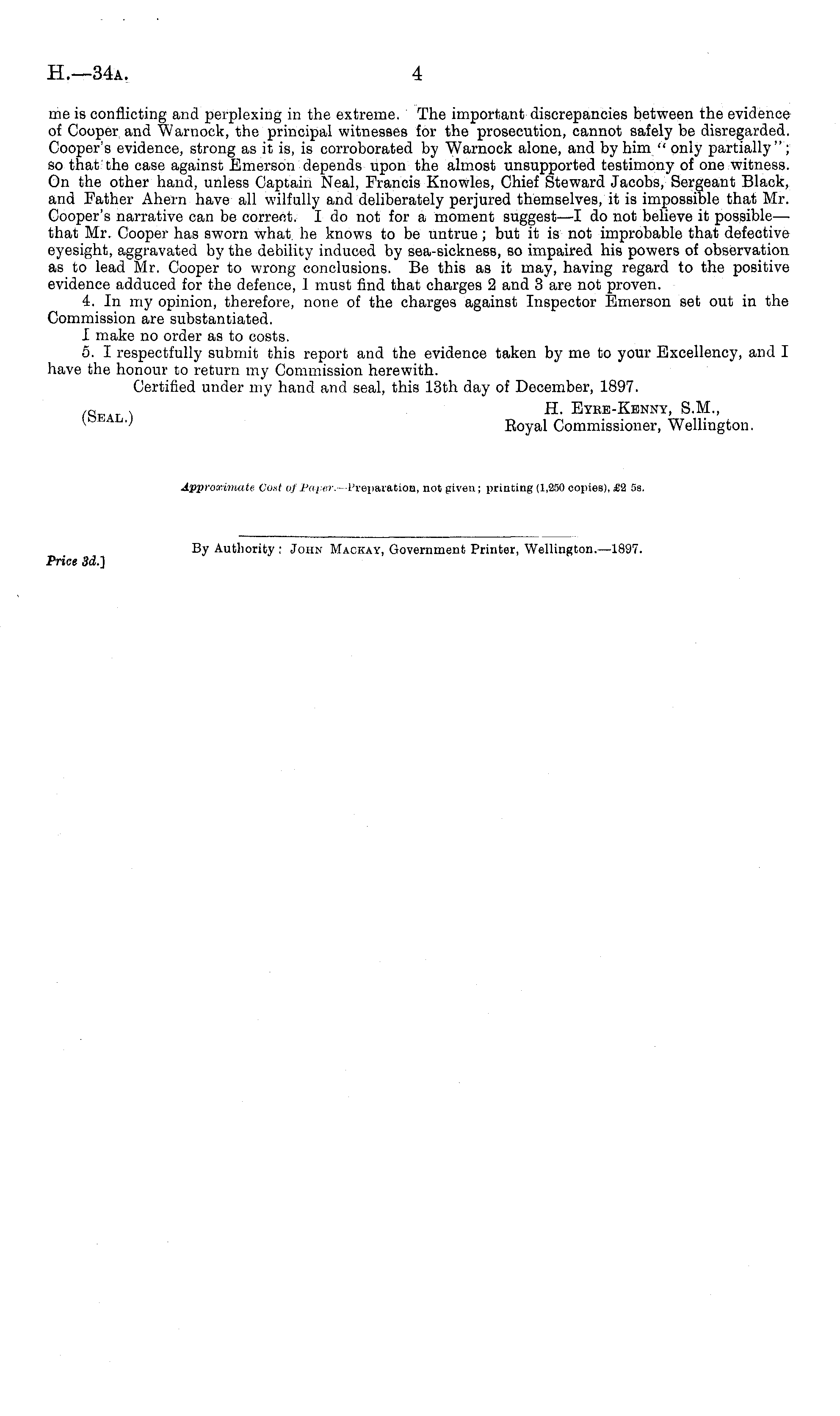me is conflicting and perplexing in the extreme. The important discrepancies between the evidence of Cooper and Warnock, the principal witnesses for the prosecution, cannot safely be disregarded. Cooper's evidence, strong as it is, is corroborated by Warnock alone, and by him " only partially"; so that the case against Emerson depends upon the almost unsupported testimony of one witness. Gn the other hand, unless Captain Neal, Francis Knowles, Chief Steward Jacobs, Sergeant Black, and Father Ahem have all wilfully and deliberately perjured themselves, it is impossible that Mr. Cooper's narrative can be correct. Ido not for a moment suggest—l do not believe it possible— that Mr. Cooper has sworn what he knows to be untrue; but it is not improbable that defective eyesight, aggravated by the debility induced by sea-sickness, so impaired his powers of observation as to lead Mr. Cooper to wrong conclusions. Be this as it may, having regard to the positive evidence adduced for the defence, 1 must find that charges 2 and 3 are not proven. 4. In my opinion, therefore, none of the charges against Inspector Emerson set out in the Commission are substantiated. I make no order as to costs. 5. I respectfully submit this report and the evidence taken by me to your Excellency, and I have the honour to return my Commission herewith. Certified under my hand and seal, this 13th day of December, 1897. /a s H. Eyeb-Kenny, S.M., *■ ' '' Eoyal Commissioner, Wellington. Approximate Cost of Pa/yer.— Preparation, not given; printing (1,250 copies), £ 2 ss.