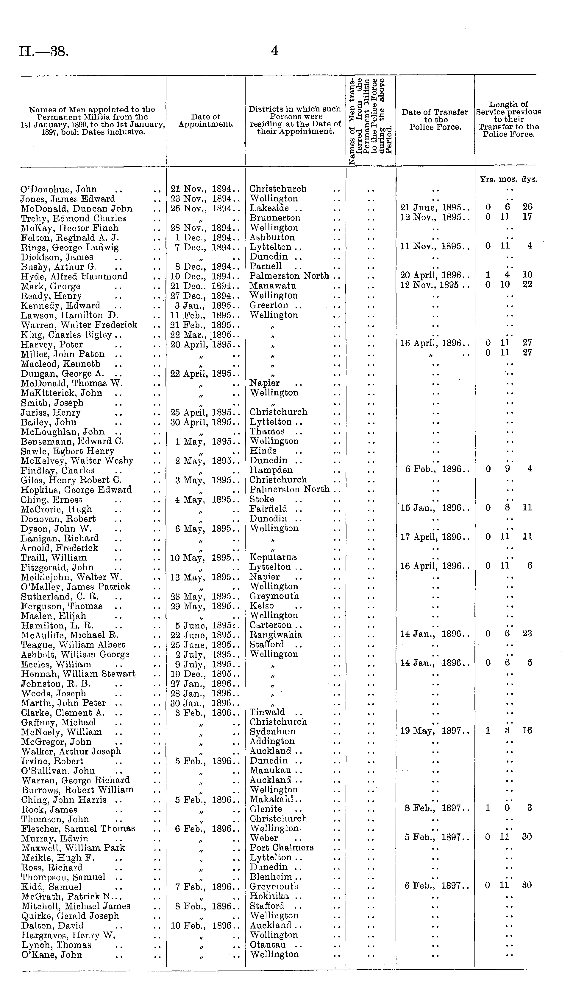Names of Moll appointed to the Permanent Militia from the .St January, 1H90, to the 1st January, 1897, both Dates inclusive. Date of Appointment. Districts in which such Persons were residing at the Date of their Appointment. Mi if I a pl 3P13-2 2 S3 Ph „» a.fl.s.2 fl<wO.«>3 Ph 3 fc Dato of Transfer to the Police Force. Length of Sorvice previous to their Transfer to the Police Force. Yrs. mos. dys. O'Donohue, John Jones, James Edward McDonald, Duncan John Trehy, Edmond Charles McKay, Hector Finch Felton, Reginald A. J. Rings, George Ludwig Dickison, James Busby, Arthur G. Hydo, Alfred Hammond Mark, George Ready, Henry Kennedy, Edward Lawson, Hamilton D. Warren, Waltor Fredorick King, Charles Bigley .. Harvey, Peter Miller, John Paton .. Macleod, Kenneth Dungan, George A. .. McDonald, Thomas W. McKitterick, John Smith, Joseph Juriss, Henry Bailey, John McLoughlan, John .. Bensemann, Edward 0. Sawle, Egbert Henry McKelvey, Walter Wesby Findlay, Charles Giles, Henry Robert C. Hopkins, Georgo Edward Ching, Ernest McCrorie, Hugh Donovan, Robert Dyson, John W. Lanigan, Richard Arnold, Fredorick Traill, William Fitzgerald, John Meiklejohn, Walter W. O'Malley, James Patrick Sutherland, C. R. Ferguson, Thomas Maslon, Elijah Hamilton, L. R. MoAuliffo, Michael R. Teaguo, William Albert Ashbolt, William George Eccles, William Hennah, William Stewart Johnston, R. B. Woods, Joseph Martin, John Peter .. Clarke, Clemont A. .. Gaffney, Michael MoNoely, William .. McGregor, John Walker, Arthur Joseph Irvine, Robert O'Sullivan, John Warren, Georgo Richard Burrows, Robert William Ching, John Harris .. Rock, James Thomson, John Fletcher, Samuel Thomas Murray, Edwin Maxwell, William Park Meikle, Hugh F. Ross, Richard Thompson, Samuel .. Kidd, Samuel McGrath, Patrick N... Mitchell, Michael James Quirko, Gerald Joseph Dalton, David Hargravos, Henry W. Lynch, Thomas O'Kane, John 21 Nov., 1894.. 23 Nov., 1894.. 26 Nov.. 1894.. 28 Nov., 1894.. 1 Dec, 1894.. 7 Dec, 1894.. Christchurch Wellington Lakeside Brunnerton Wollington Ashburton Lyttelton Dunedin Parnoll Palmerston North .. Manawatu Wellington Groerton Wellington 21 Juno, 1895.. 12 Nov., 1895.. 11 Nov., 1895.. 0 6 26 0 11 17 0 li' 4 8 Doc, 1894.. 10 Dec, 1894.. 21 Dec, 1894.. 27 Dec, 1894.. 3 Jan., 1895.. 11 Feb., 1895.. 21 Feb., 1895.. 22 Mar., 1895.. 20 April, 1895.. 20 April,' 1896.. 12 Nov., 1895 .. 1 i' 10 0 10 22 16 April, 1896.. 0 li 27 0 11 27 22 April, 1895.. Napier Wellington 25 April, 1895.. 30 April, 1895.. Christchurch Lyttelton Thames Wellington Hinds Dunedin Hampden Christchurch Palmorston North .. Stoke Fairfiold .. Dunedin Wellington 1 May, 1895.. 2 May, 1895.. 0 9 4 3 May, 1895" 6 Feb., 1896.. 4 May, 1895.. 0 8 11 15 Jan., 1896.. 6 May, 1895!! 17 April, 1896.. 0 li' 11 10 May, 1895.. 13 May, 1895.. 23 May, 1895.. 29 May, 1895.. Koputarua Lyttolton Napier Wellington Groymouth Kelso Wellington Carterton Rangiwahia Stafford Wellington 16 April, 1896.. 0 li 6 5 June, 1895:. 22 June, 1895.. 25 June, 1895.. 2 July, 1895.. 9 July, 1895.. 19 Dec, 1895.. 27 Jan., 1896.. 28 Jan., 1896.. 30 Jan., 1896.. 3 Feb., 1896.. 14 Jan., 1896.. 14 Jan., 1896.. 0 6 23 0 65 5 Feb'!, 1896!! 5 Feb'!, 1896!! 6 Feb'!, 1896.. Tinwald Christchurch Sydenham Addington Auckland Dunedin Manukau Auckland Wellington Makakahi Glonite Christchurch Wollington Weber Port Chalmers Lyttelton Dunedin Blonheim Greymouth Hokitika Stafford Wellington Auokl and Wellington Otautau Wellington 19 May',' 1897.. 8 Feb.',' 1897.. 1 3' 16 10 3 0 li' 30 5 Feb., 1897.. 7 Fob'!, 1896'.! 6 Feb.,'1897.. 0 11 30 8 Feb'!, 1896!! 10 Feb'!, 1896.!