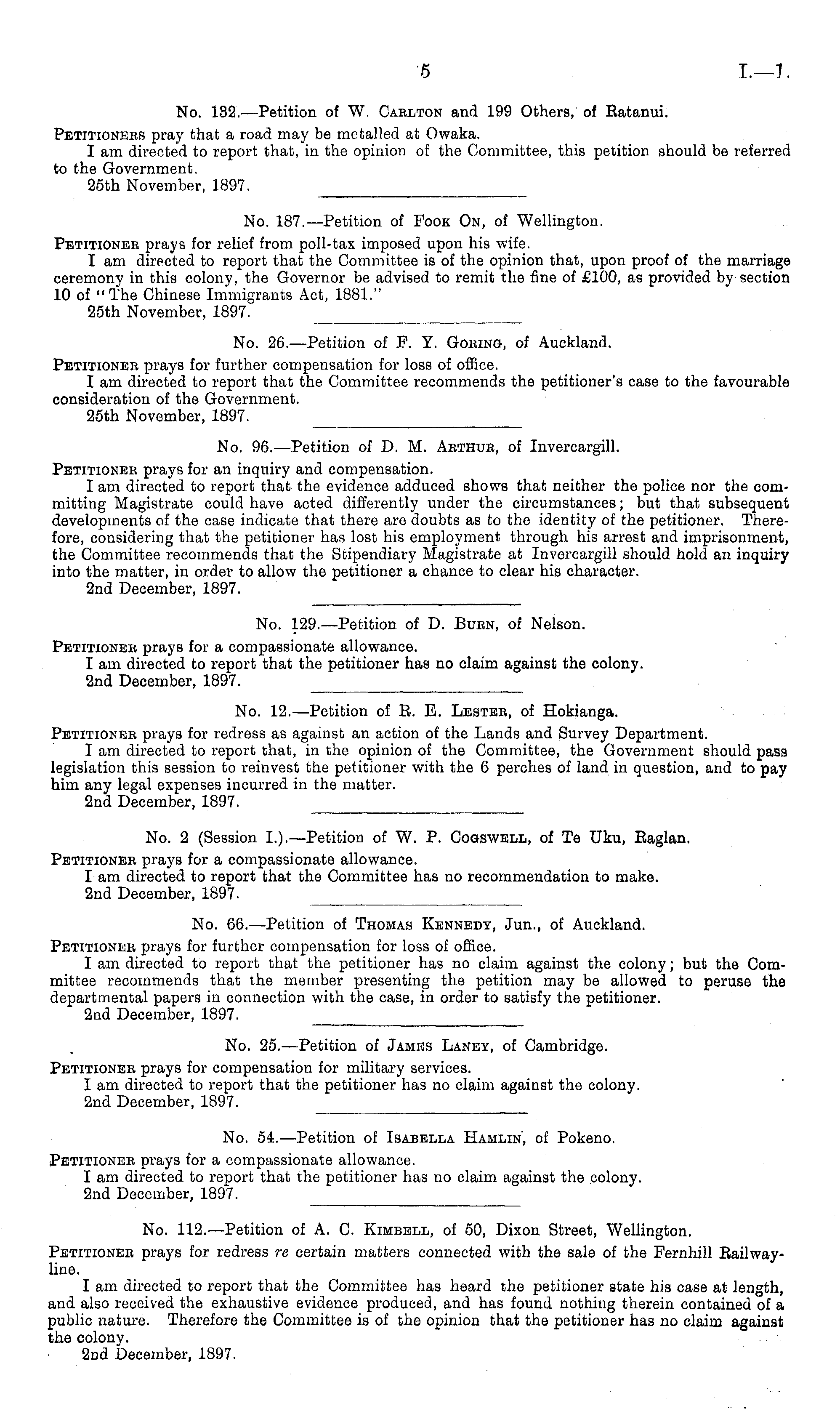 No. 26.—Petition of F. Y. Goring, of Auckland. Petitioner prays for further compensation for loss of office. I am directed to report that the Committee recommends the petitioner's case to the favourable consideration of the Government. 25th November, 1897.