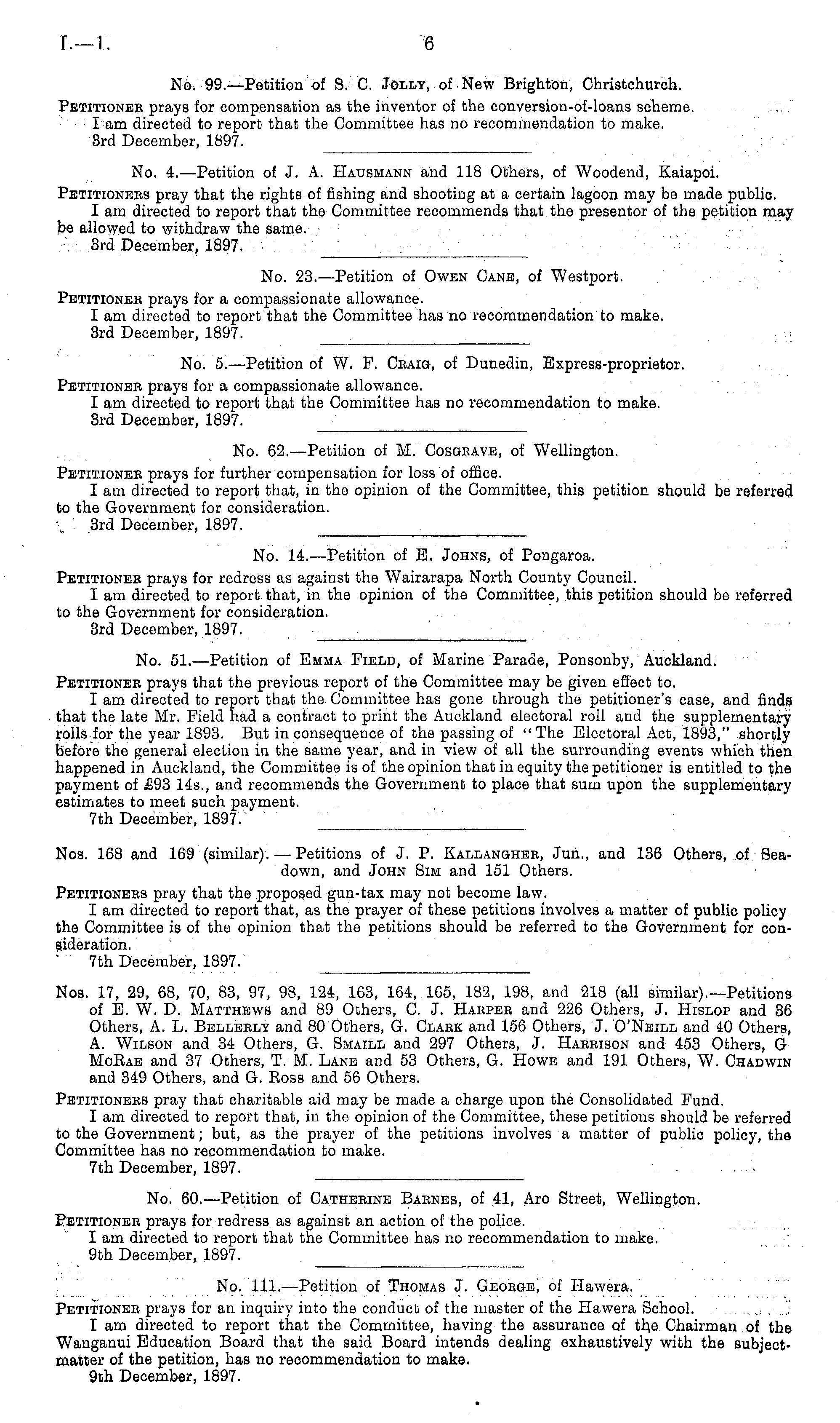 Nos. 17, 29, 68, 70, 83, 97, 98, 124, 163, 164, 165, 182, 198, and 218 (all similar).—Petitions of E. W. D. Matthews and 89 Others, C. J. Haepee and 226 Others, J. Hislop and 36 Others, A. L. Belleely and 80 Others, G. Clack and 156 Others, J. O'Neill and 40 Others, A. Wilson and 34 Others, G. Smaill and 297 Others, J. Haeeison and 453 Others, G McEae and 37 Others, T. M. Lane and 53 Others, G. Howe and 191 Others, W. Chadwin and 349 Others, and G. Eoss and 56 Others. Petitionees pray that charitable aid may be made a charge upon the Consolidated Fund. I am directed to report that, in the opinion of the Committee, these petitions should be referred to the Government; but, as the prayer of the petitions involves a matter of public policy, the Committee has no recommendation to make. 7th December, 1897.