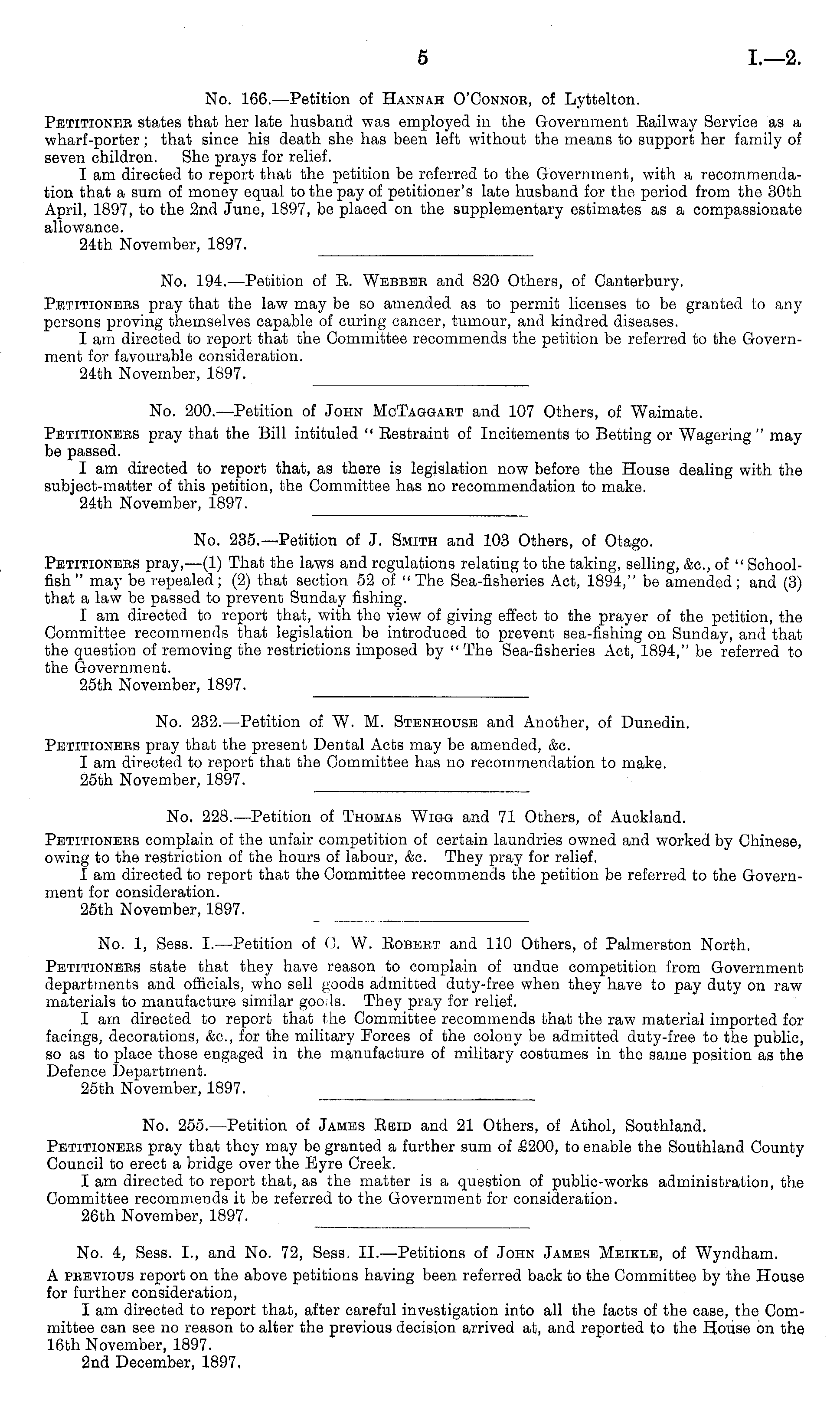 No. 166. —Petition of Hannah O'Connoe, of Lyttelton. Petitioner states that her late husband was employed in the Government Eailway Service as a wharf-porter; that since his death she has been left without the means to support her family of seven children. She prays for relief. I am directed to report that the petition be referred to the Government, with a recommendation that a sum of money equal to the pay of petitioner's late husband for the period from the 30th April, 1897, to the 2nd June, 1897, be placed on the supplementary estimates as a compassionate allowance. 24th November, 1897.