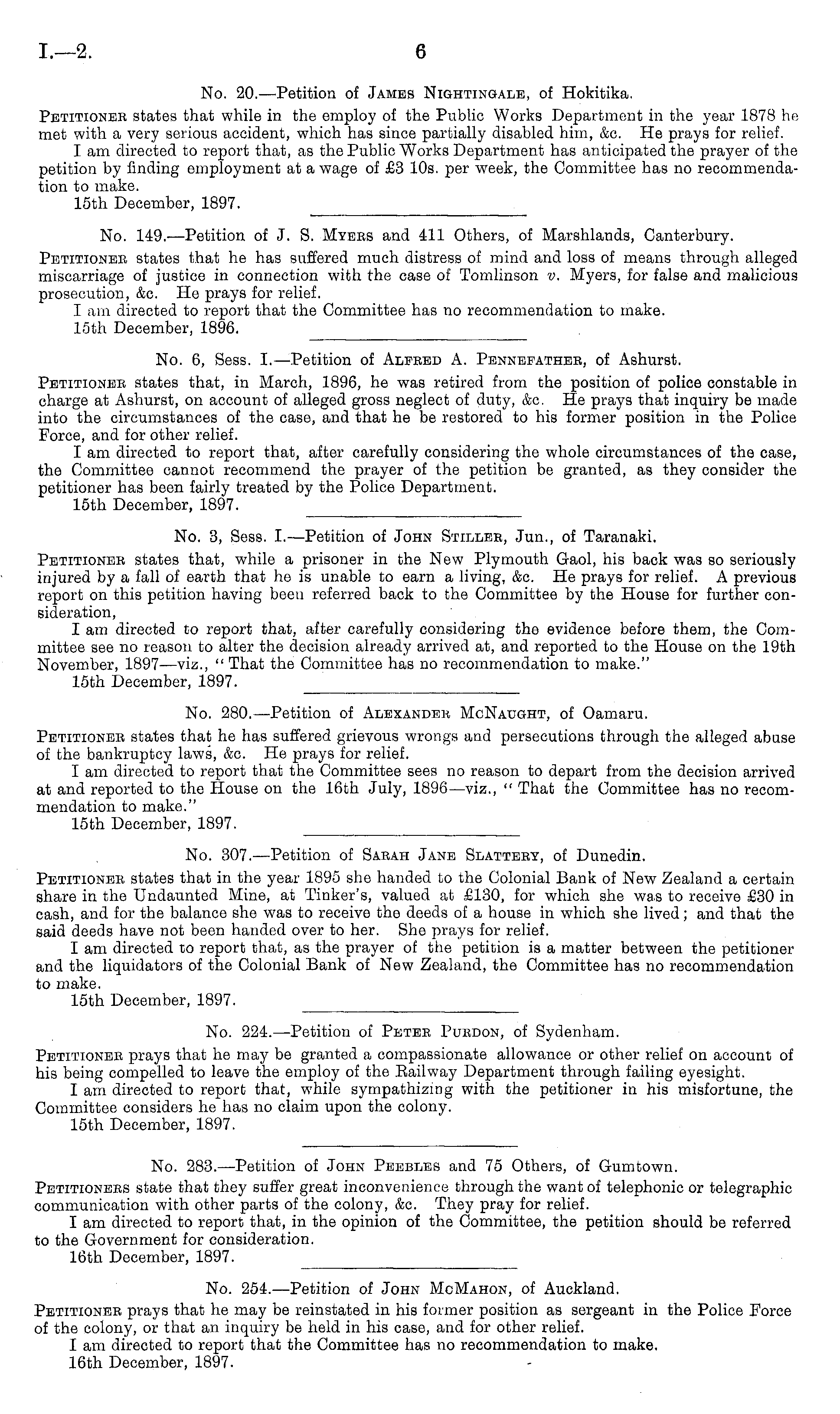 No. 20. —Petition of James Nightingale, of Hokitika. Petitioner states that while in the employ of the Public Works Department in the year 1878 he met with a very serious accident, which has since partially disabled him, &c. He prays for relief. I am directed to report that, as the Public Works Department has anticipated the prayer of the petition by finding employment at a wage of £3 10s. per week, the Committee has no recommendation to make. 15th December, 1897.