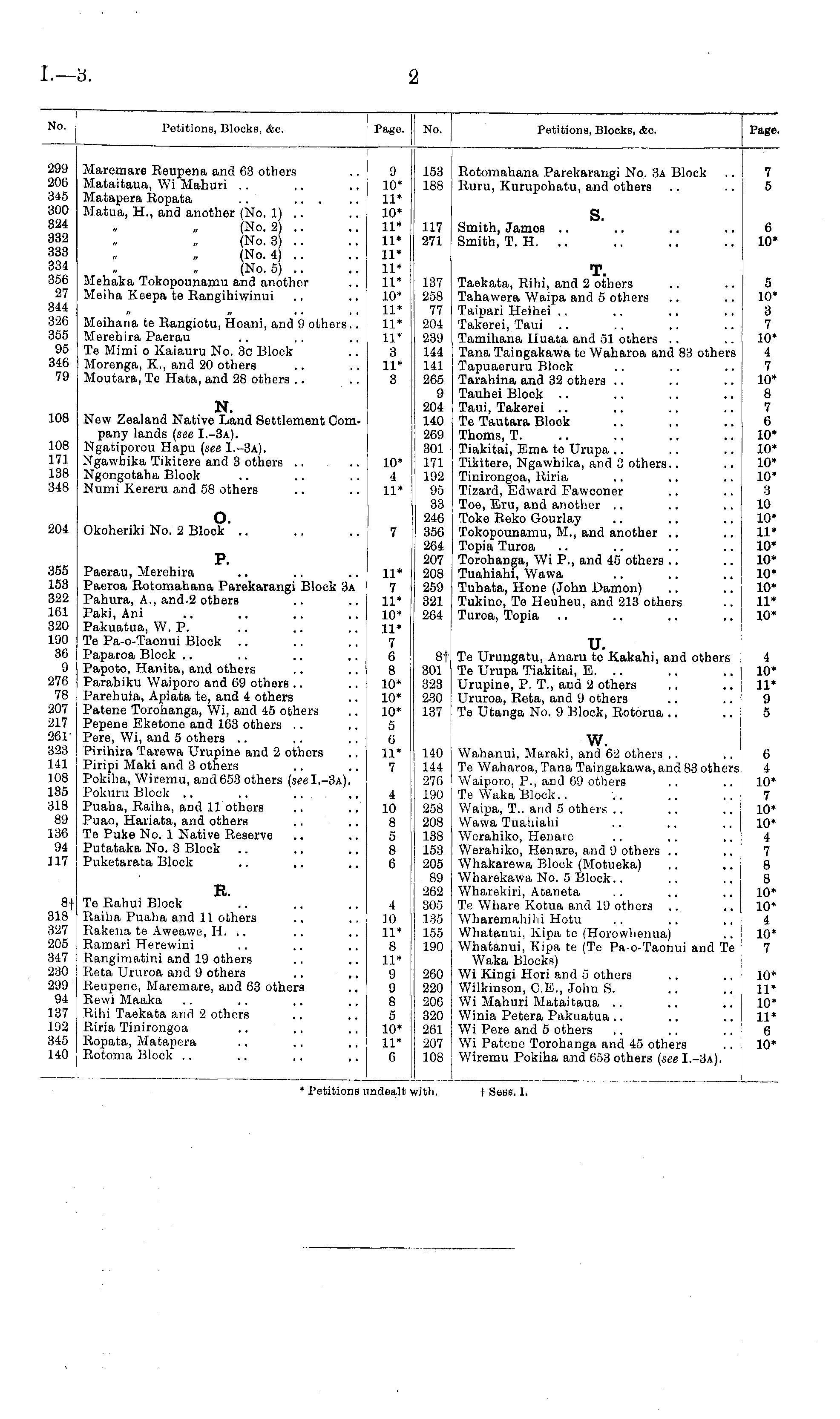 No. Petitions, Blocks, &c. Pago. No. Petitions, Blocks, &c. rage. 299 206 345 300 324 332 333 334 356 27 344 326 355 95 346 79 Maremare Reupena and 63 others Mataitaua, Wi Mahuri .. Matapera Ropata .. Matua, H., and another (No. 1) .. (No. 2) .. (No. 3) .. (No. 4) .. (No. 5) .. Mehaka Tokopounamu and another Meiha Keepa te Rangihiwinui 9 10* 11* 10* II , 11* 11* 11* 11* 10* 11* 11* 11* 3 11* 3 153 188 117 271 137 258 77 204 239 144 141 265 9 204 140 269 301 171 192 95 33 246 356 264 207 208 259 321 264 Rotomahana Parekarangi No. 3a Block Rum, Kurupohatu, and others Smith, James Smith, T. H. .. T. Taekata, Rihi, and 2 others Tahawera Waipa and 5 others Taipari Heihei Takerei, Taui Tamihana Huata and 51 others Tana Taingakawa to Waharoa and 83 others Tapuaeruru Block Tarahina and 32 others Tauhei Block Taui, Takerei .. Te Tautara Block Thorns, T. Tiakitai, Ema te Urupa Tikitere, Ngawhika, and 3 others.. Tinirongoa, Riria Tizard, Edward Pawconer Toe, Eru, and another Toke Reko Gourlay Tokopounamu, M., and another Topia Turoa Torohanga, Wi P., and 45 others .. Tuahiahi, Wawa Tuhata, Hone (John Damon) Tukino, To Heuheu, and 2]3 others Turoa, Topia 7 5 6 10' 5 10* 3 7 10* i 7 10* 8 7 6 10* 10* 10* 10* 3 10 10* 11* 10* 10* 10* 10* 11* 10* Meihana te Rangiotu, Hoani, and 9 others.. Merehira Paerau Te Mimi o Kaiauru No. 3c Block Morenga, K., and 20 others Moutara, Te Hata, and 28 others .. 108 108 171 138 348 N. New Zealand Native Land Settlement Company lands (see I.-3a). Ngatiporou Hapu (see I.-3a). Ngawhika Tikitere and 3 others Ngongotaha Block Numi Kereru and 58 others 10* 4 11* 204 o. Okoheriki No. 2 Block 7 355 153 322 161 320 190 36 9 276 78 207 217 261 323 141 108 135 318 89 136 94 117 P. 11* 7 11* 10* 11* 7 6 8 10* 10* 10* 5 6 11* 7 Paerau, Merohira Paeroa Rotomahana Parekarangi Block 3a Pahura, A., and-2 othors Paki, Ani Pakuatua, W. P. Te Pa-o-Taonui Block Paparoa Block Papoto, Hanita, and others Parahiku Waiporo and 69 others Parehuia, Apiata te, and 4 others Pateno Torohanga, Wi, and 45 others Pepene Bketone and 163 others Pere, Wi, and 5 others Pirihira Tarewa Urupine and 2 others Piripi Maki and 3 others Pokiha, Wiremu, and 653 others (see I. -3a). Pokuru Block .. .. ... Puaha, Raiha, and 11 others Puao, Hariata, and others Te Puke No. 1 Native Reserve Putataka No. 3 Block .. Pukctarata Block 8t 301 323 230 137 u. Te Urungatu, Anaru te Kakahi, and others Te Urupa Tiakitai, E. .. Urupine, P. T., and 2 others Ururoa, Reta, and 9 others Te Utanga No. 9 Block, Rotorua .. 4 10* 11* 9 5 8f 318 327 205 347 230 299 94 137 192 345 140 R. 4 10 8 5 8 6 4 10 11* 8 11* 9 9 8 5 10* 11* 6 140 144 276 190 258 208 138 153 205 89 262 305 135 155 190 w. Wahanui, Maraki, and 62 others .. Te Waharoa, Tana Taingakawa, and 83 others Waiporo, P., and 69 others Te Waka Block.. Waipa, T.. aiid 5 others Wawa Tuahiahi Werahiko, Henaie Werahiko, Henare, and 9 others Whakarewa Block (Motueka) Wharokawa No. 5 Block.. Wharekiri, Ataneta .. ,. ,. Tc Whare Kotua and 19 others Wharemahilii Hotu Whatanui, Kipa te (Horowhenua) Whatanui, Kipa te (Te Pa-o-Taonui and Te Waka Blocks) Wi Kingi Hori and 5 others Wilkinson, C.E., John S. Wi Mahuri Mataitaua .. Winia Petera Pakuatua Wi Pere and 5 others Wi Patcno Torohanga and 45 others Wiremu Pokiha and 653 others (see I.-3a). 6 4 10* 7 10* 10* 4 7 8 8 10* 10* 4 10* 7 Te Rahui Block Raiha Puaha and 11 others Rakena te Aweawe, H. .. Raraari Horewini Rangimatini and 19 others Reta Ururoa and 9 others Reupene, Maremare, and 63 others Rewi Maaka Rihi Taekata and 2 others Riria Tinirongoa Ropata, Matapera Rotonia Block 260 220 206 320 261 207 108 10* 11* 10* 11* 6 10* 'otitione uni leal